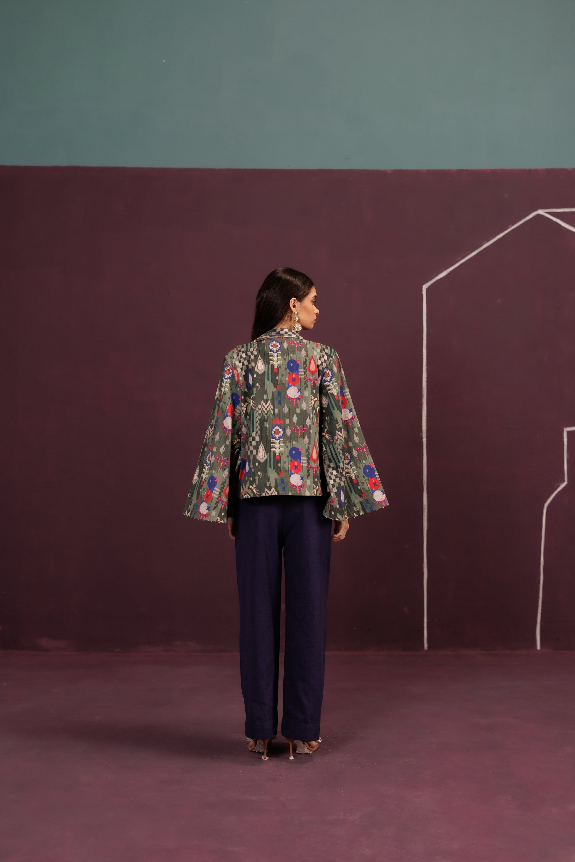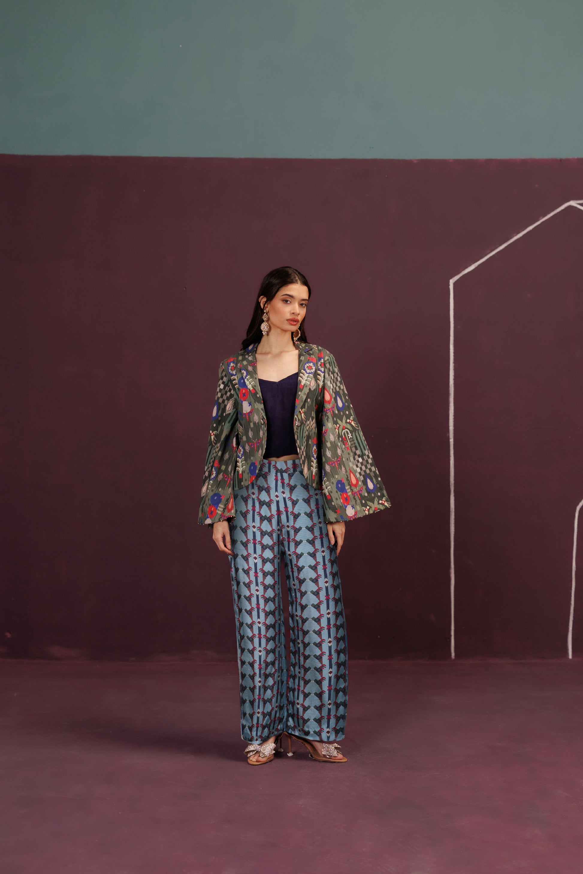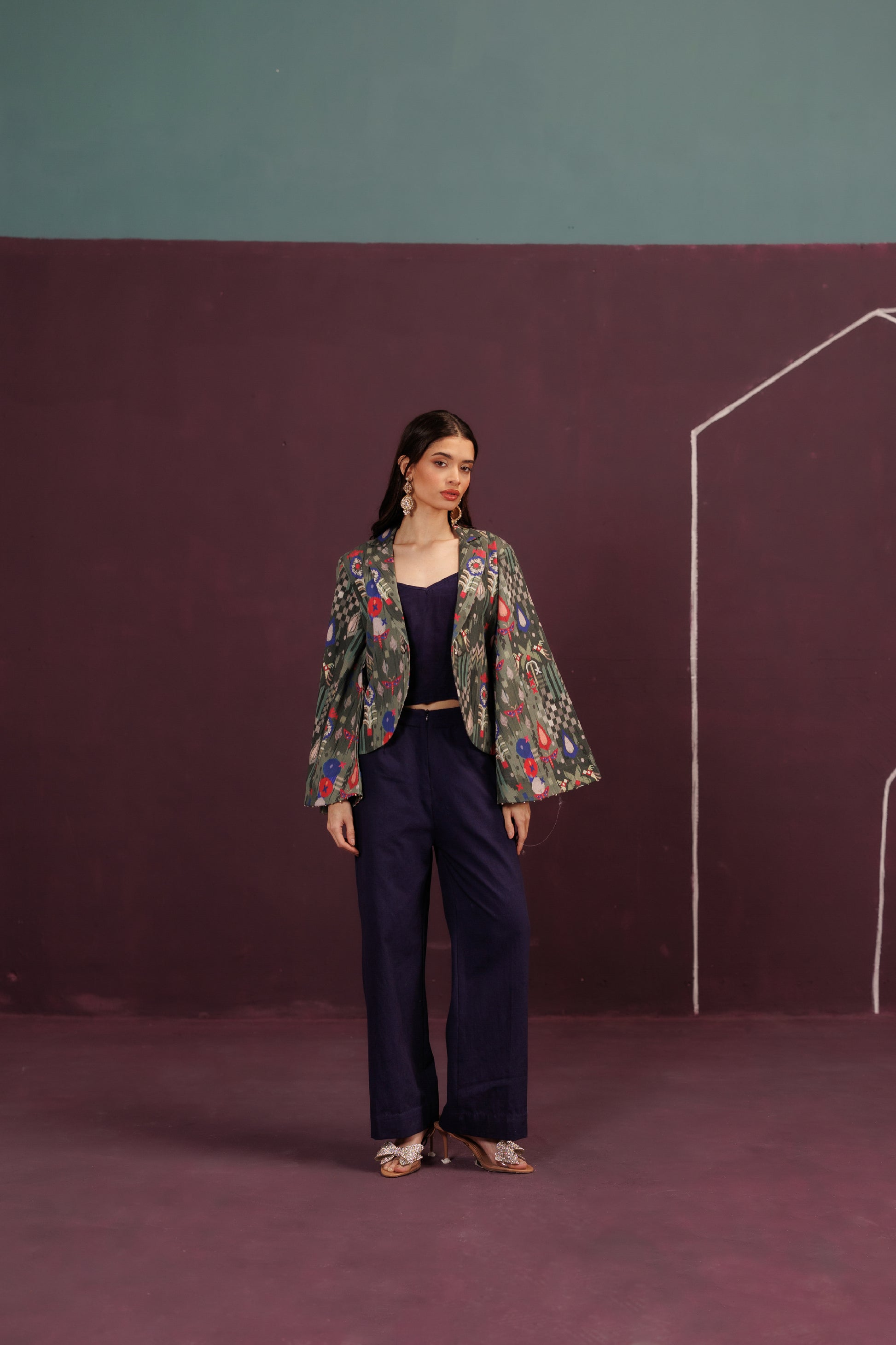 This blazer is the final, sharp word in any boardroom. With dramatic bell sleeves and a structured cut, it speaks of exotic travels and confident decisions. Paired with a blue Habutai silk slip and blue twill trousers, it becomes a powerful statement that needs no further signature.