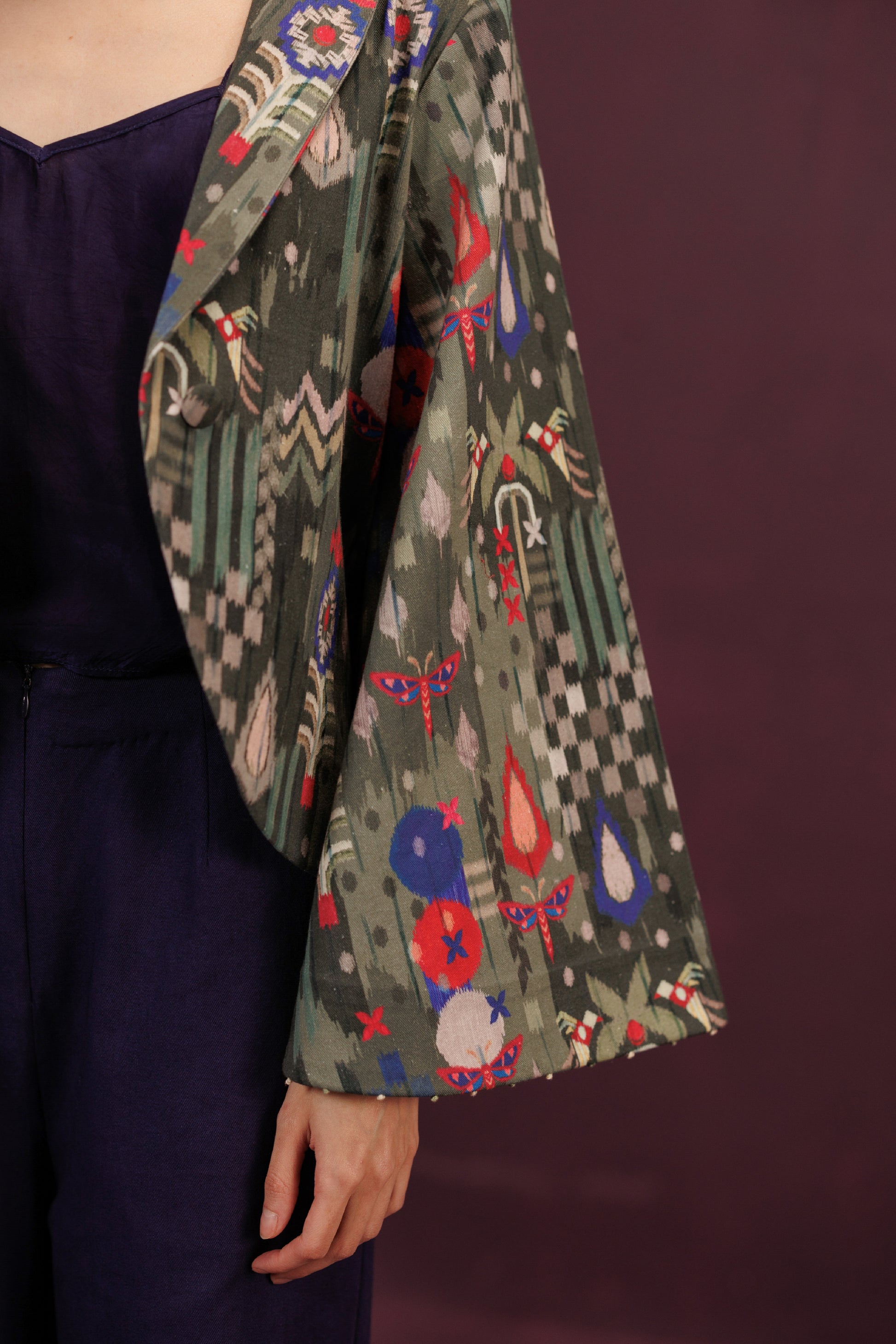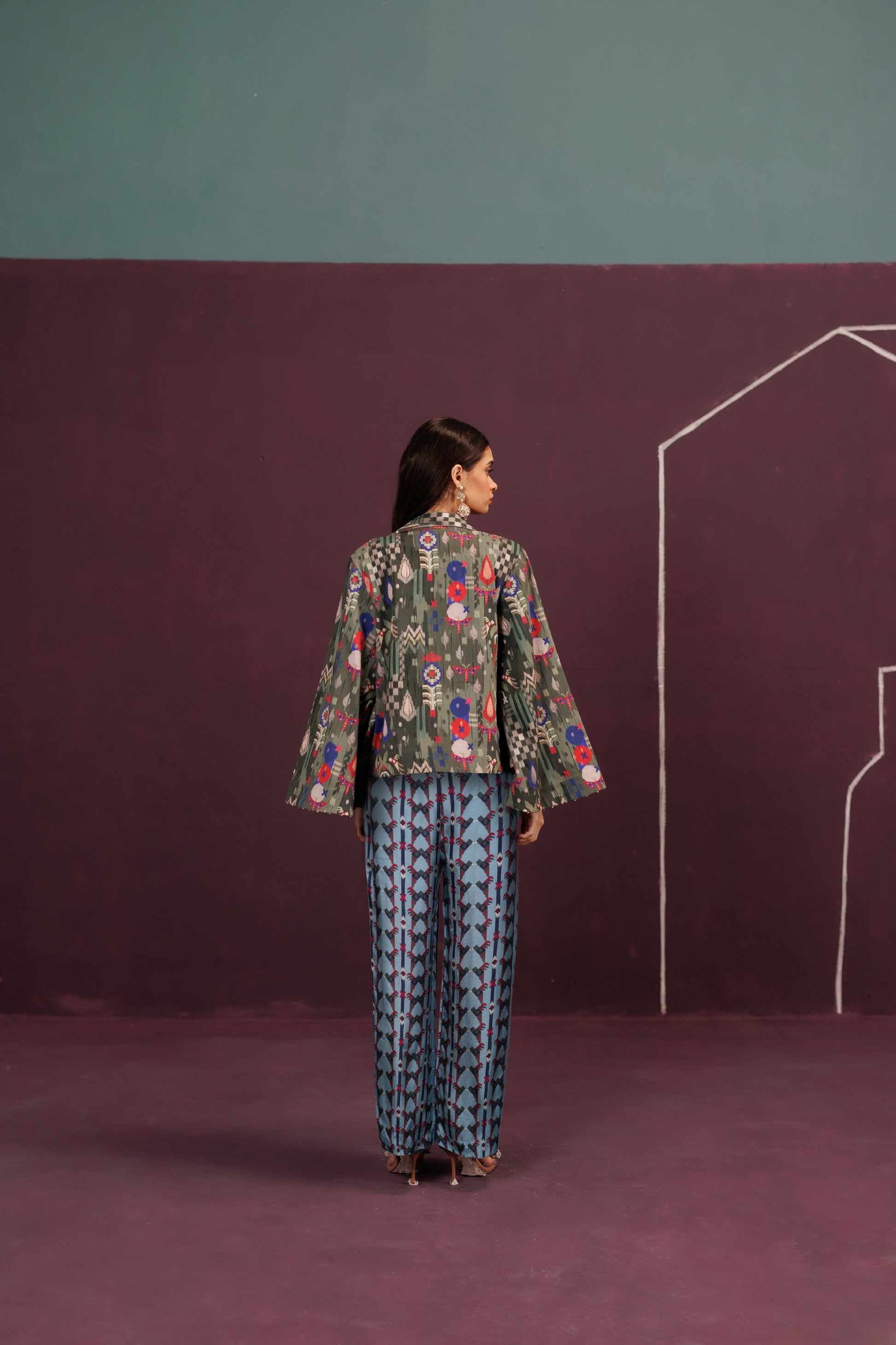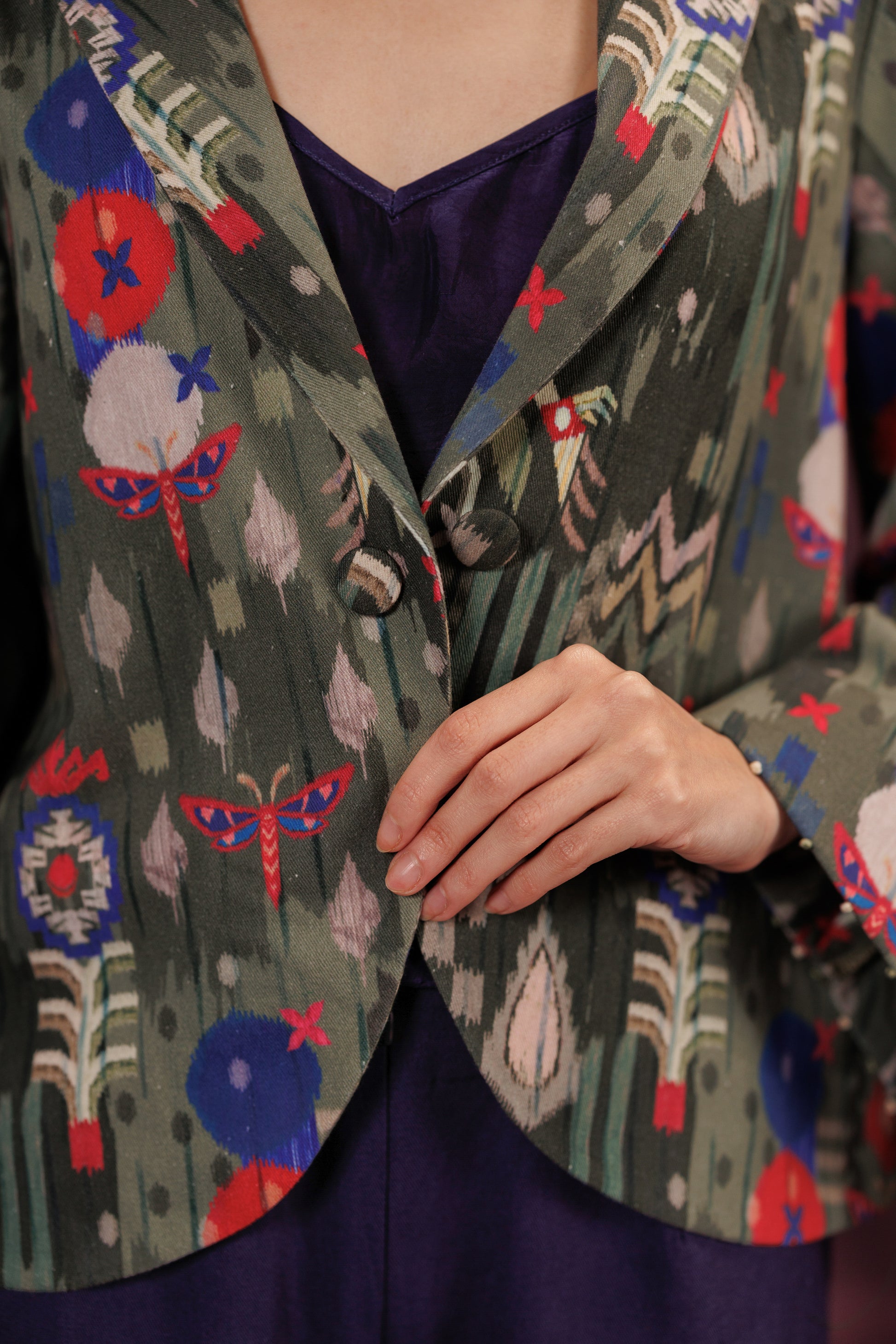 This blazer is the final, sharp word in any boardroom. With dramatic bell sleeves and a structured cut, it speaks of exotic travels and confident decisions. Paired with a blue Habutai silk slip and blue twill trousers, it becomes a powerful statement that needs no further signature.