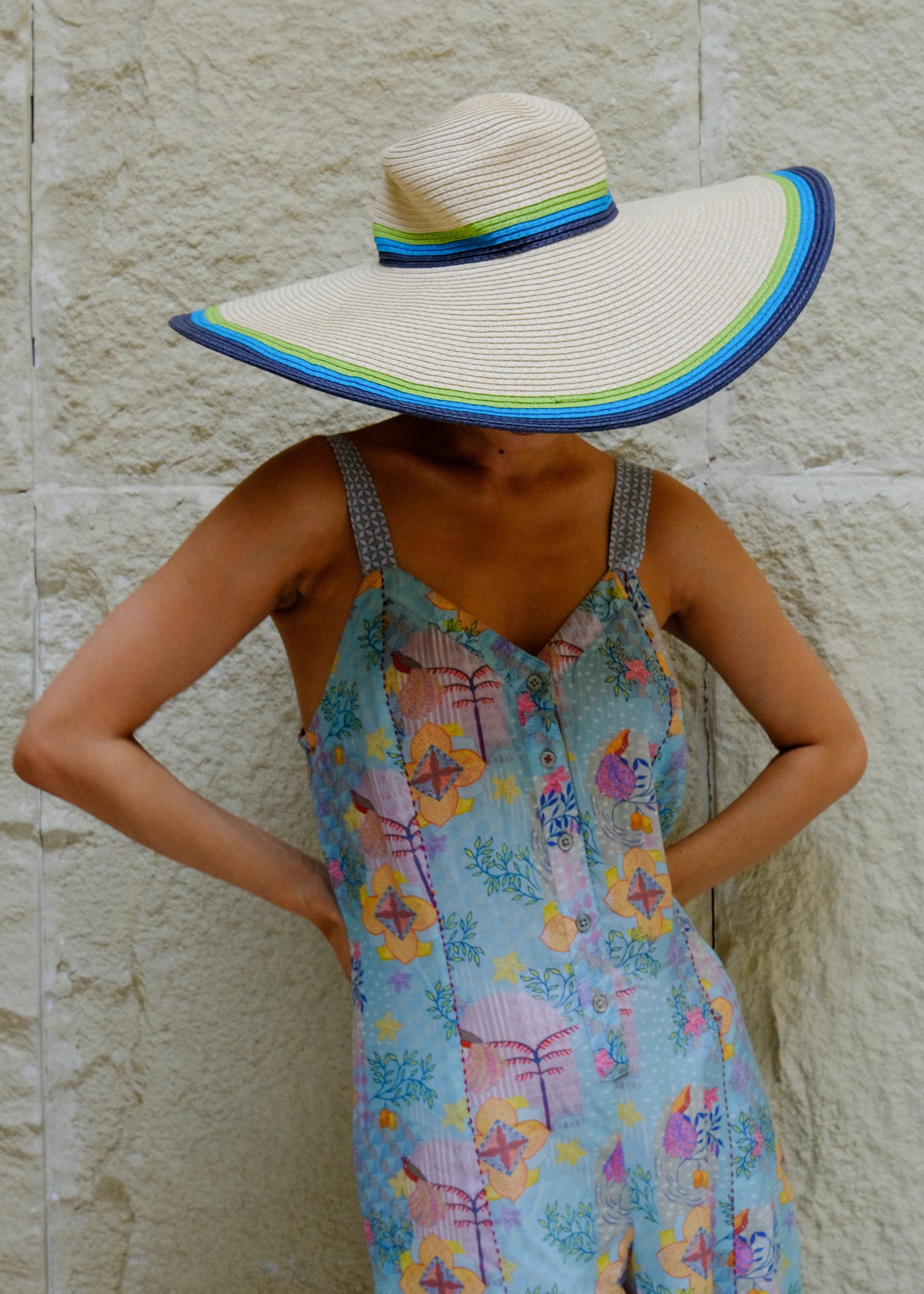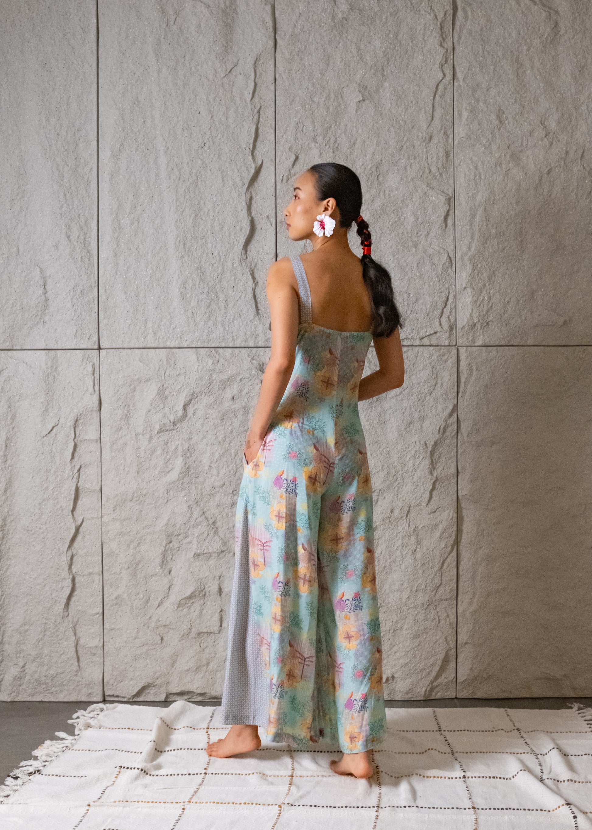 Drama meets playfulness in this statement wide-leg jumpsuit. Designed with a sleeveless, strappy silhouette featuring a flattering V-neckline, this jumpsuit exudes an unmistakable retro flair. Wide flared legs and a cross-back strap detail add a bold twist. Adorned with a Kantha-inspired floral print that spans across the body, this jumpsuit is a celebration of vibrant colors and intricate patterns.