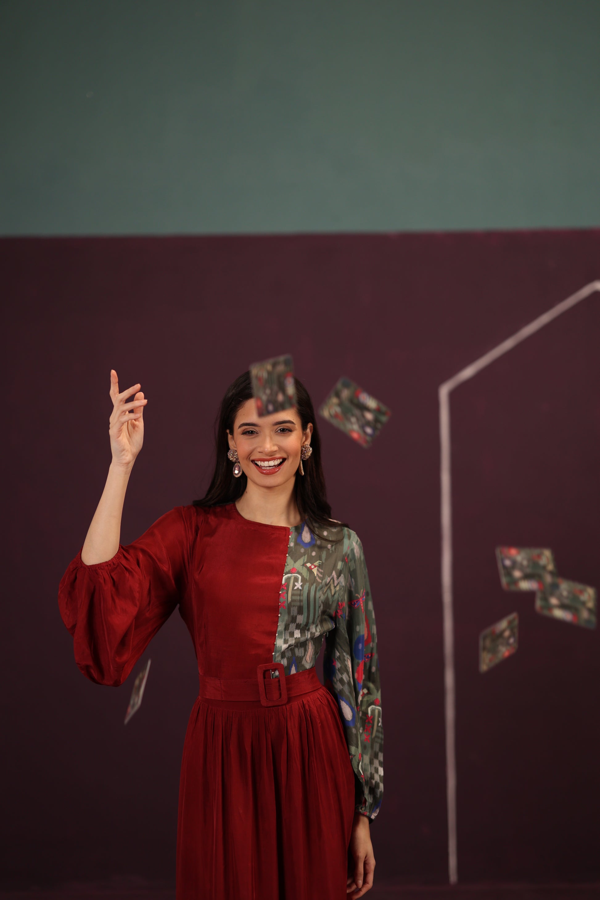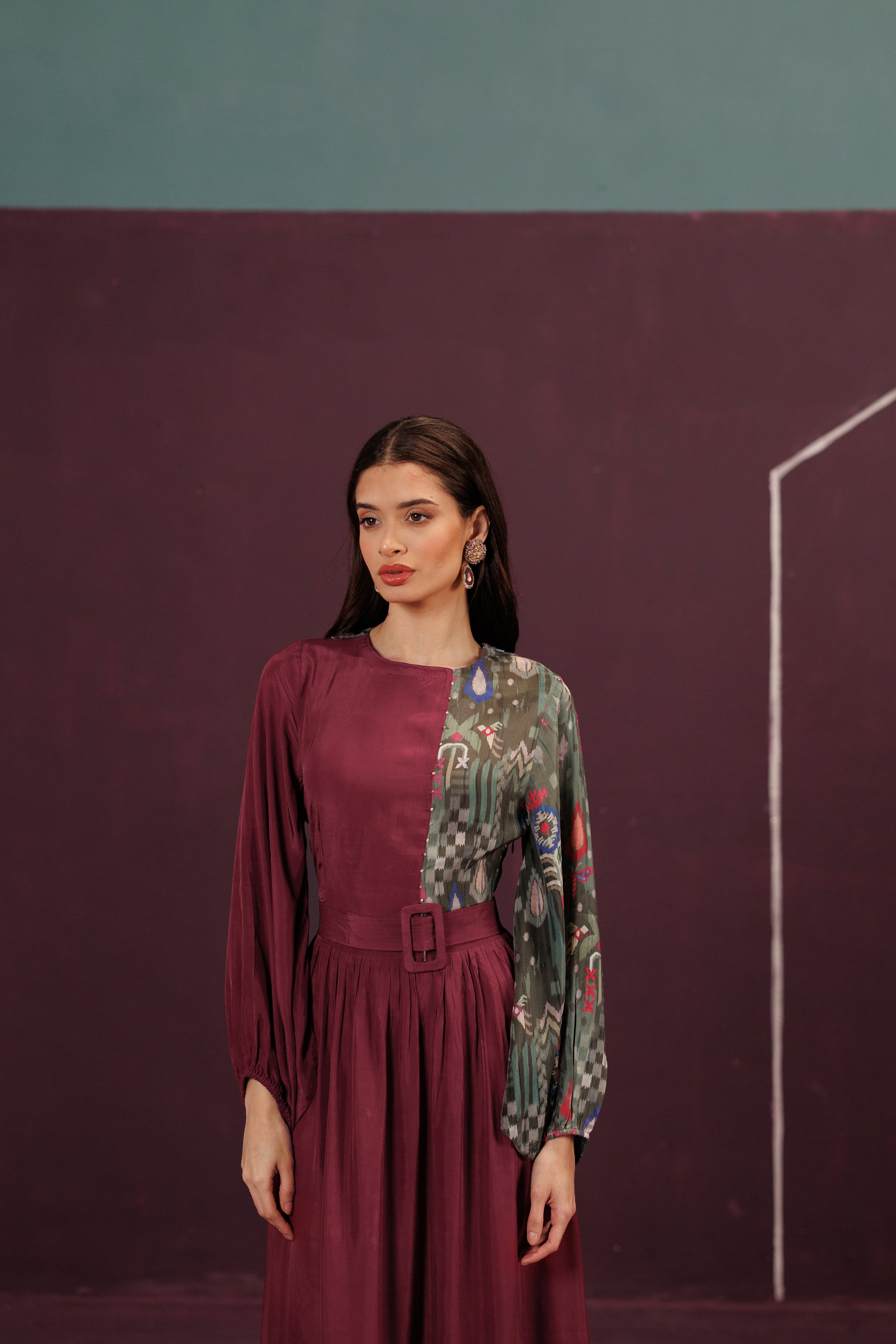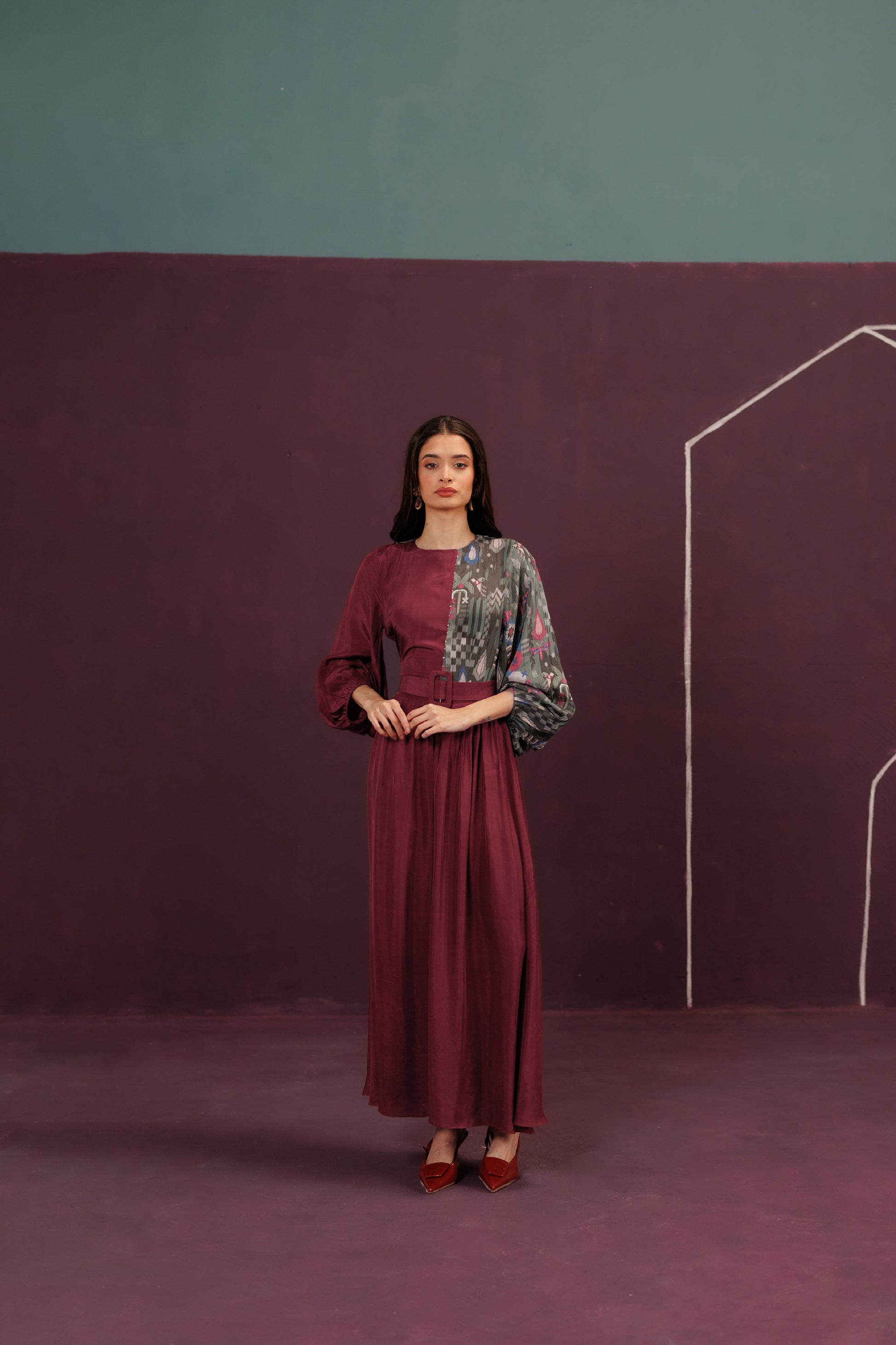 A flowing dress of pure Habutai Silk, where panel work creates a dramatic, backless sweep. It is a cinematic frame of an unforgettable moment, captured in rich, deep colour.