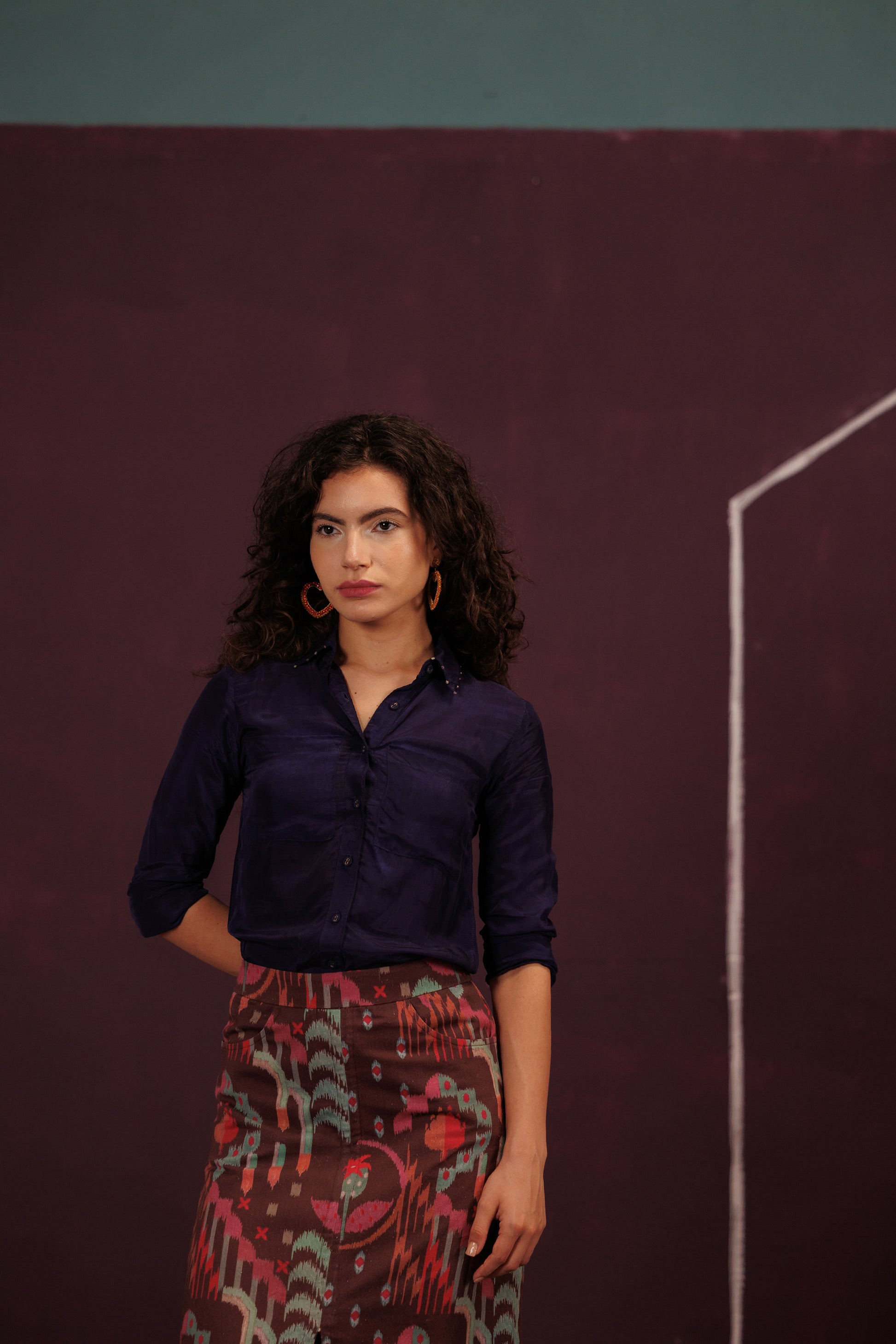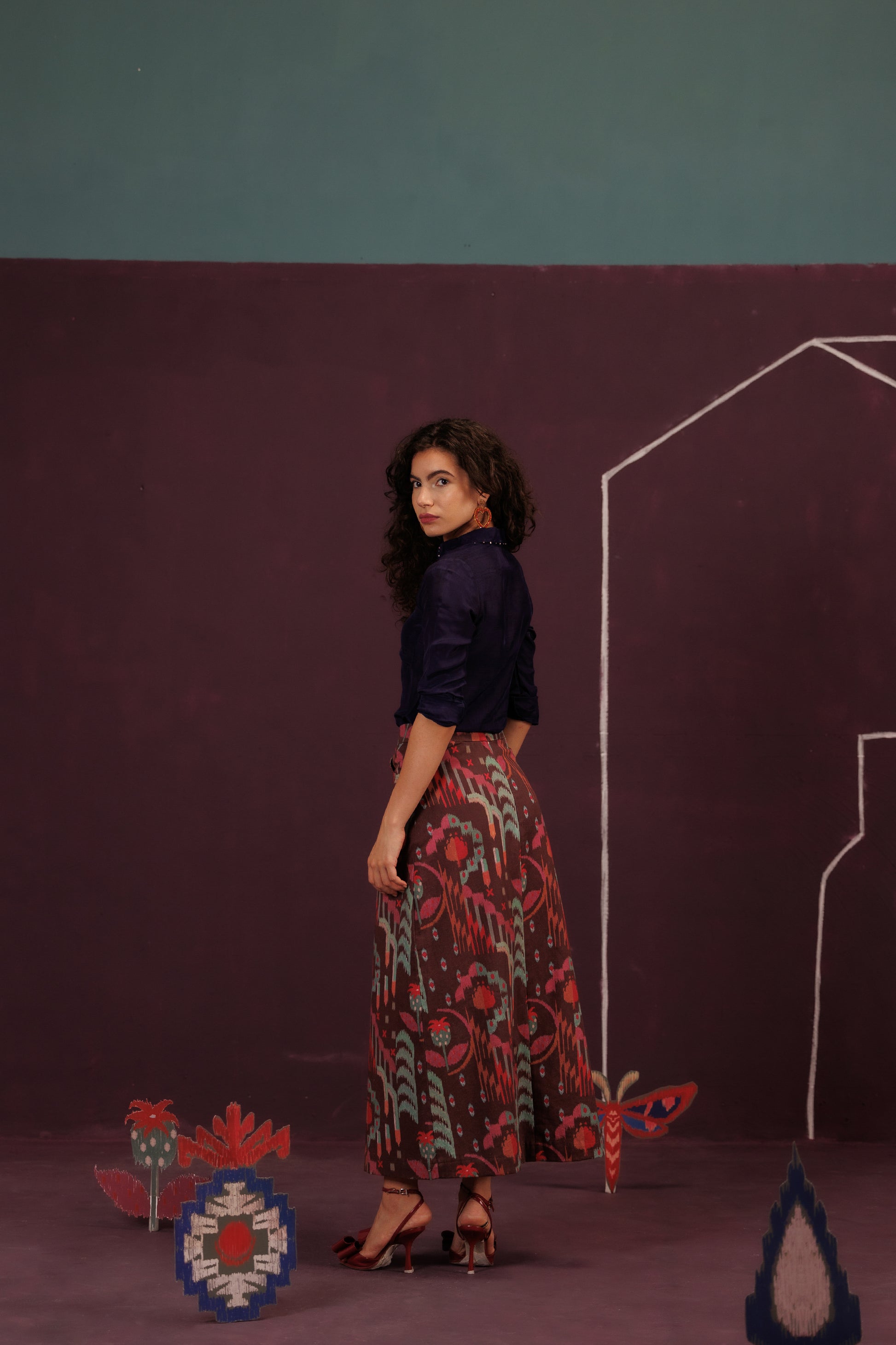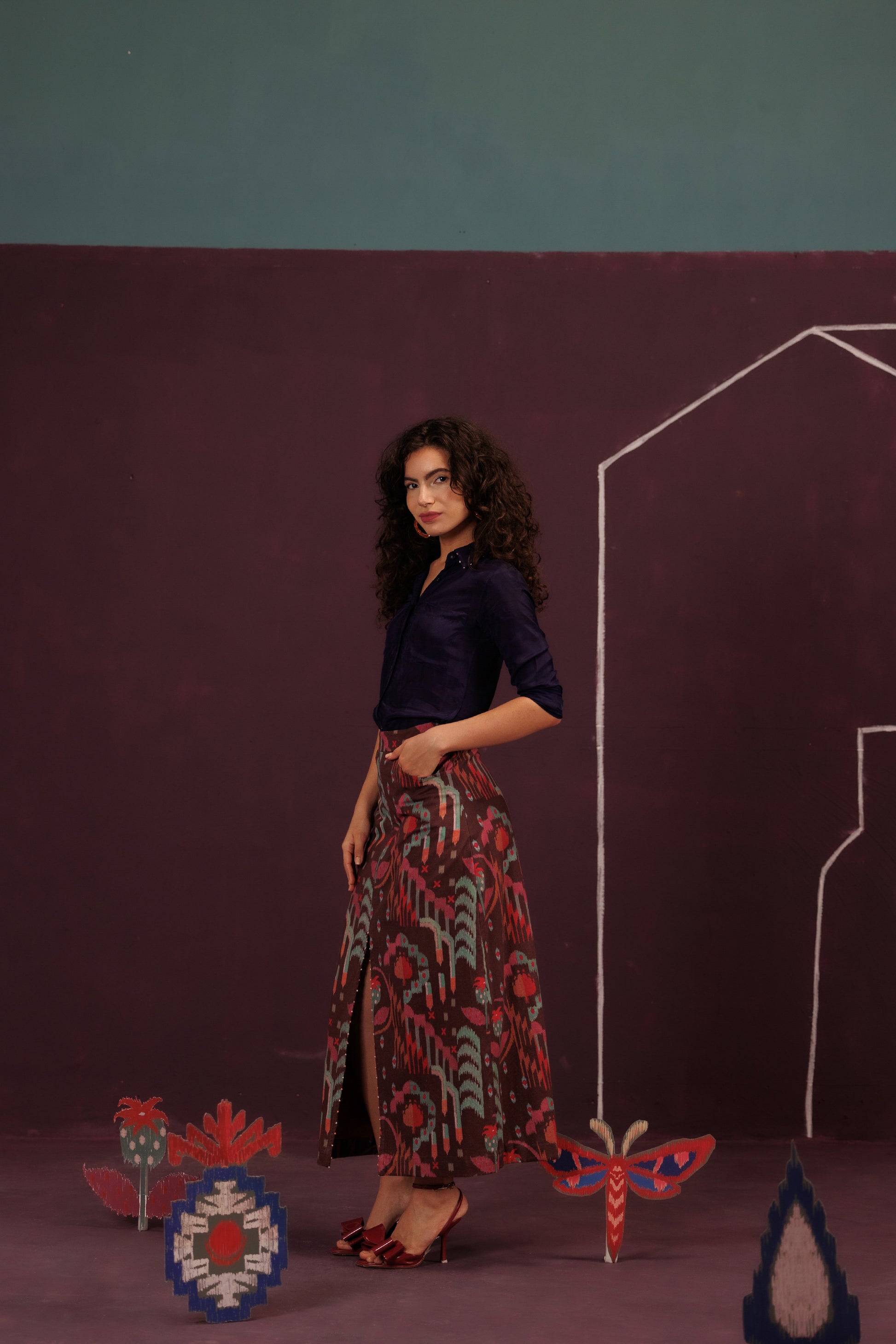 An exquisite co-ord where the Navy Silk top with French Knots lining the collar meets a Poppy Print skirt. The knotted detailing traces the lines of memory, culminating in the bold slit of the skirt that lines the fields of the past.