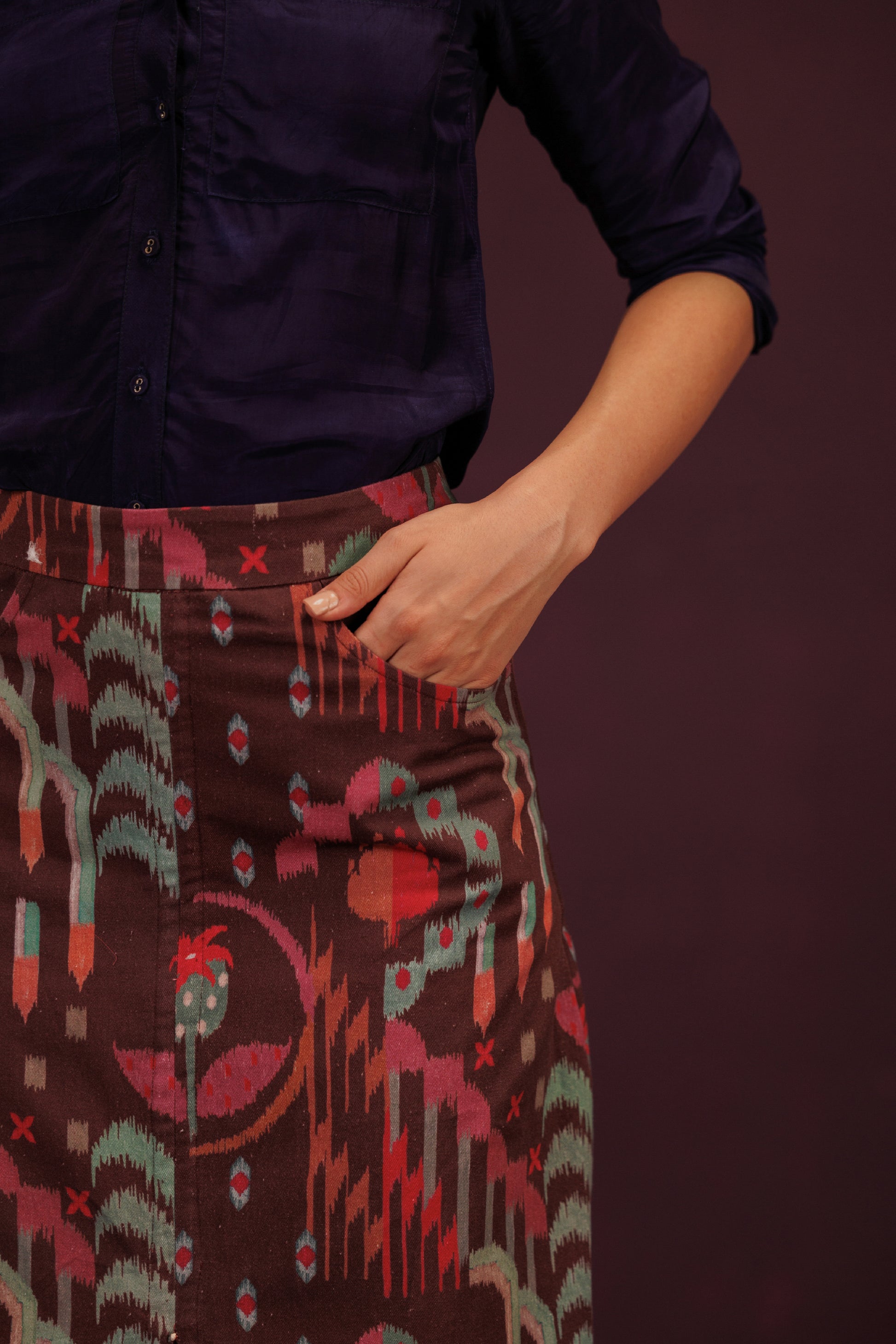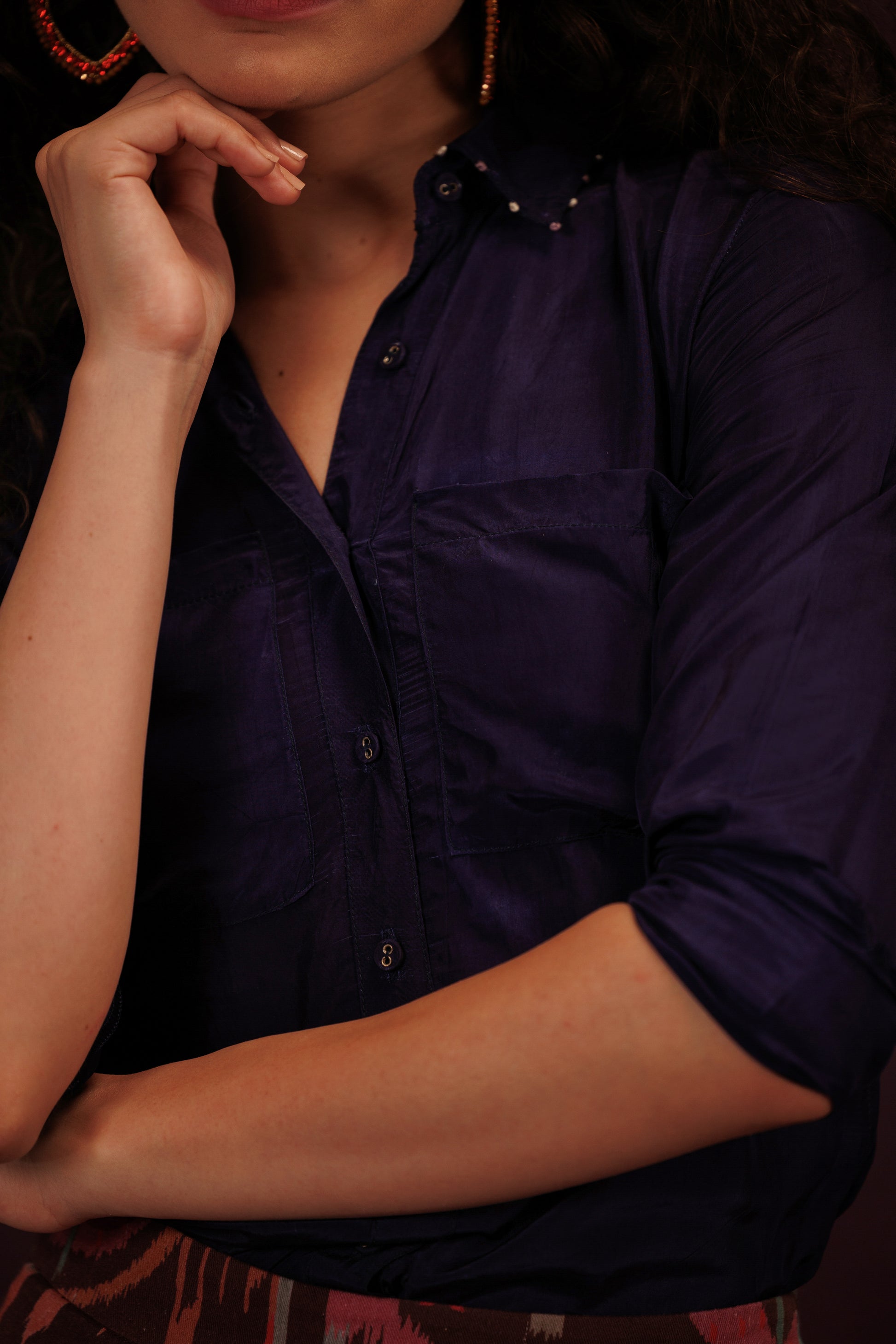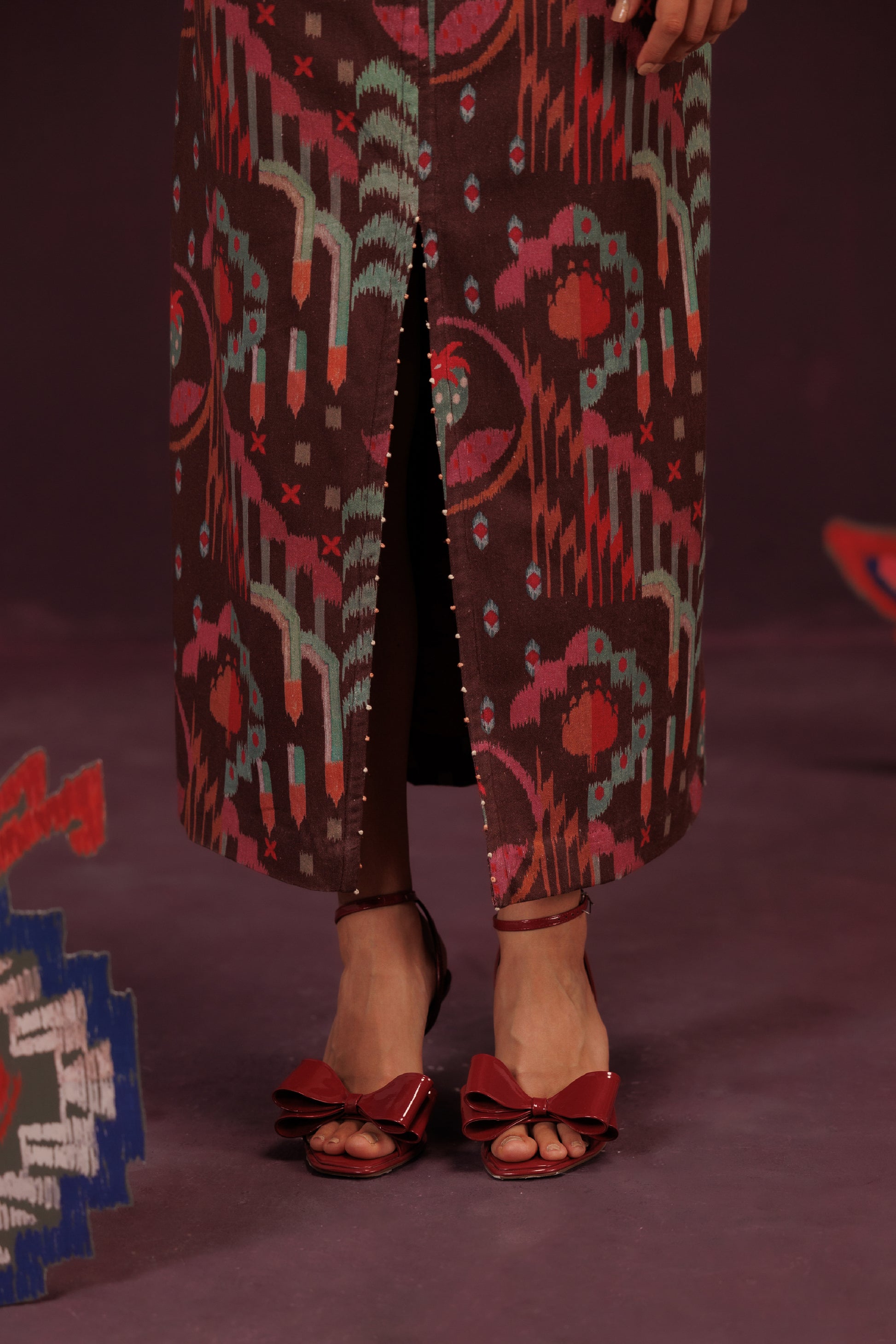 An exquisite co-ord where the Navy Silk top with French Knots lining the collar meets a Poppy Print skirt. The knotted detailing traces the lines of memory, culminating in the bold slit of the skirt that lines the fields of the past.