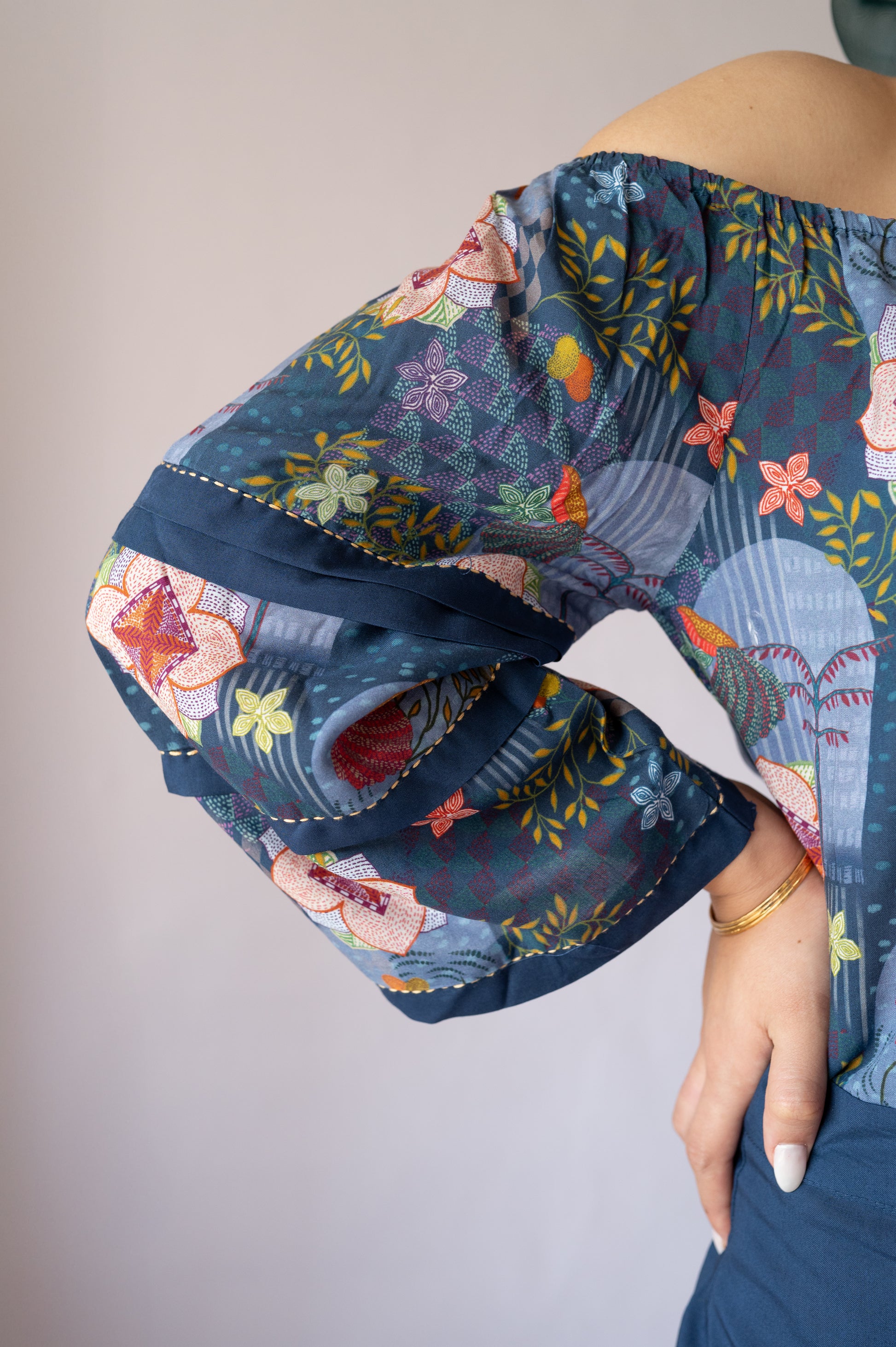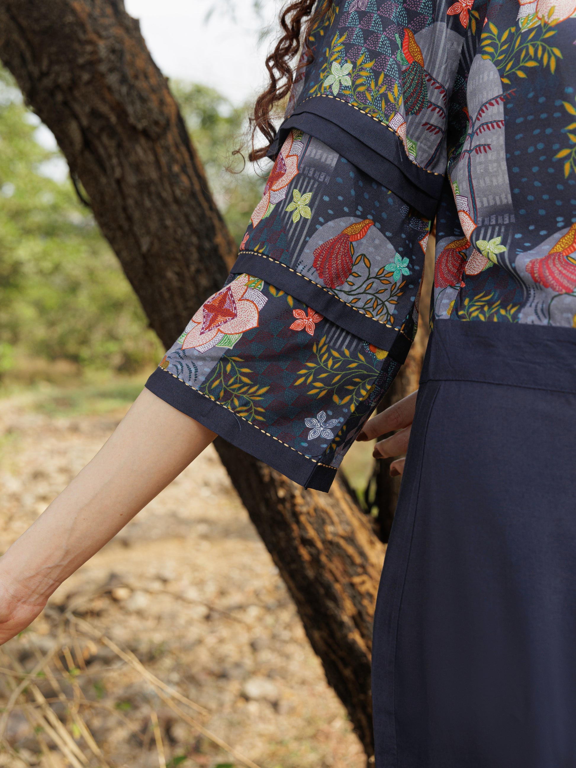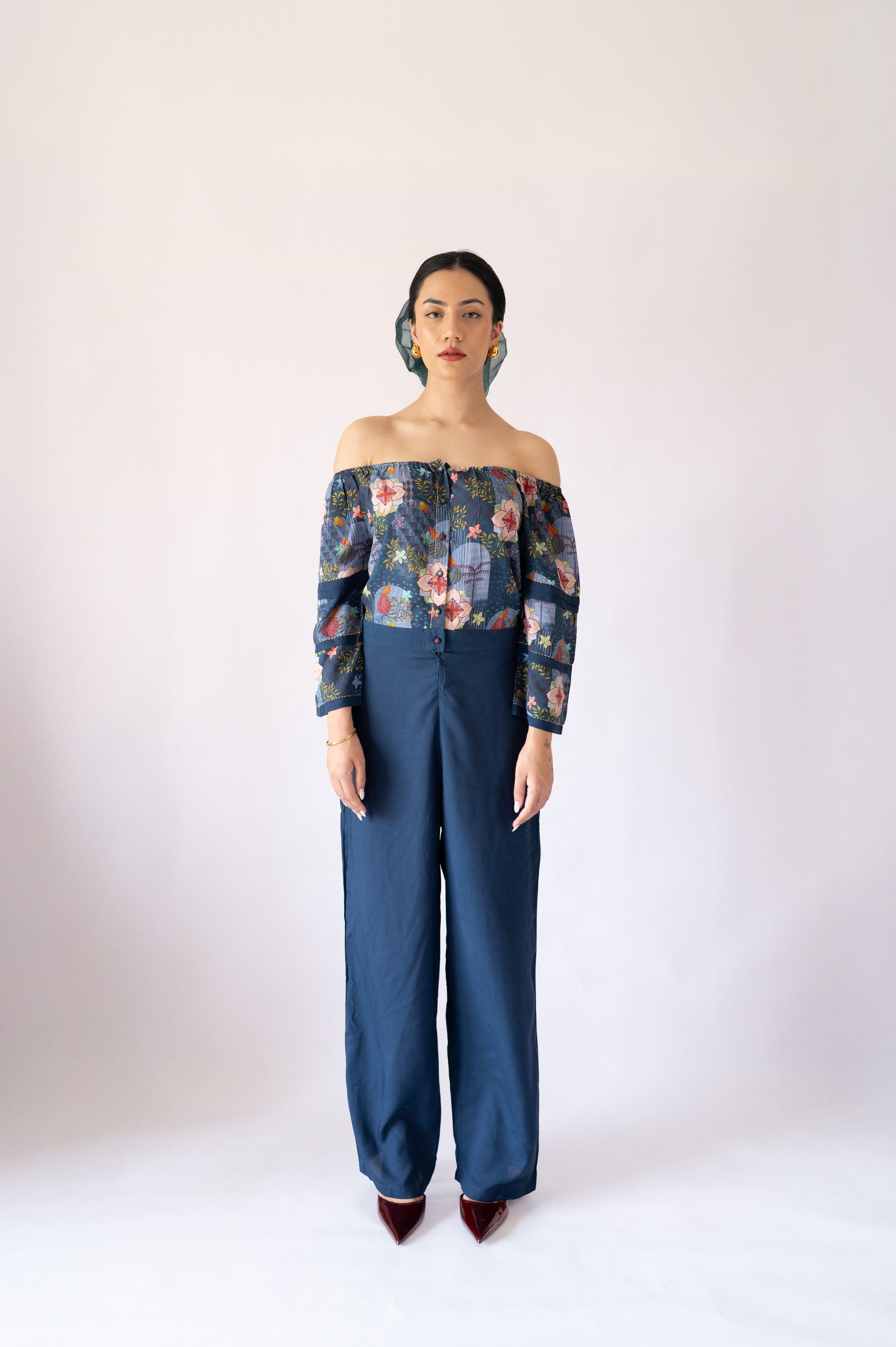 A poetic ode to effortless style, the Indigo Cerulean Stitch Jumpsuit is crafted in breathable lyocell fabric and dyed in a serene indigo hue. Kantha-stitched sleeves add a delicate handcrafted charm, while its relaxed fit and refined silhouette make it a versatile pick for daytime ease or evening allure.