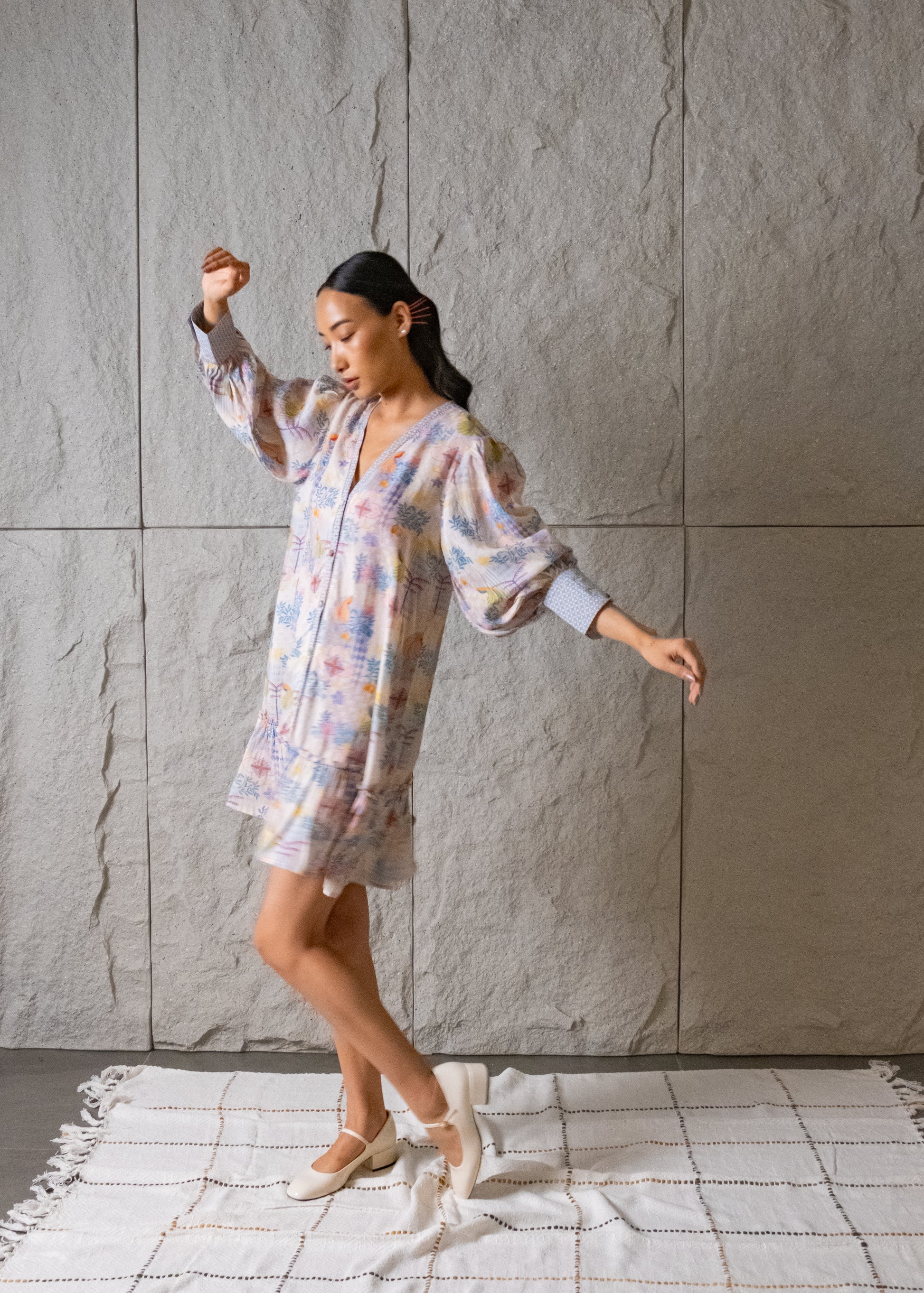 This short A-line dress brings out the lighter side of you, with a loose silhouette and flared skirt that give it a carefree and easy-going vibe. The V-neck and long sleeves add a touch of sophistication – but feel free to roll the sleeves up for a more casual look. The button placket across the front with delicate lace detailing adds a soft, feminine touch.