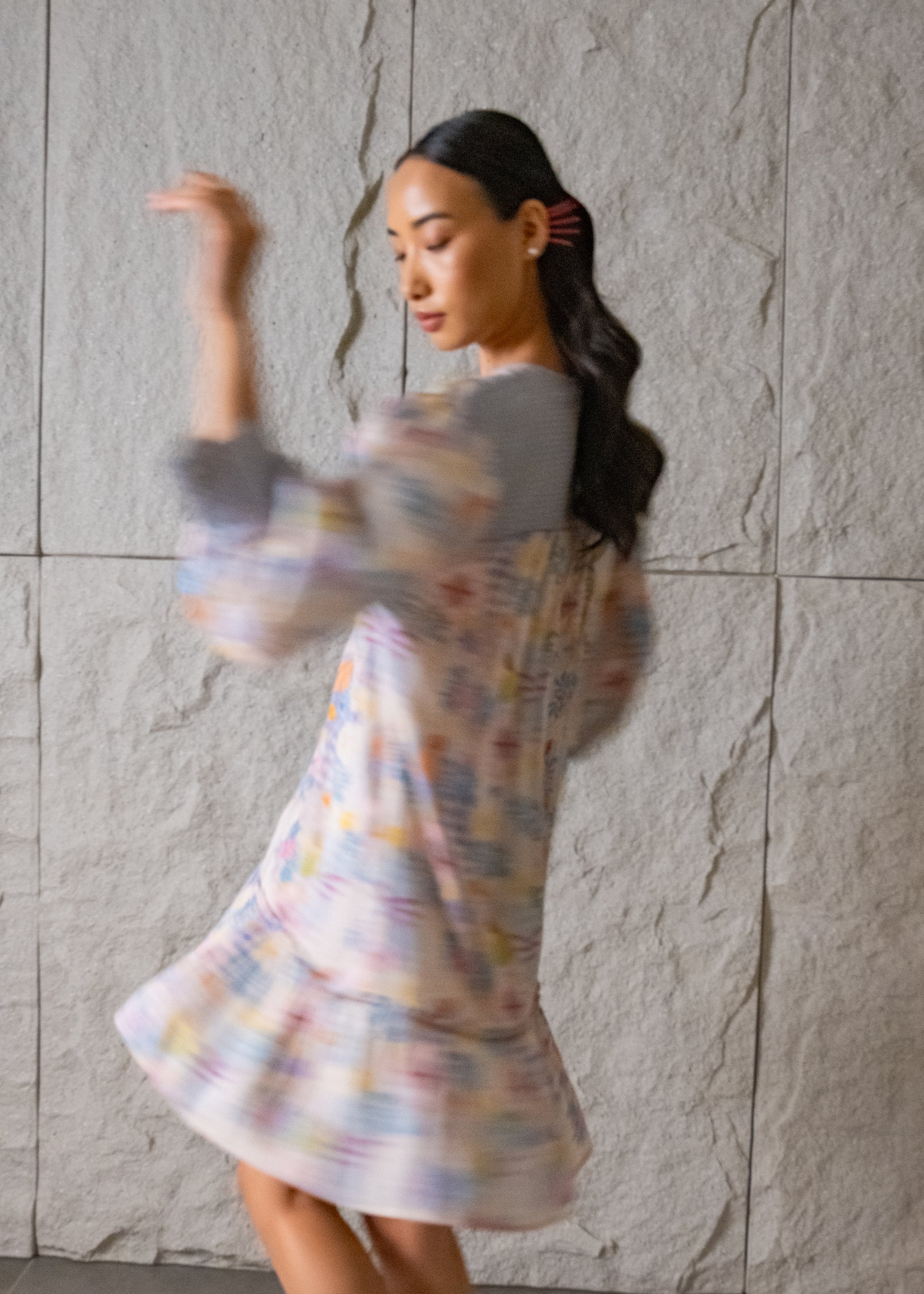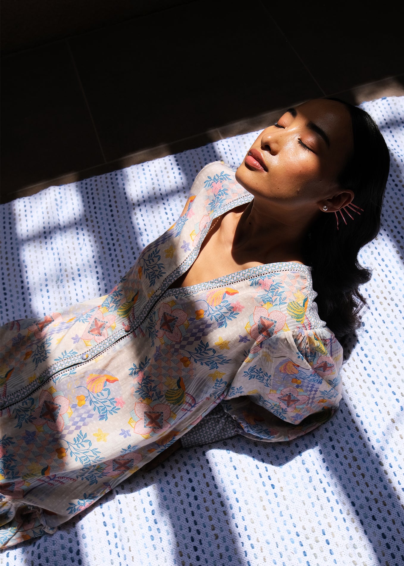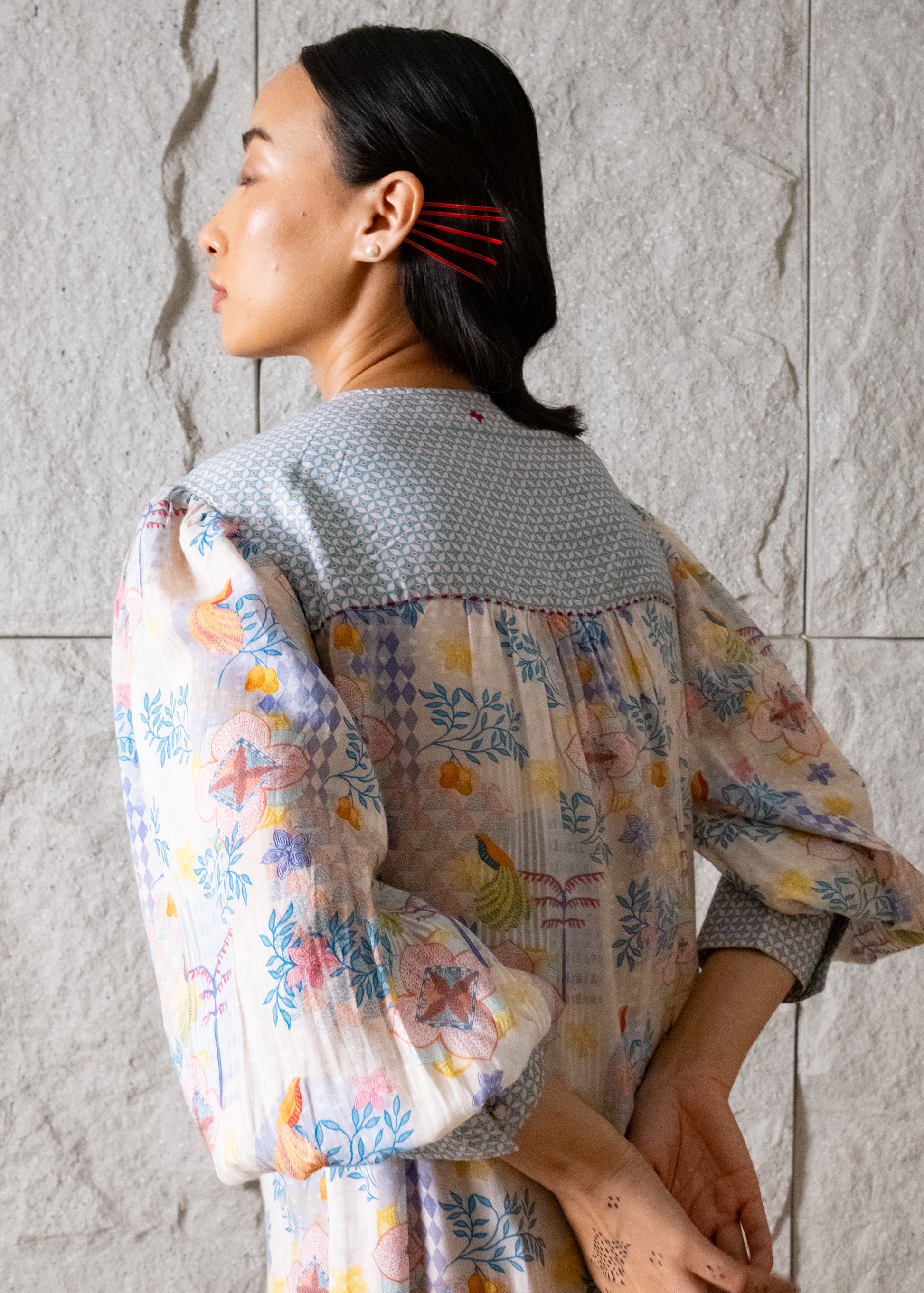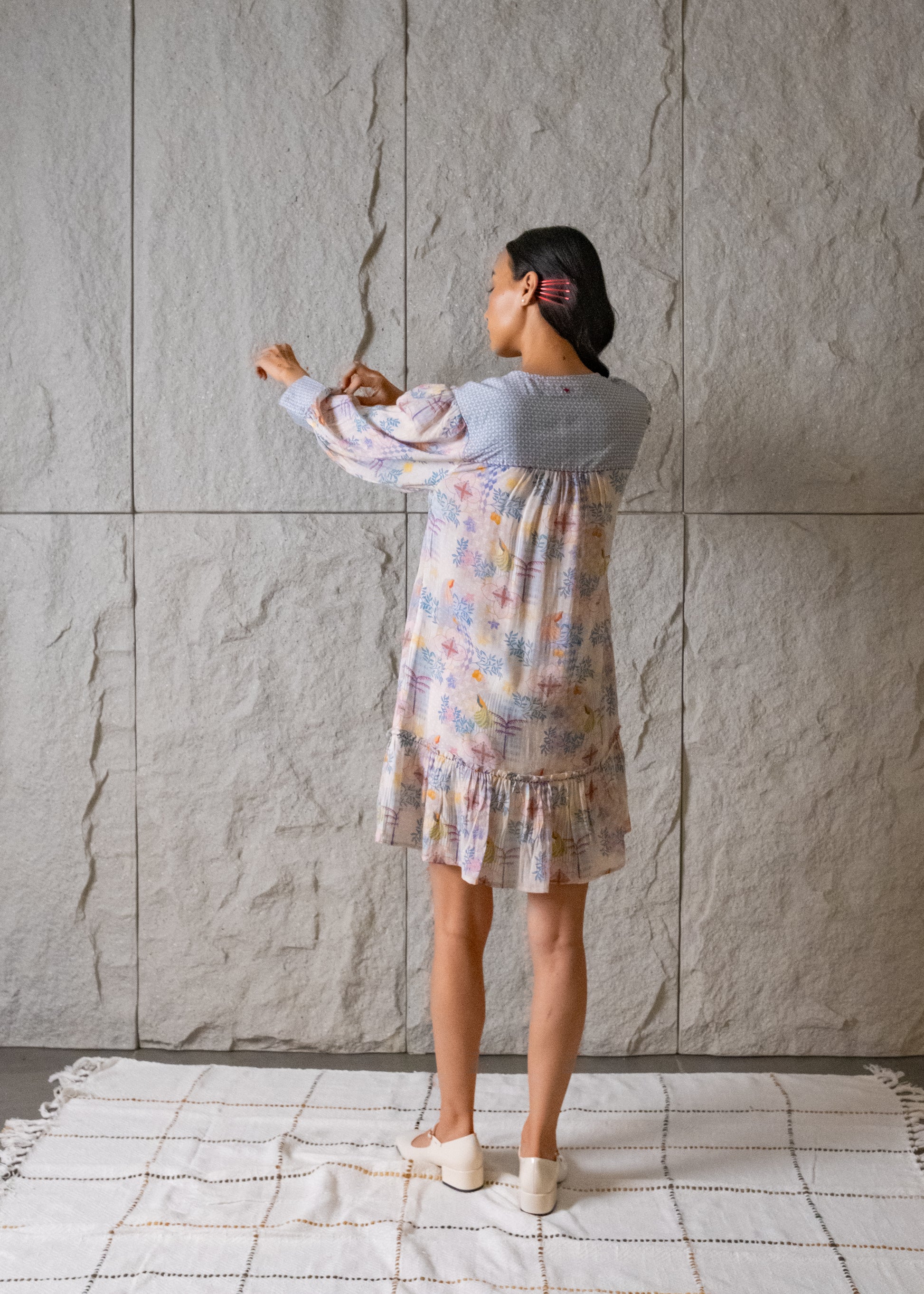 The dress features a light kantha-inspired print across the body, with a contrast print on the back yoke adding visual interest. The pop stitching detail in fuschia adds a modern and edgy touch.