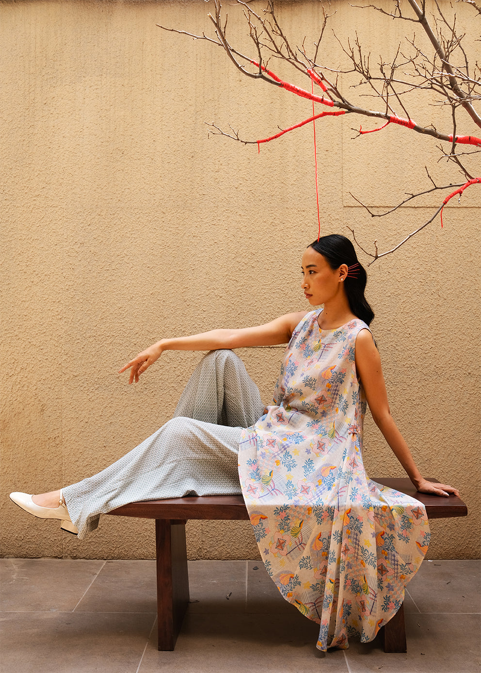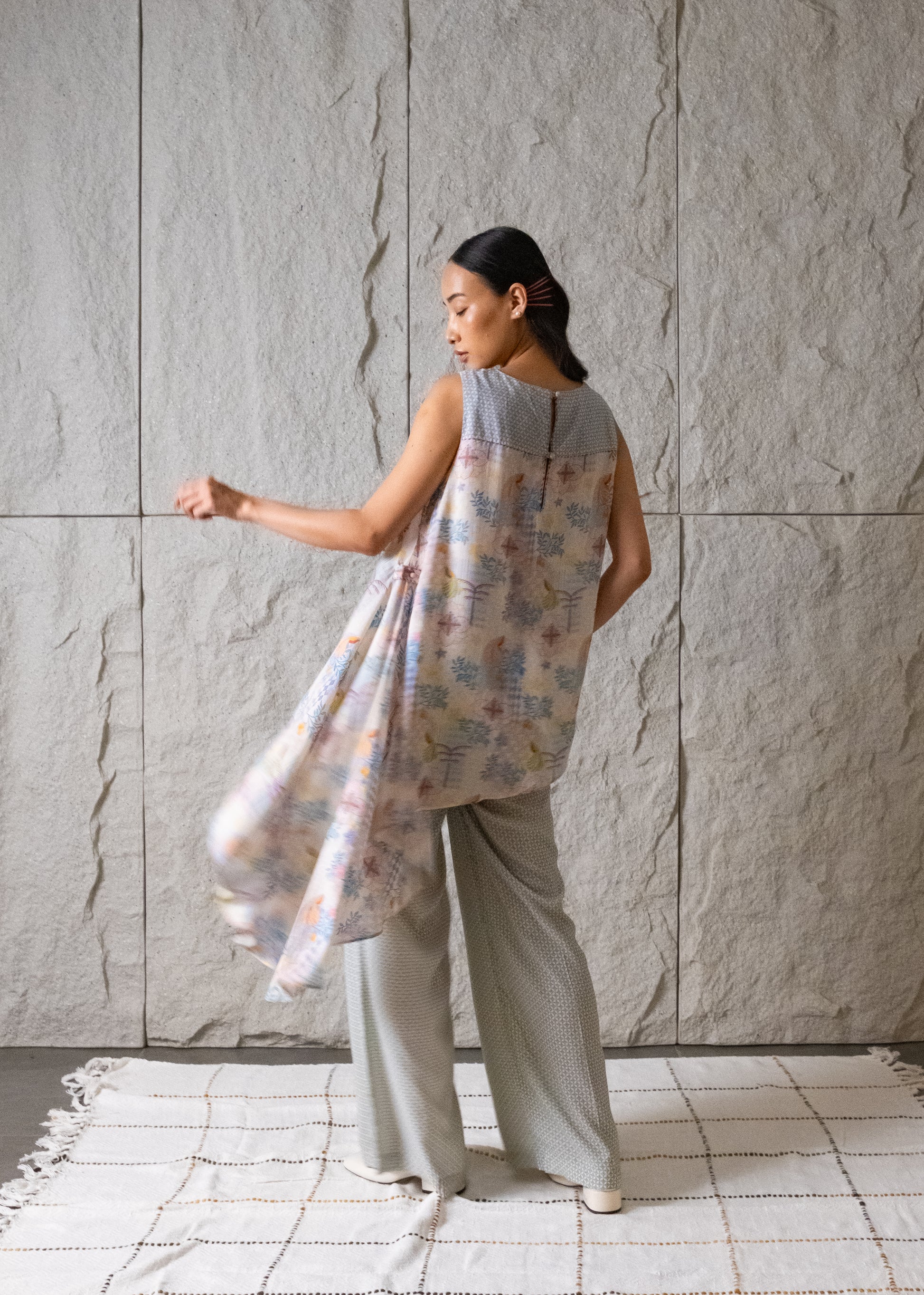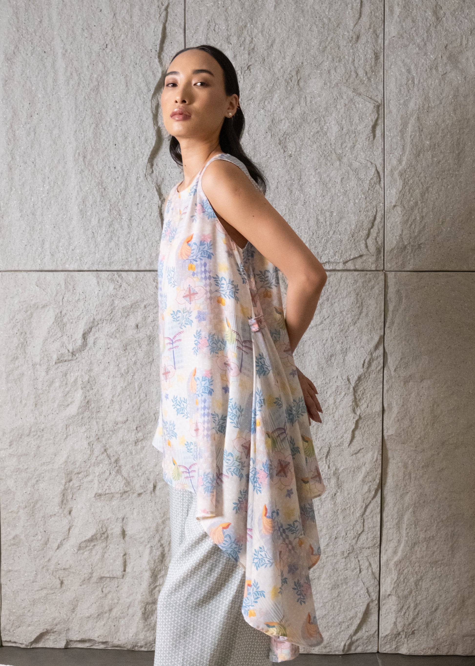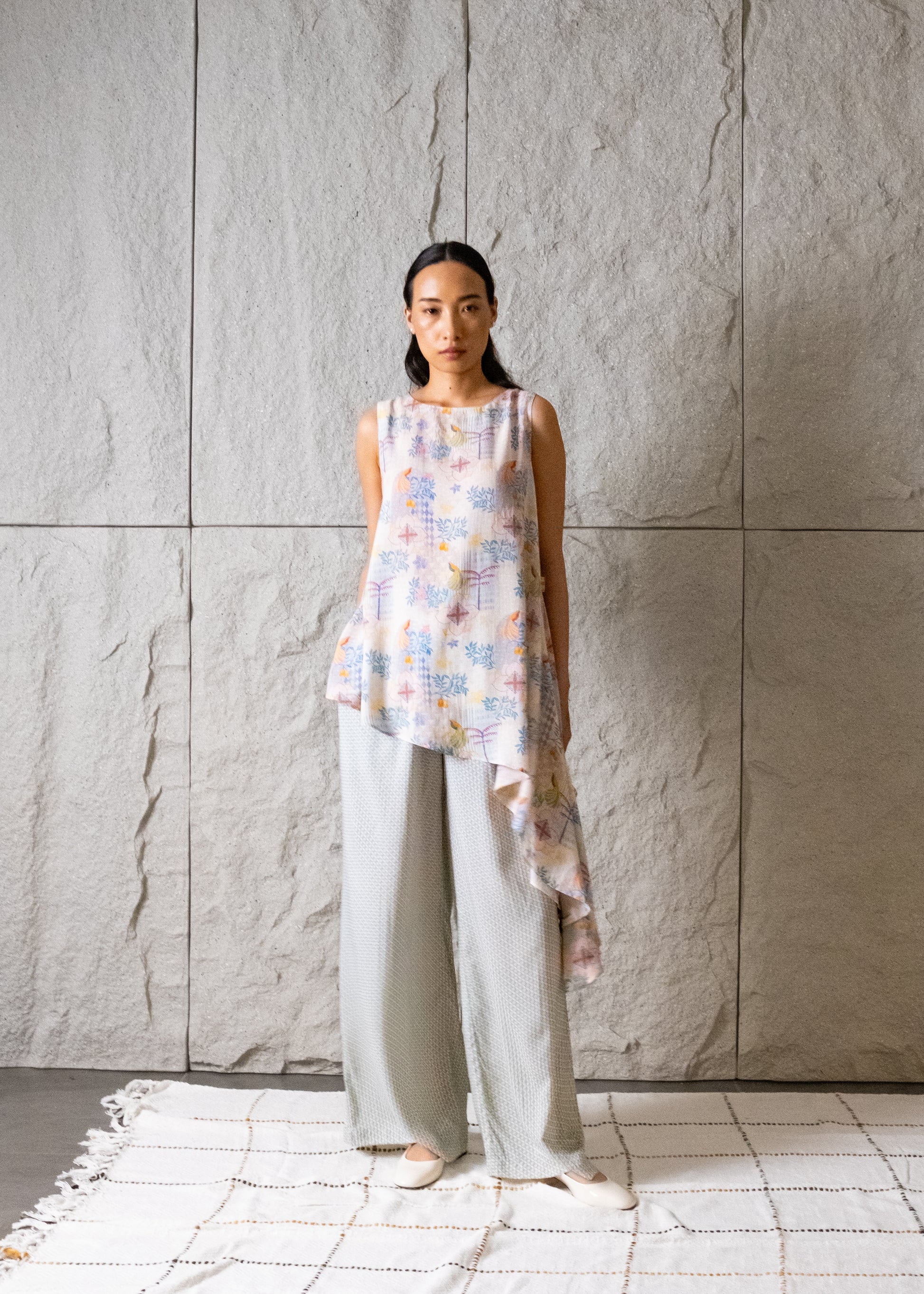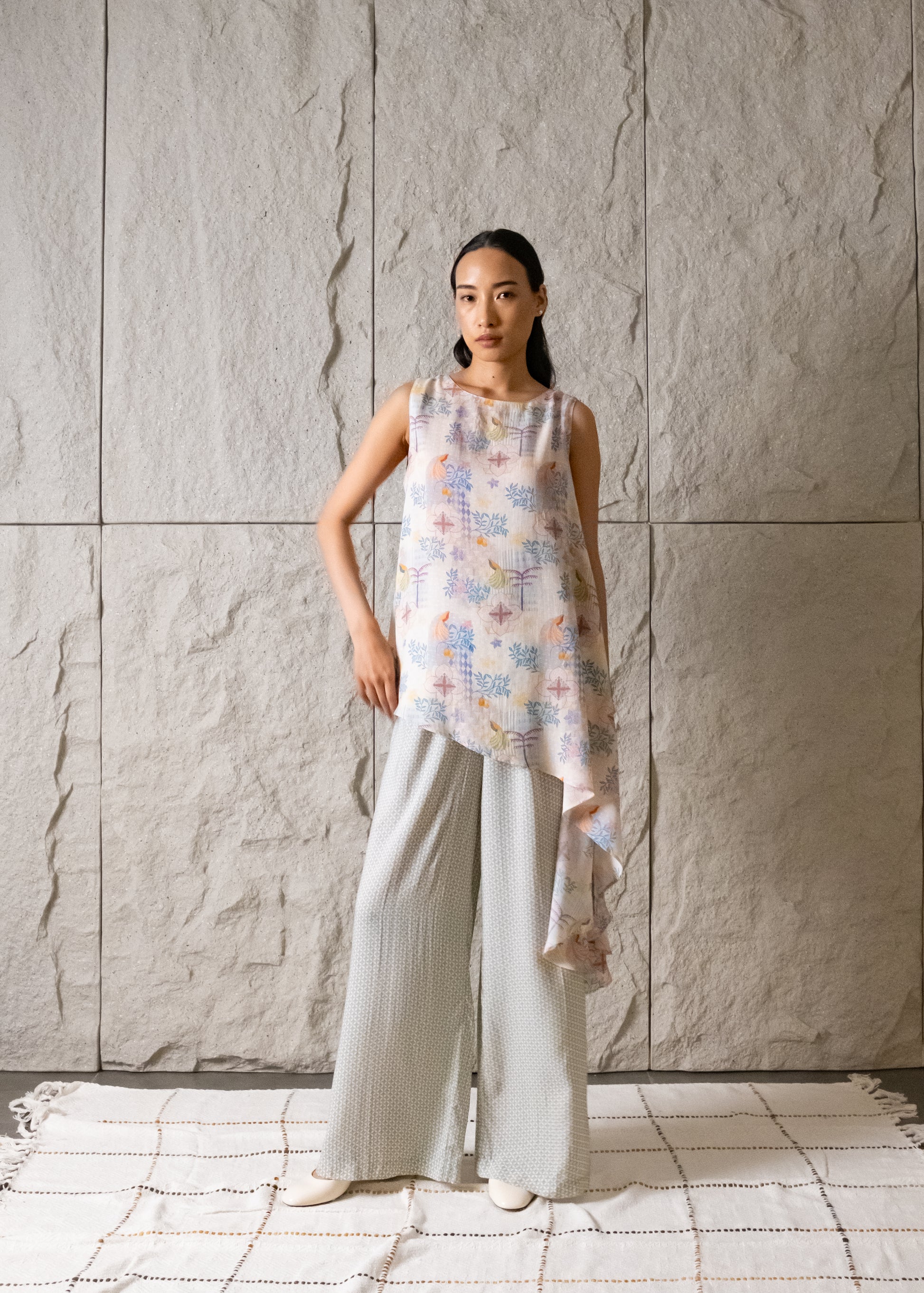 A contemporary ensemble for when you need a quick and easy outfit that will make a statement. The sleeveless top boasts a unique handkerchief hemline that cascades down with fluidity, while the wide trousers drape beautifully. Crafted with attention to detail, the trousers feature a well-tailored design and an elasticated waist back for all-day comfort and ease of wear. Inspired by the beauty of nature, the set showcases a print in subtle tones, punctuated with vibrant pops of color for an eye-catching finish.