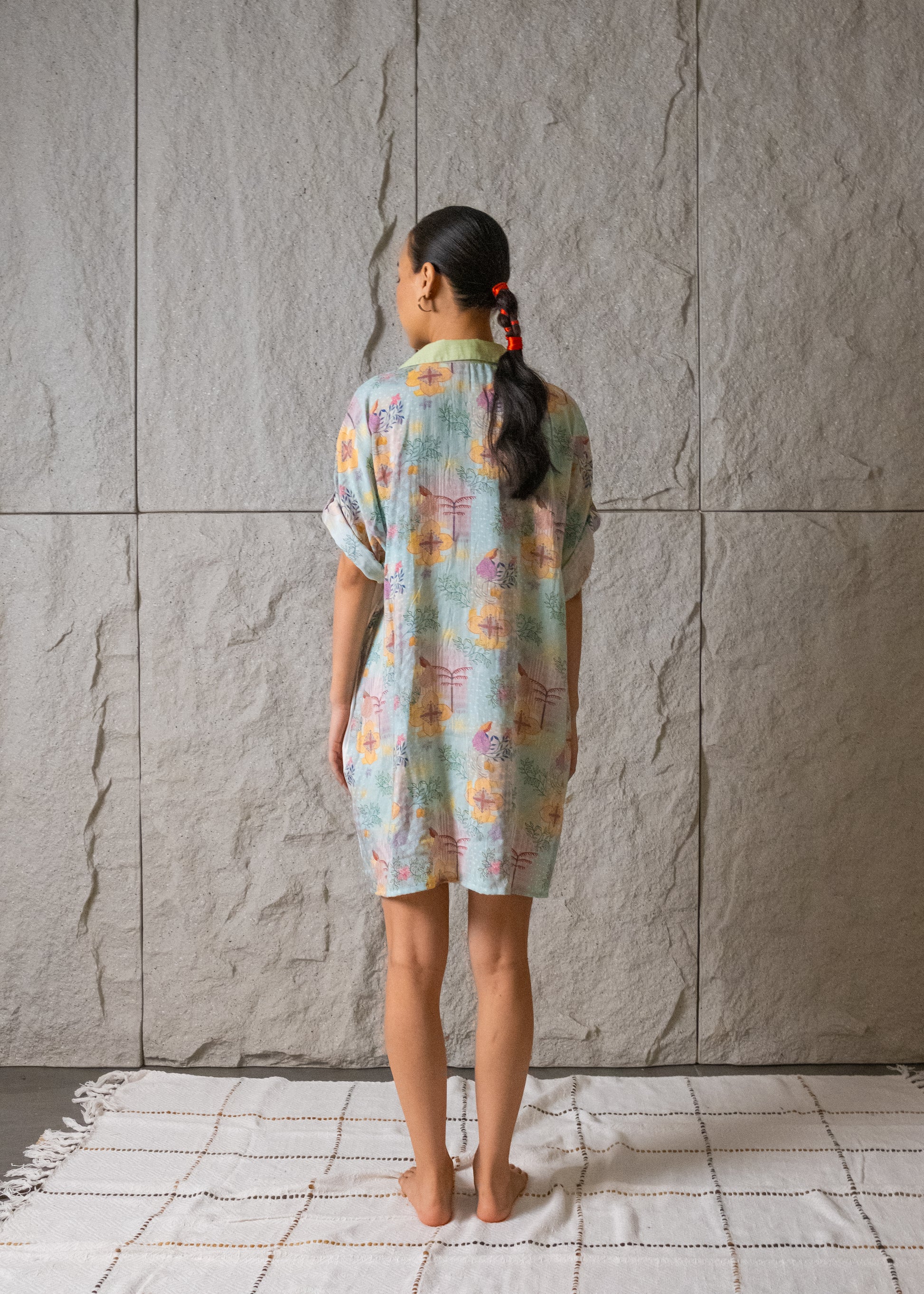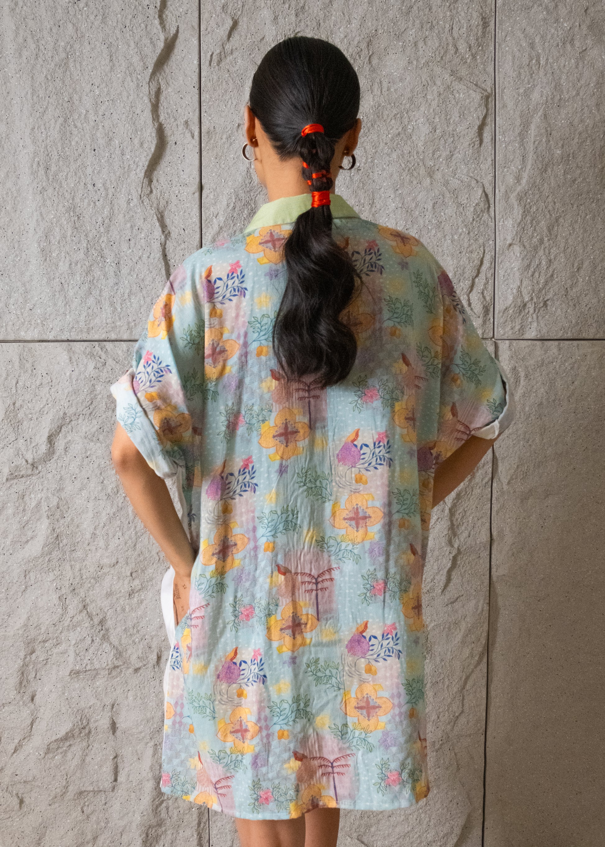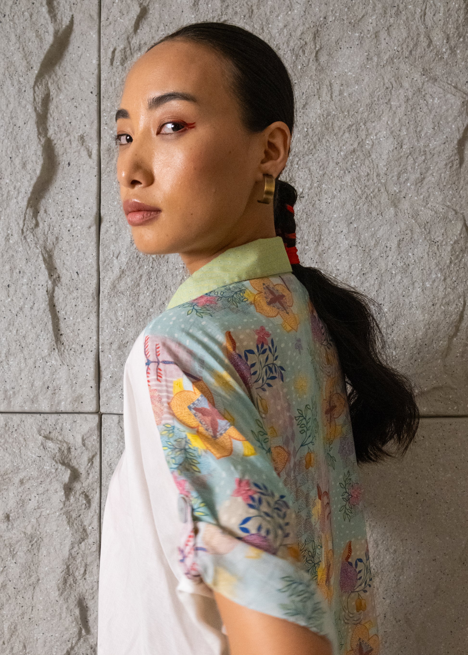 Elevate your wardrobe with this quirky-chic tunic. With a relaxed silhouette and an easy fit, it offers a relaxed and laid-back vibe that is perfect for any occasion. The front of the tunic is classic white, providing a clean and timeless look, while the back is adorned with a vibrant and colorful print that adds a playful and eye-catching element. Pops of color in the button placket and collar on the front create a harmonious balance between subtlety and playfulness, making this tunic a standout piece in your wardrobe. The interplay of positive and negative elements creates a dynamic and visually appealing design that is both modern and versatile. Whether worn on its own for a statement look or paired with bootleg jeans or leggings for a more casual ensemble, this tunic transitions from day to night with ease.