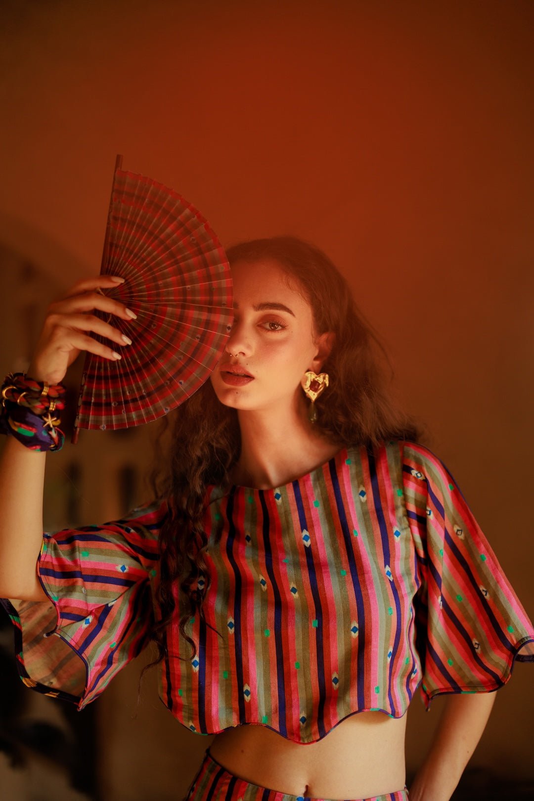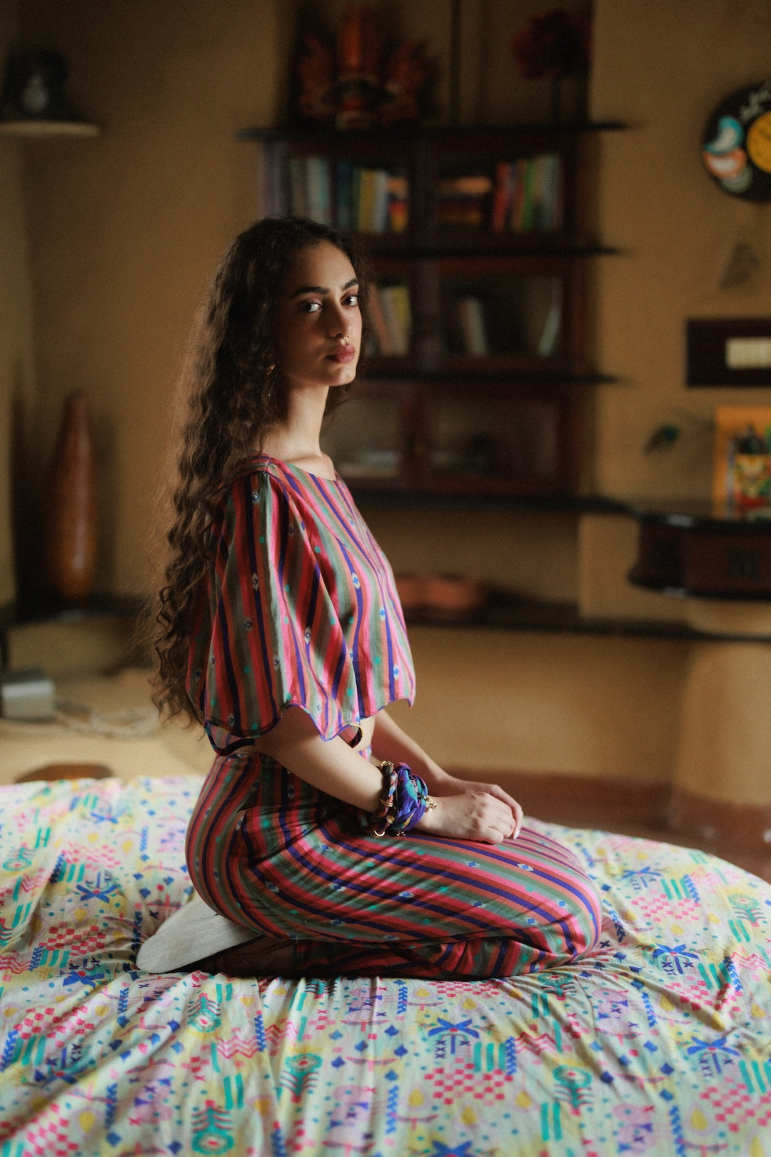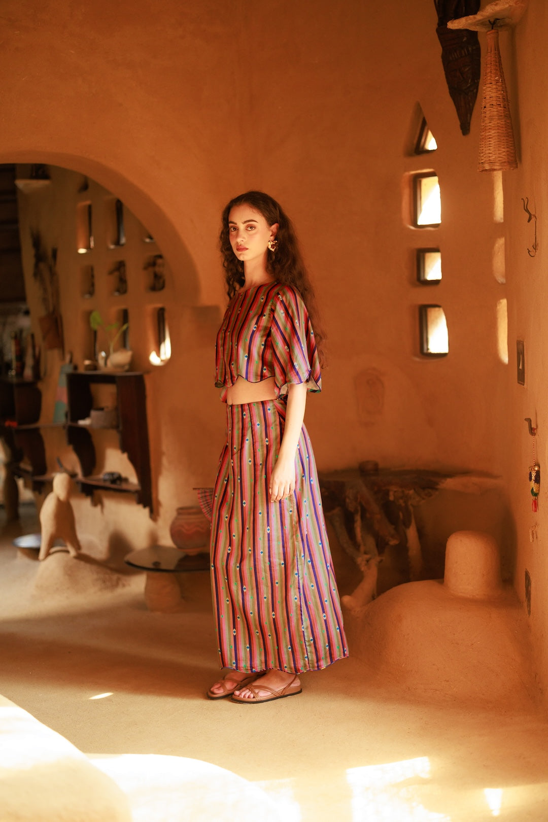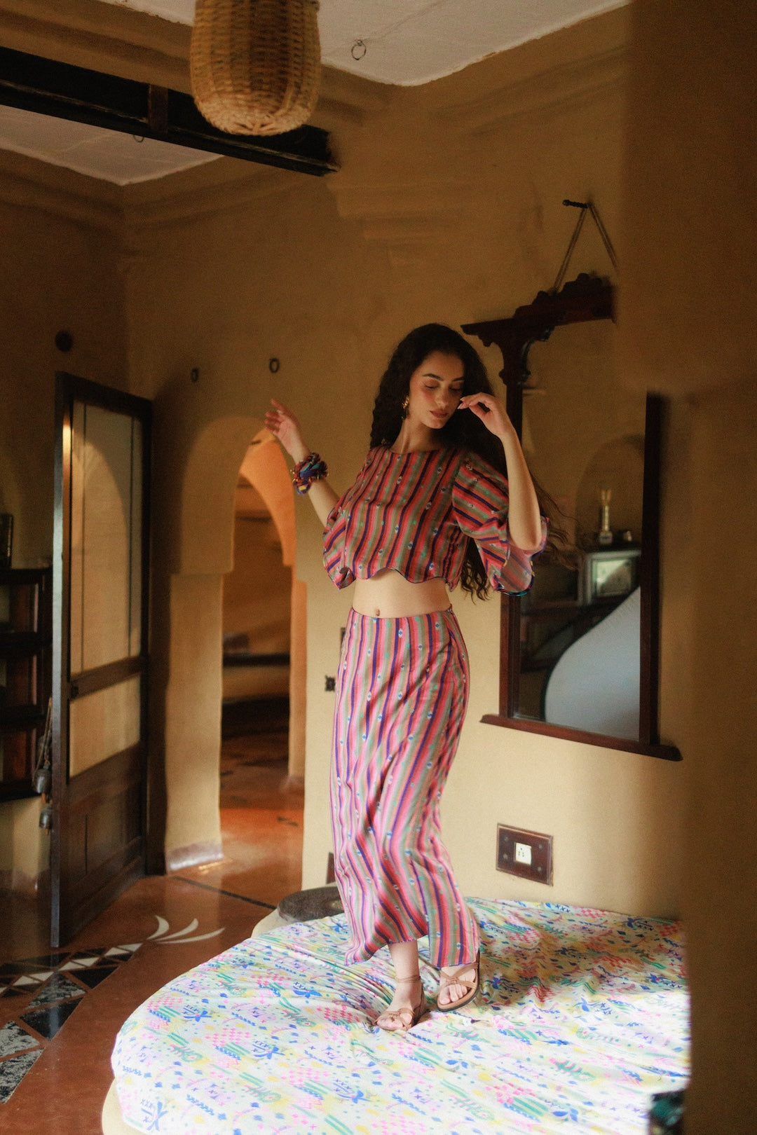 This is such a fun set. It is incredibly soft, lined, and the colors are unique in palette. The details are charming and the fit is very easy to wear. I usually prefer a slit in a skirt to take longer strides (the material does not stretch) but not a dealbreaker at all in this case as the skirt design pairs well with the shape of the top.