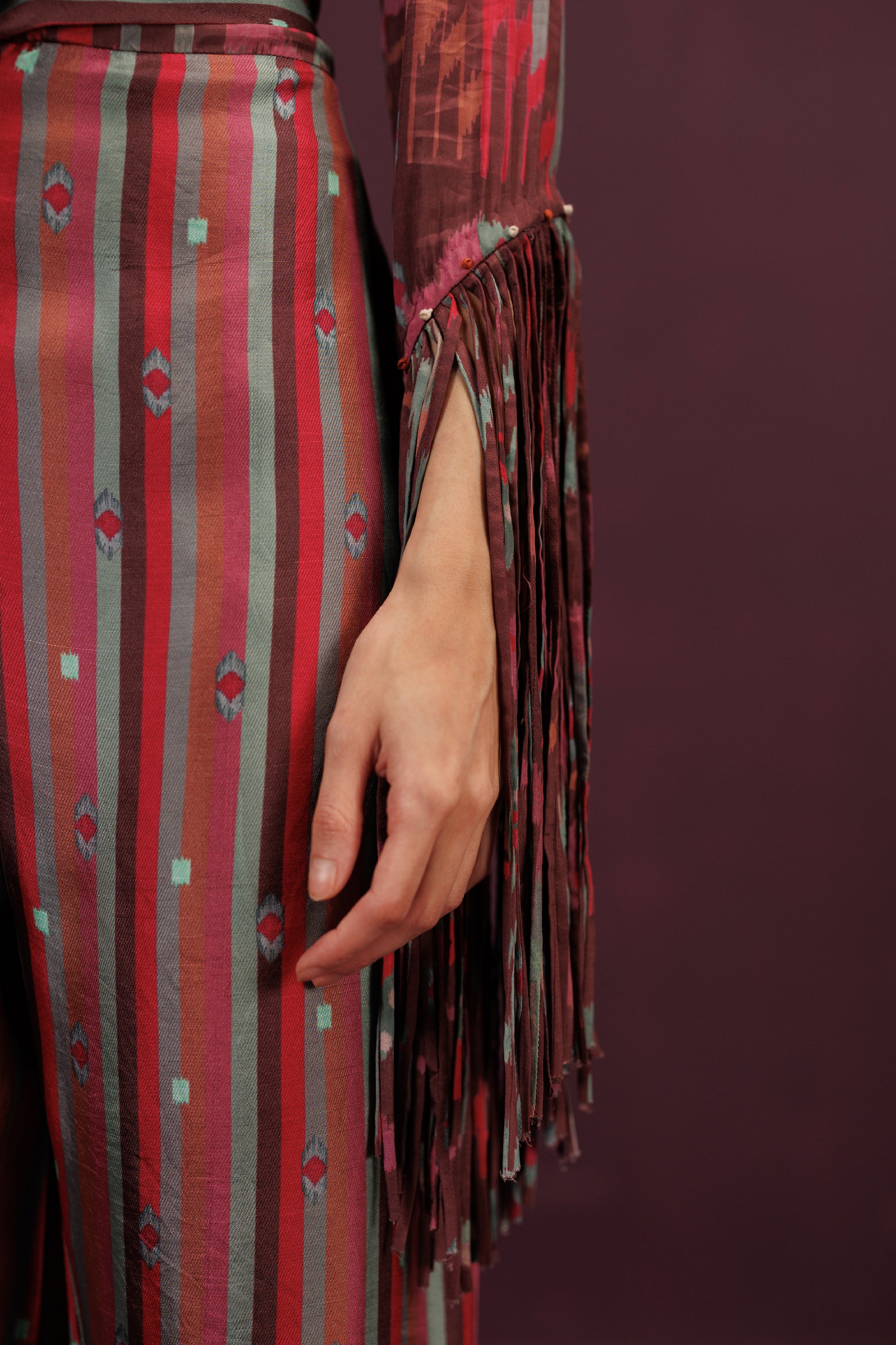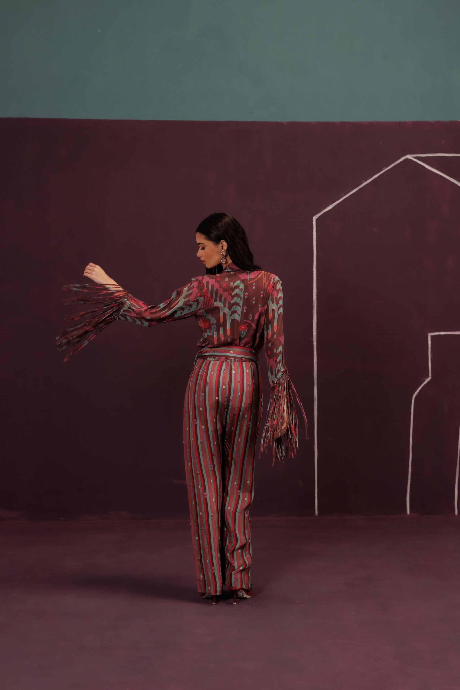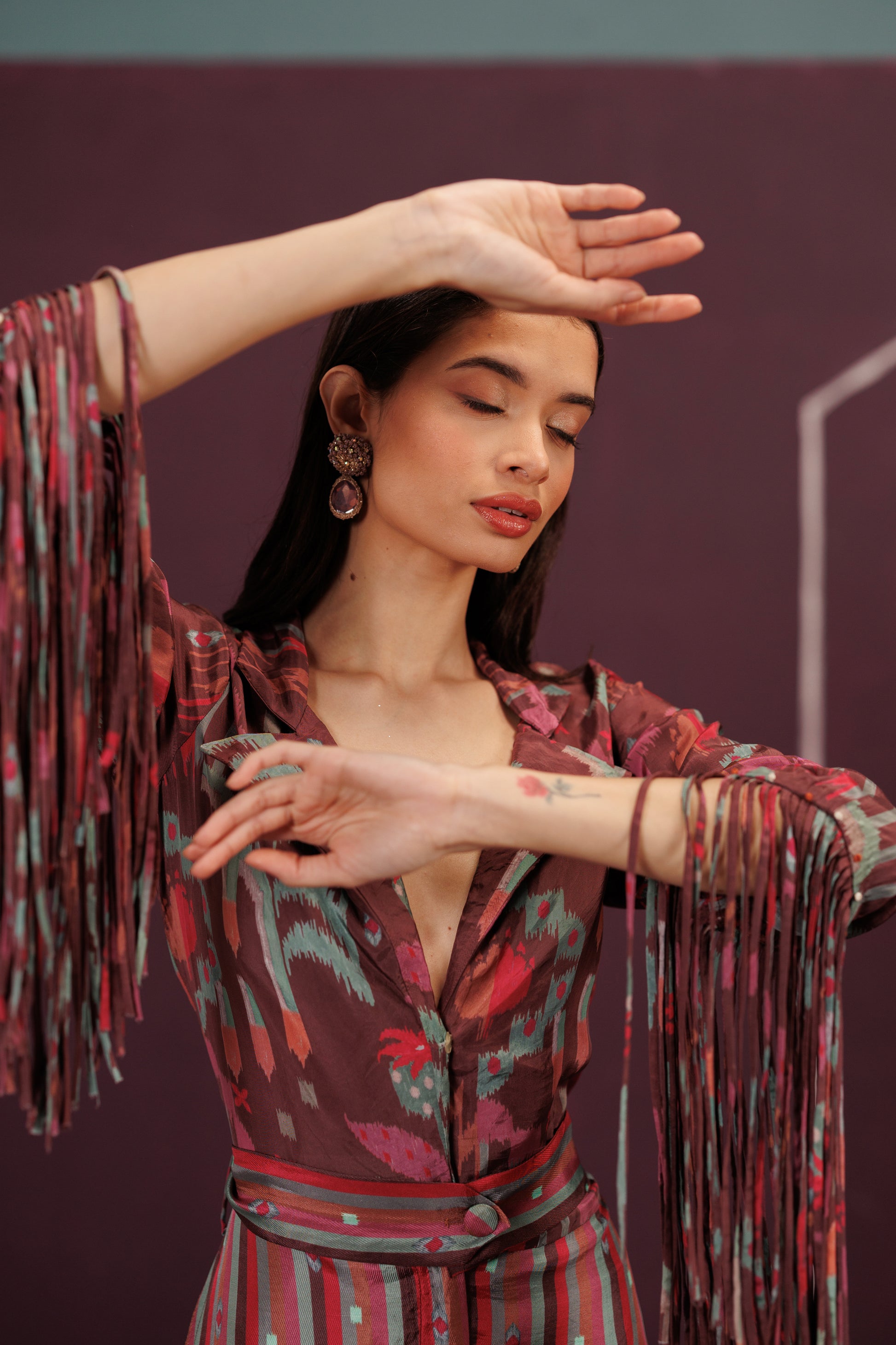 The ultimate party piece. This luxurious jumpsuit is the bold anthem of the night; its dramatic, playful fringed sleeves capture a fierce, Western-inspired rhythm that allows the wearer to effortlessly ride the midnight frequency of the celebration.