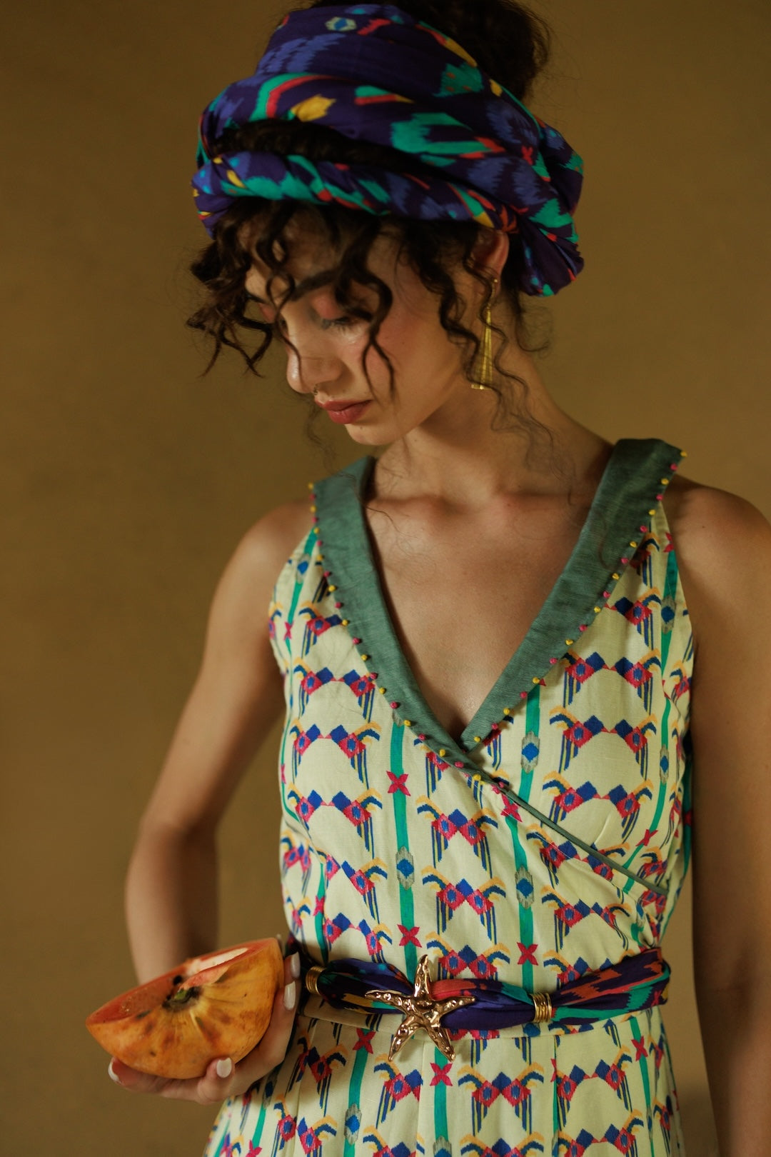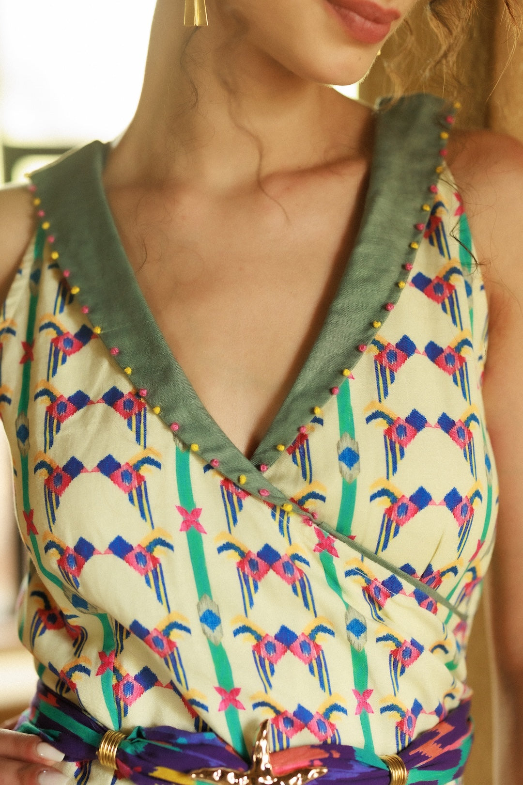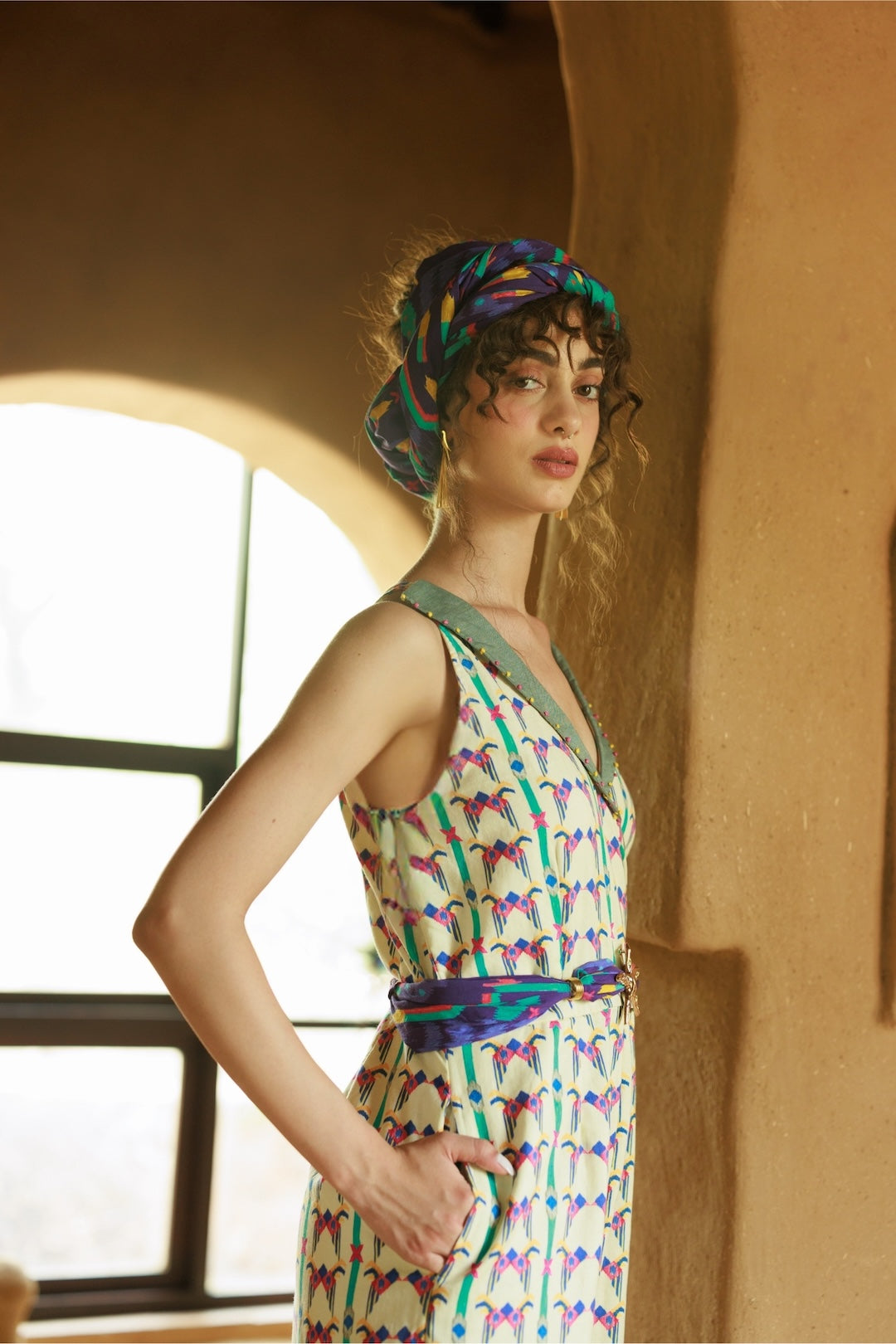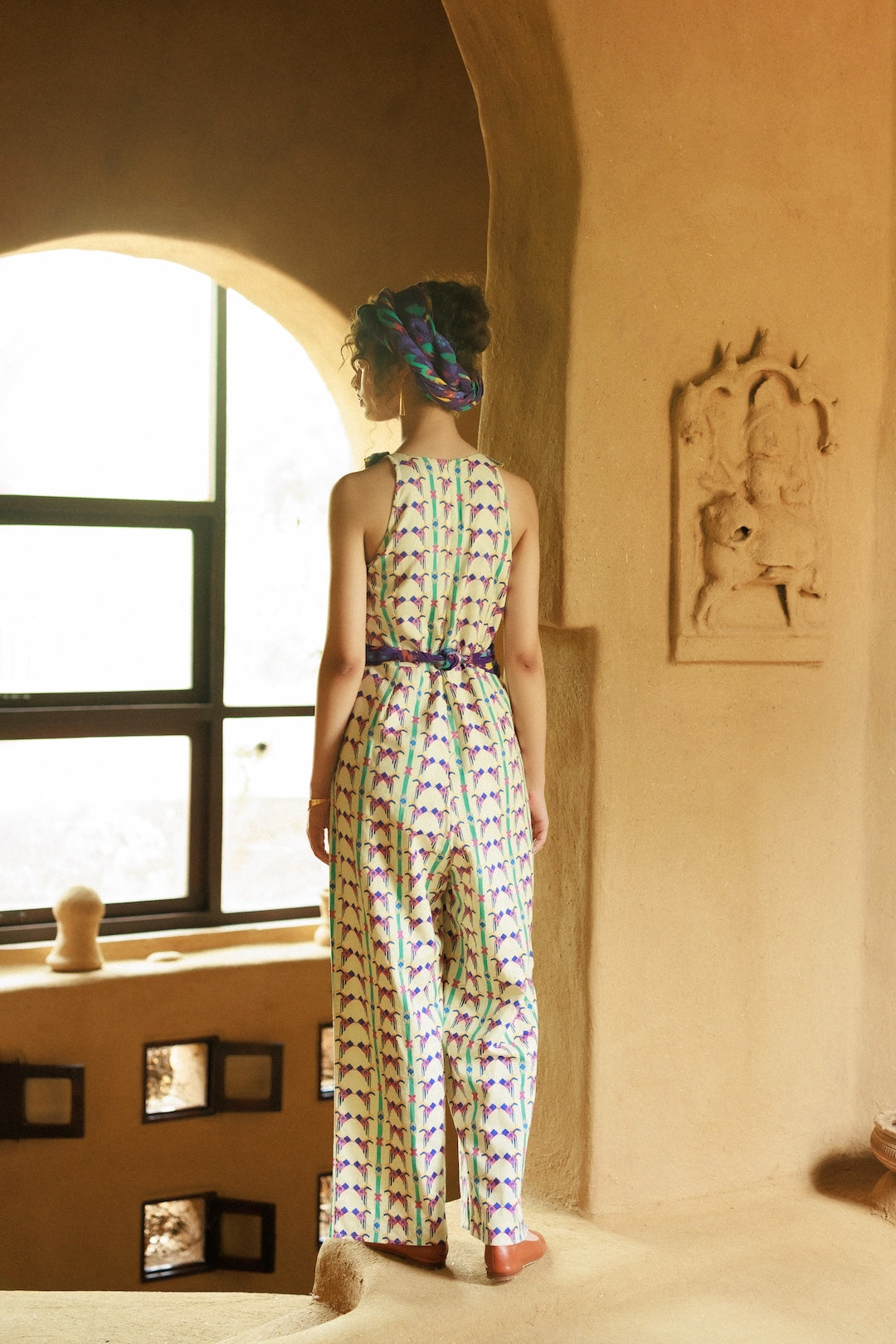 Lightweight with tailored shoulders, this bird print jumpsuit turns a missed ride into a moment — meant for unplanned sunsets and soft landings.