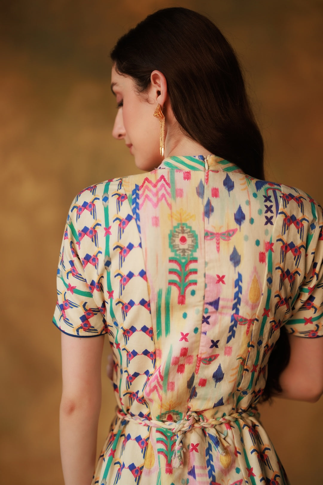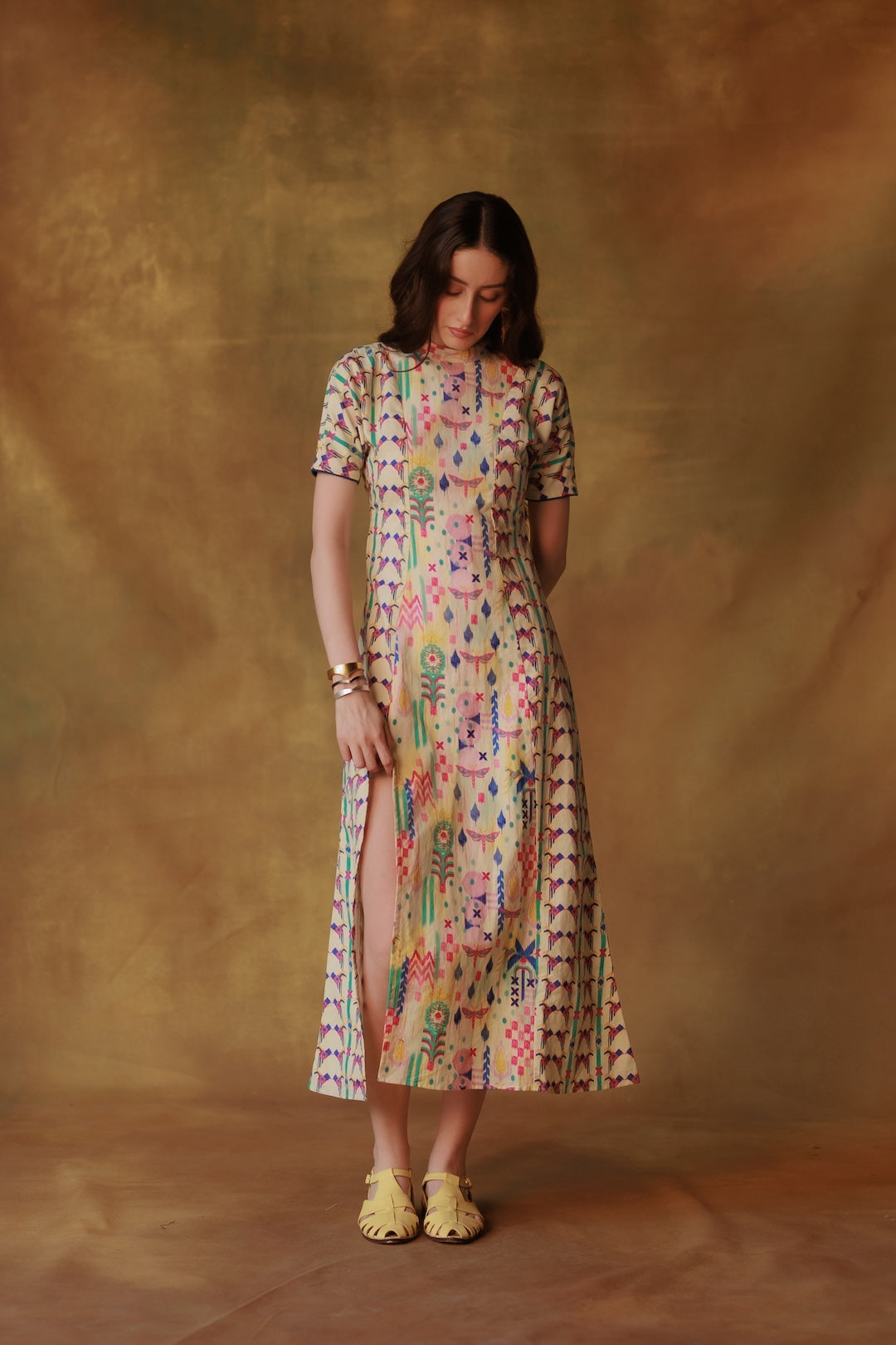 Clean and upright like museum hallways, this linen dress is cut with soft panels and a standing collar — tailored for quiet mornings and long pauses between exhibits.