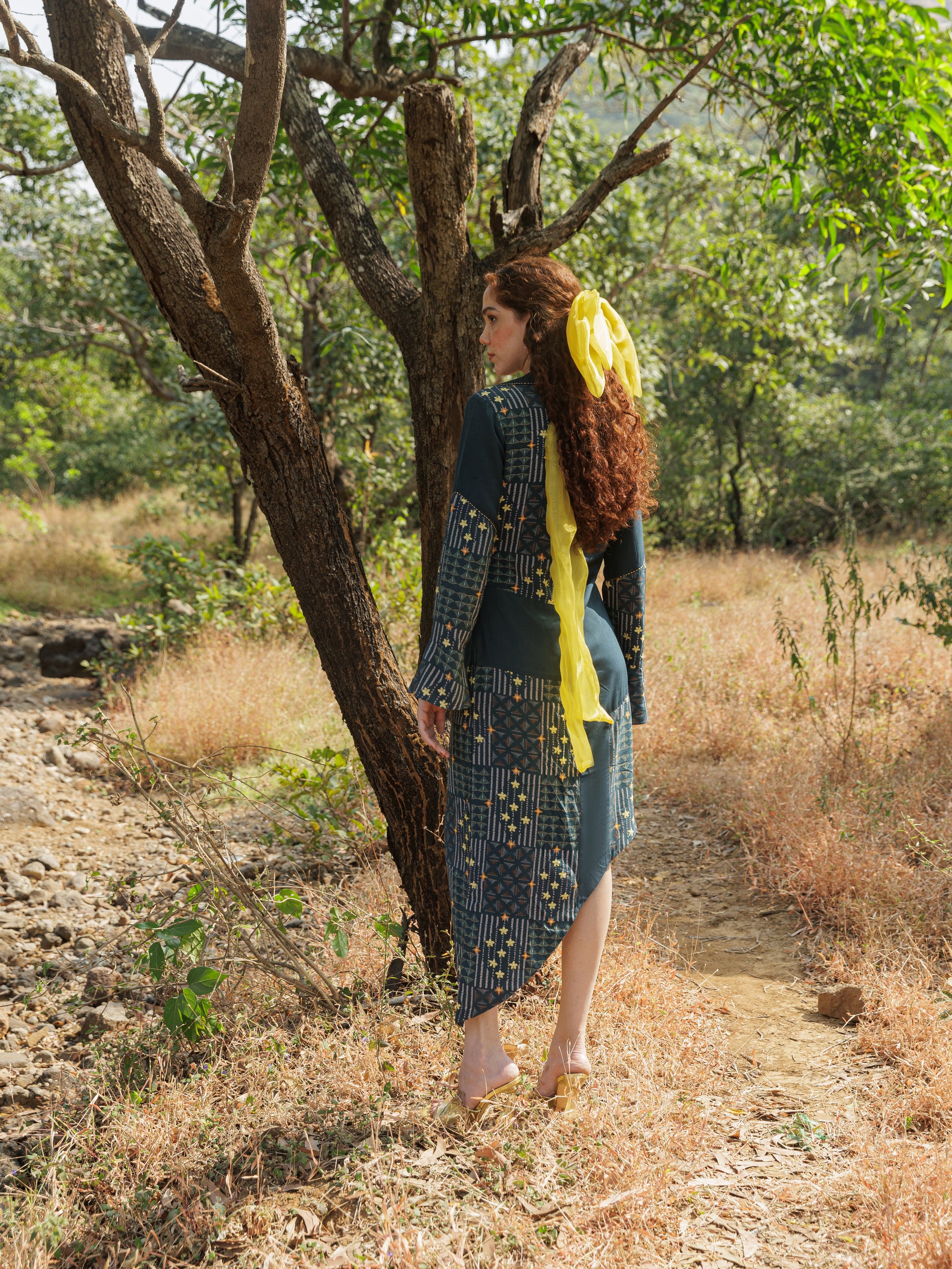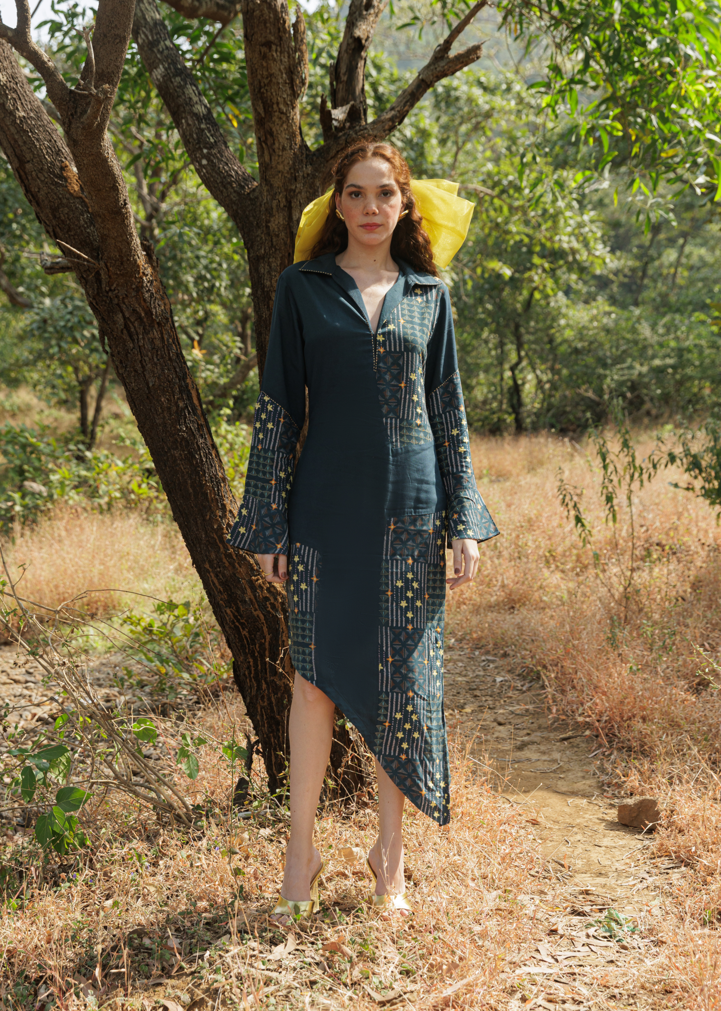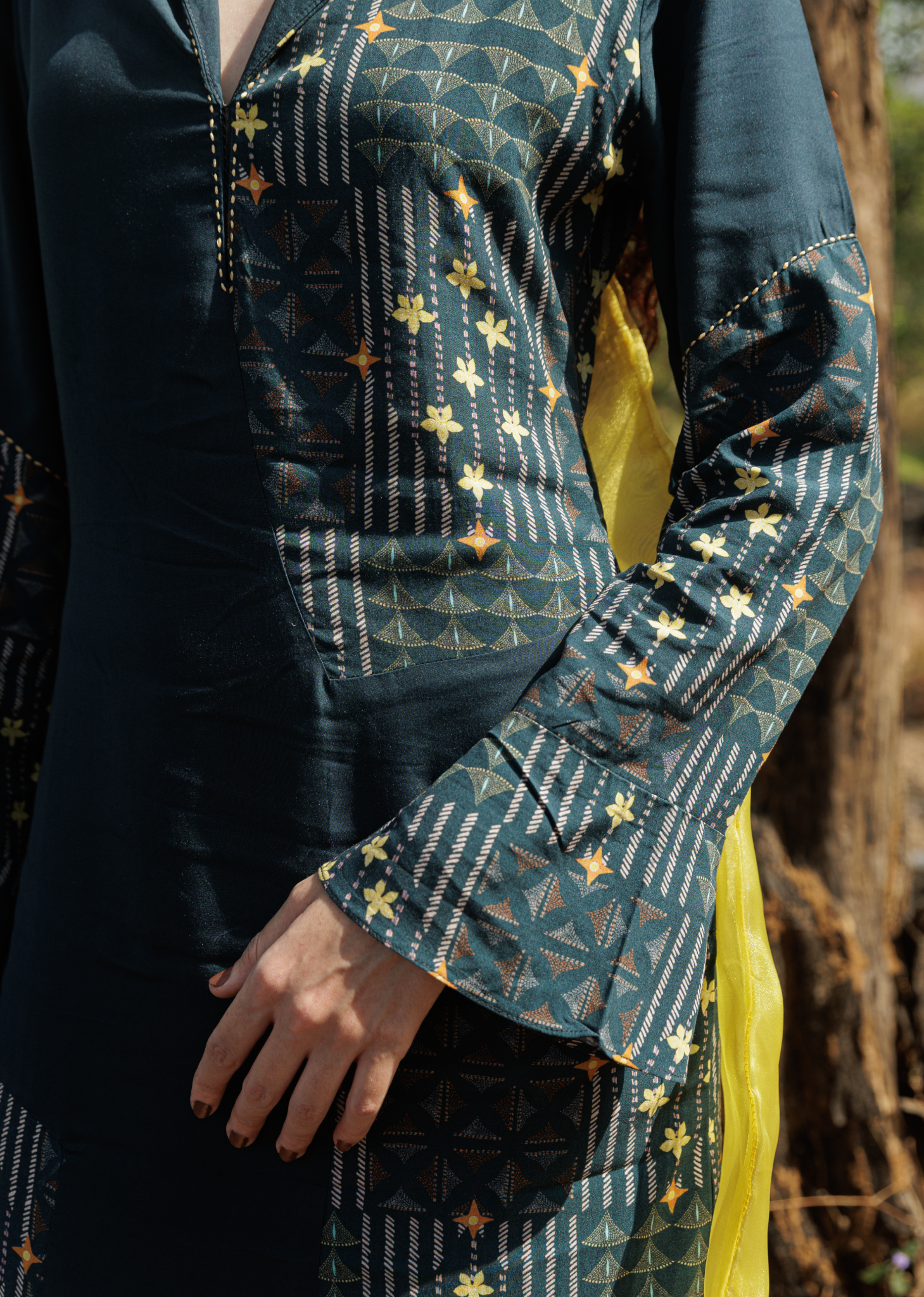 Balancing structure and fluidity, the Mosaic Dress embraces duality. Its asymmetric hemline mirrors nature’s untamed edges, while the flared sleeves add a poetic touch of movement. Woven from smooth cotton satin in a deep teal green, the dress embodies the quiet power of transition, with Kantha-inspired detailing grounding it in artisanal tradition.