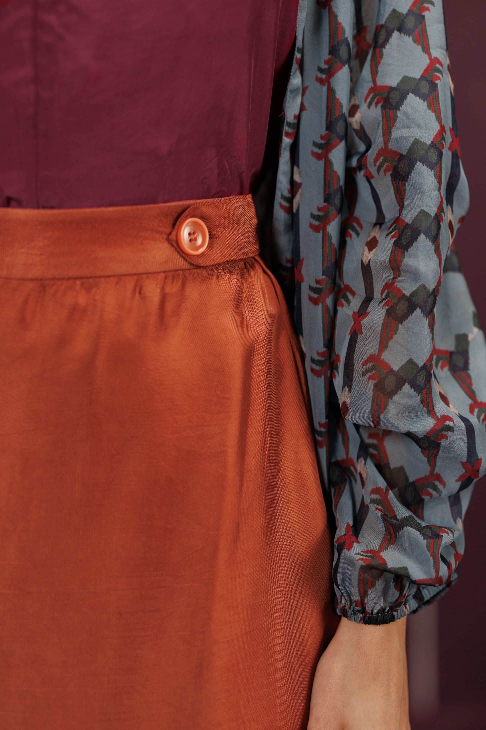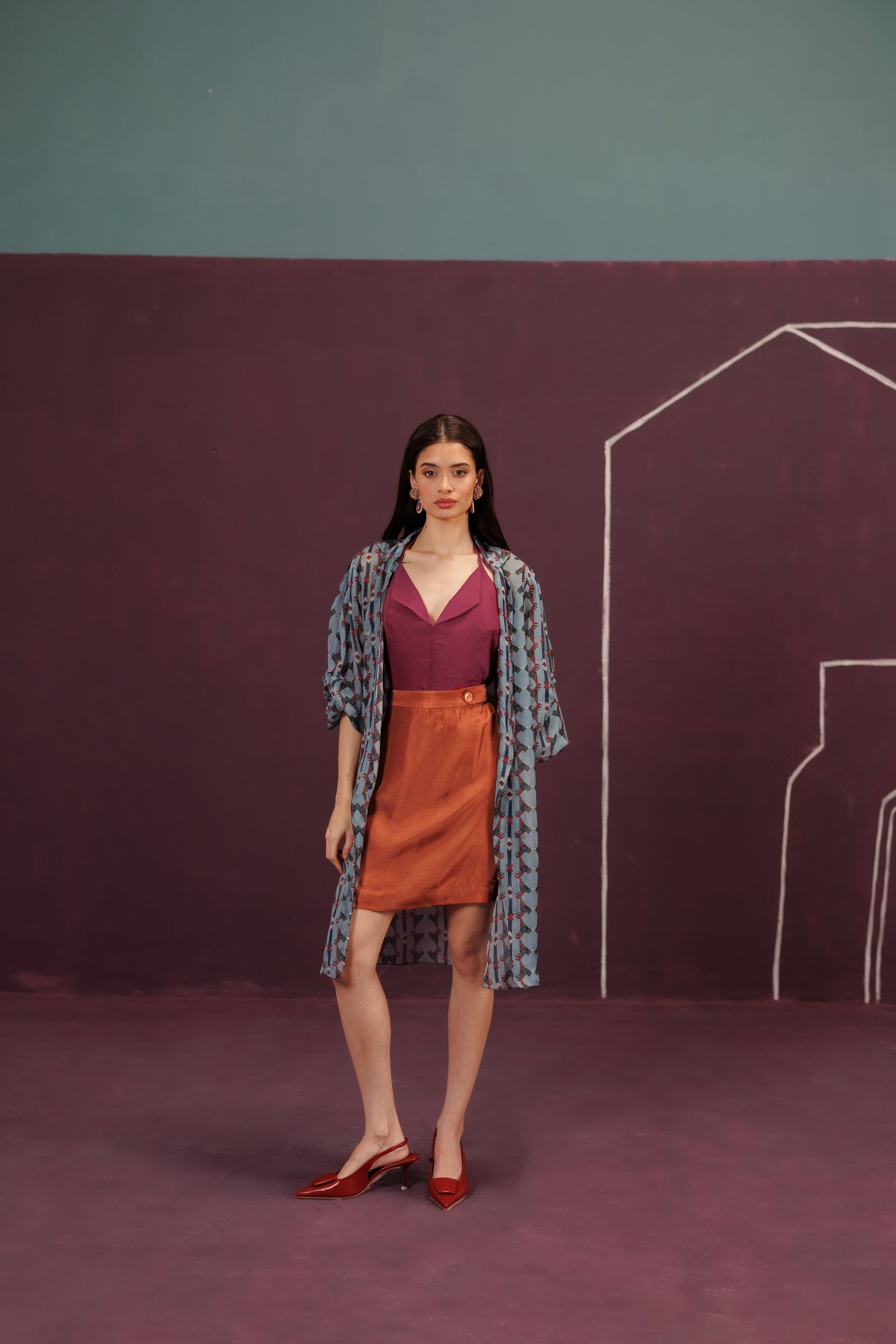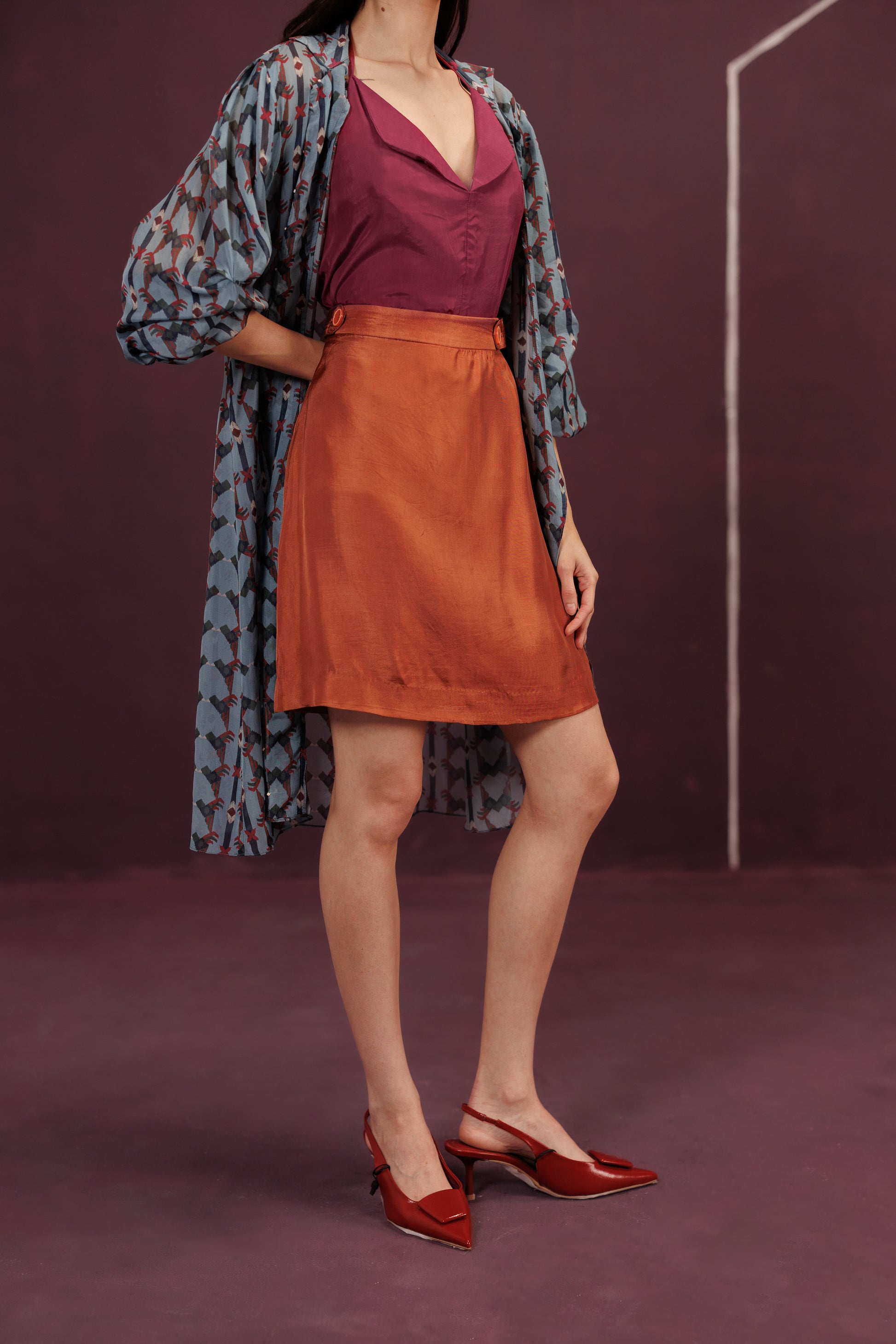 A sumptuous three-piece set that mirrors a celebratory layered cake. The oversized Organza Jacket is the airy, sheer "frosting" holding the shape, while the rust orange base adds the spirited "zest" - a final, delicious construction, complete with a cherry on top.