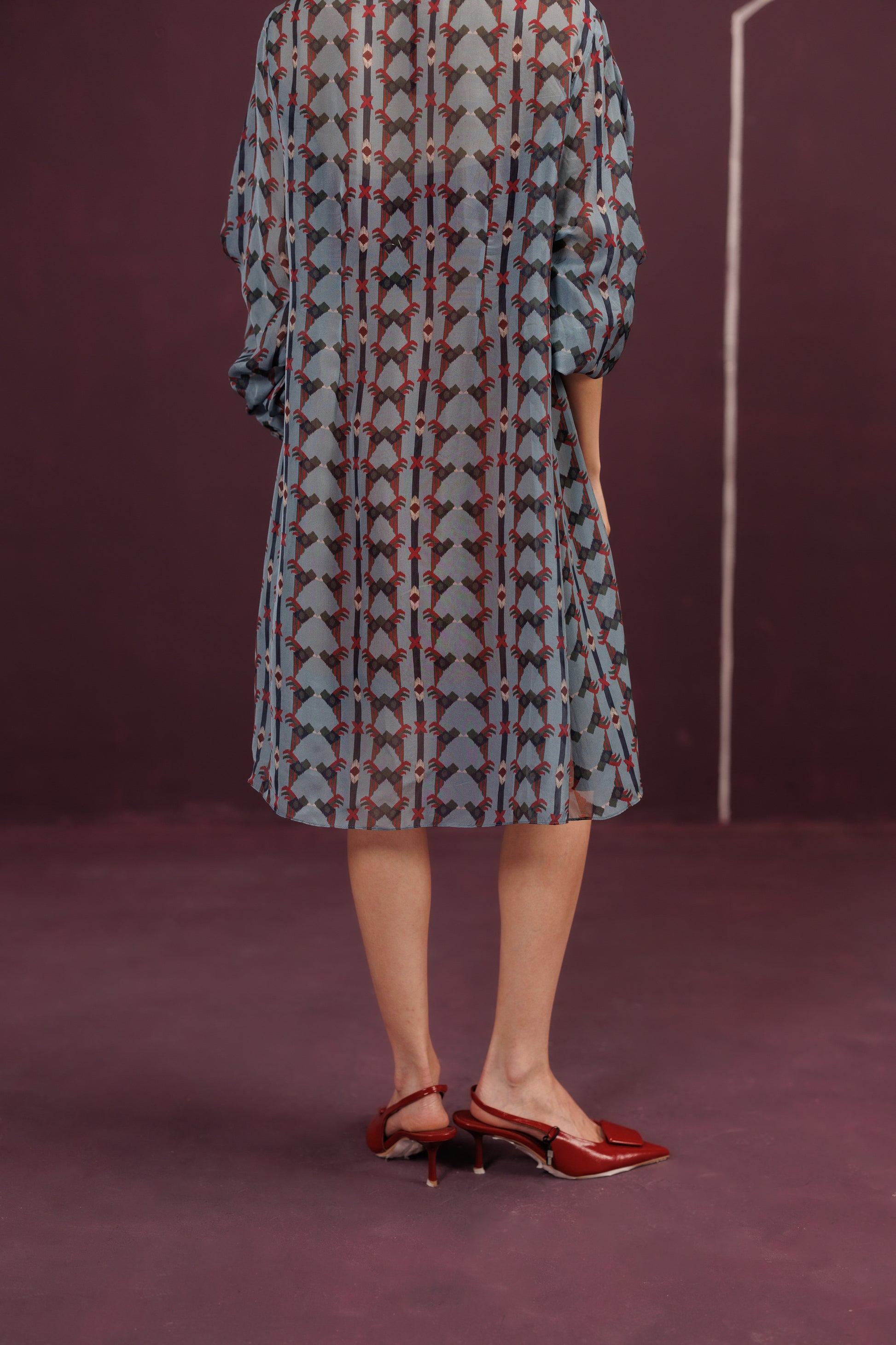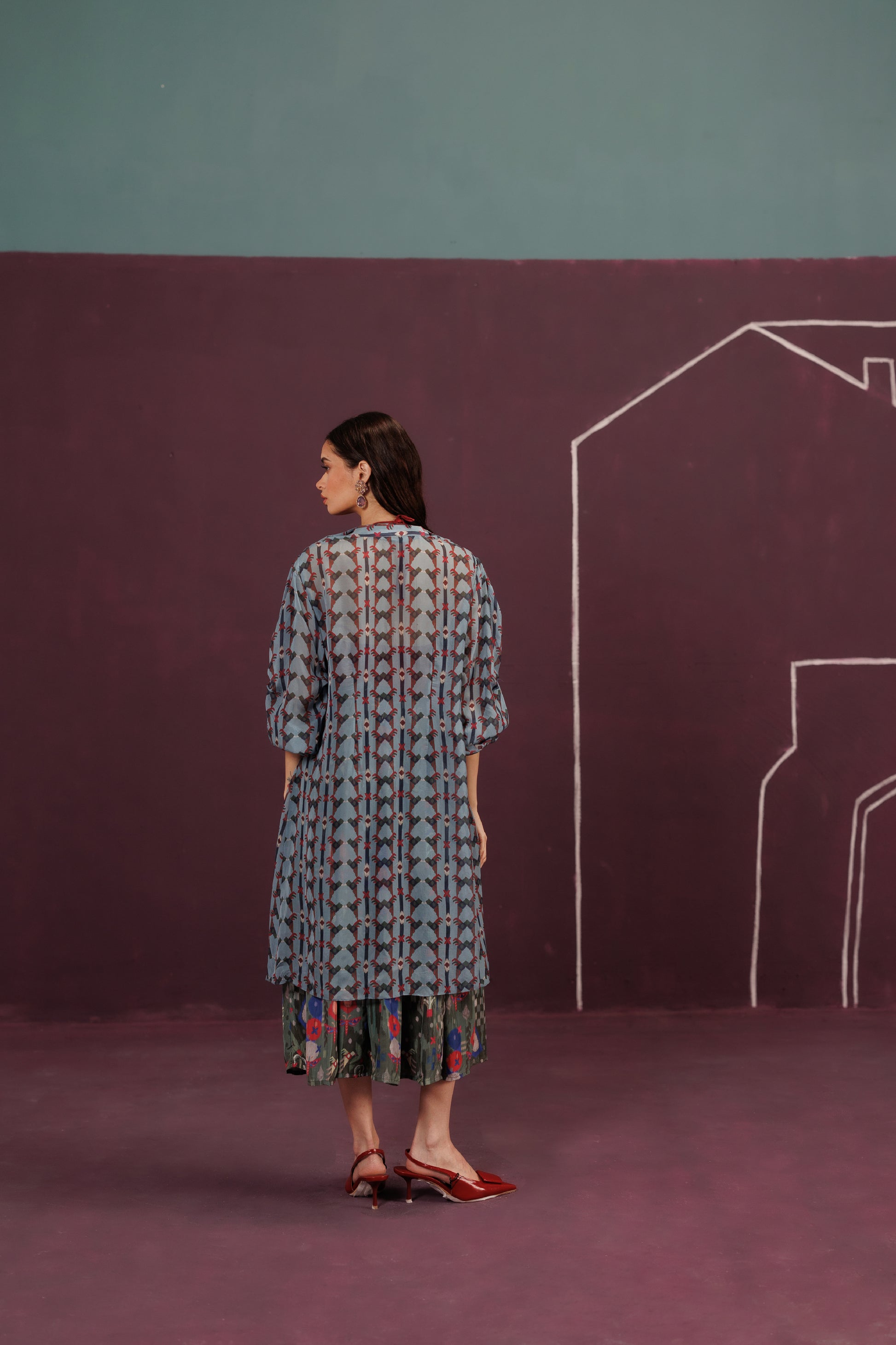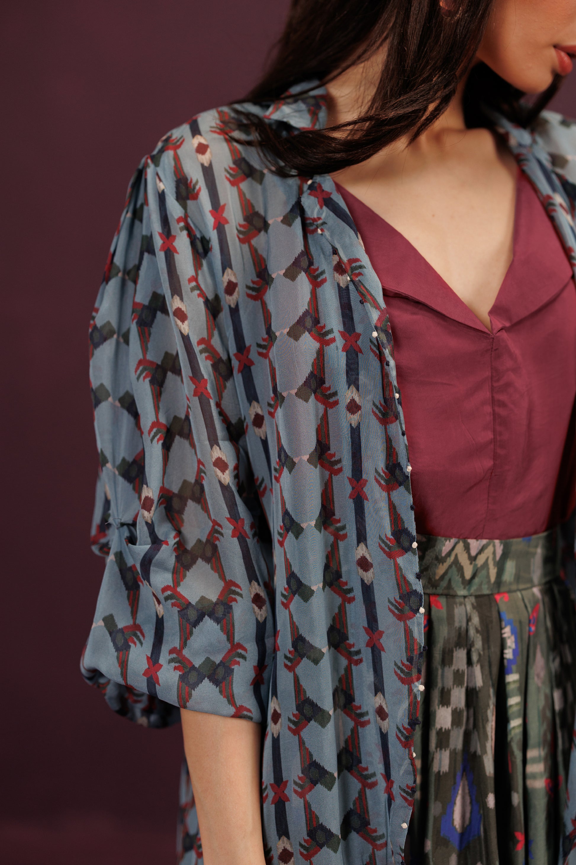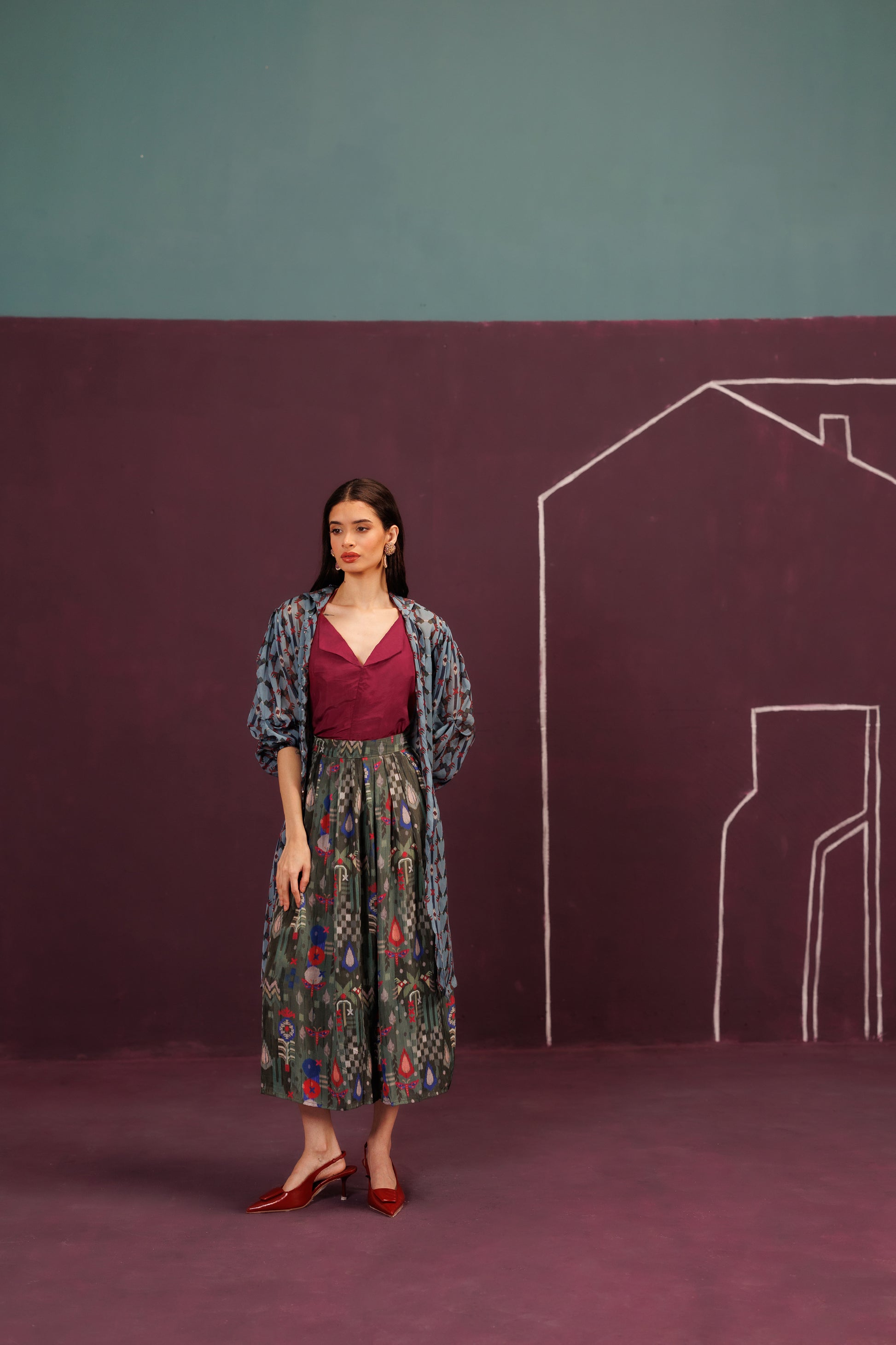 A sumptuous three-piece set that mirrors a celebratory layered cake. The oversized Organza Jacket is the airy, sheer "frosting" holding the shape, while the rust orange base adds the spirited "zest" - a final, delicious construction, complete with a cherry on top.