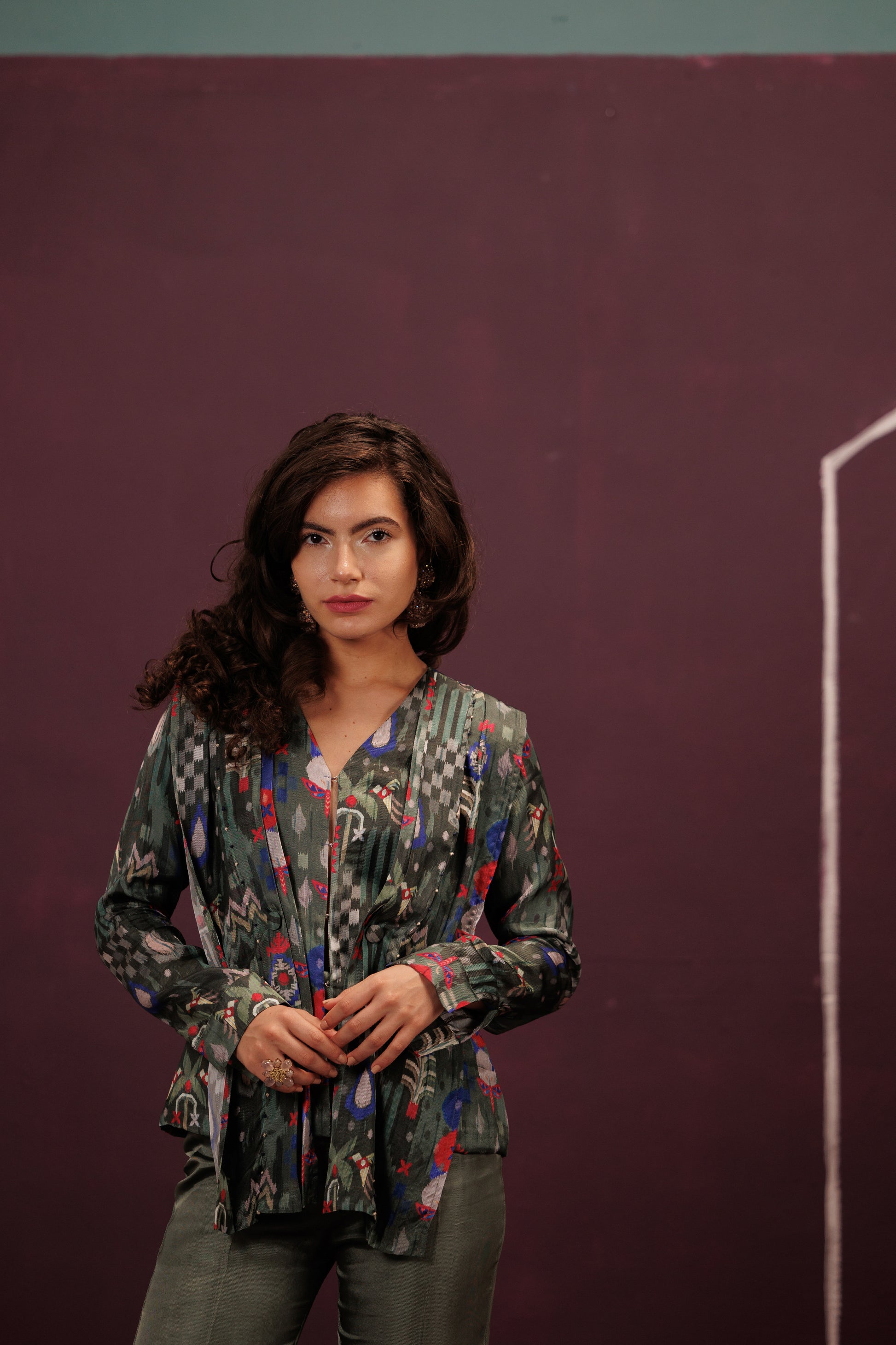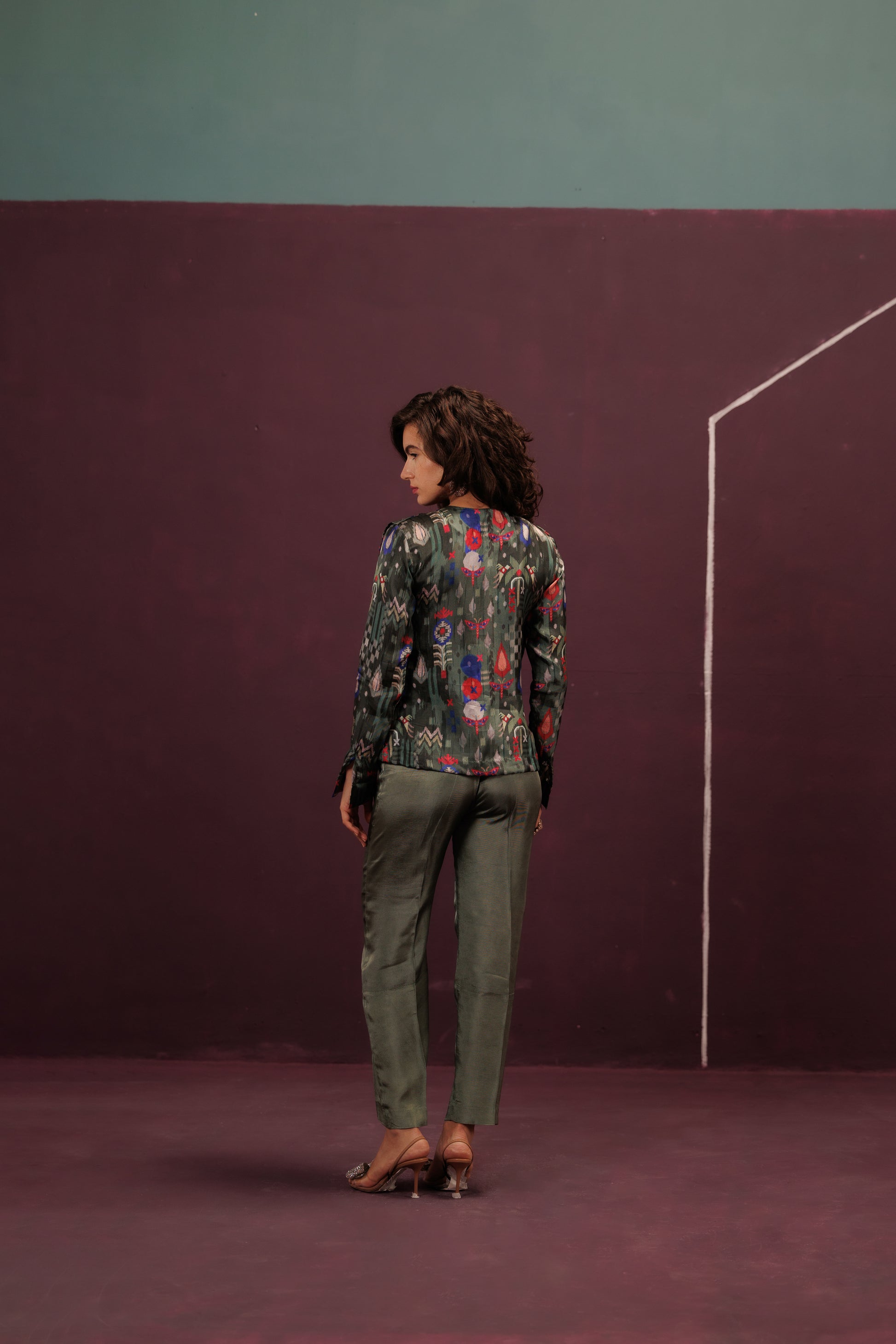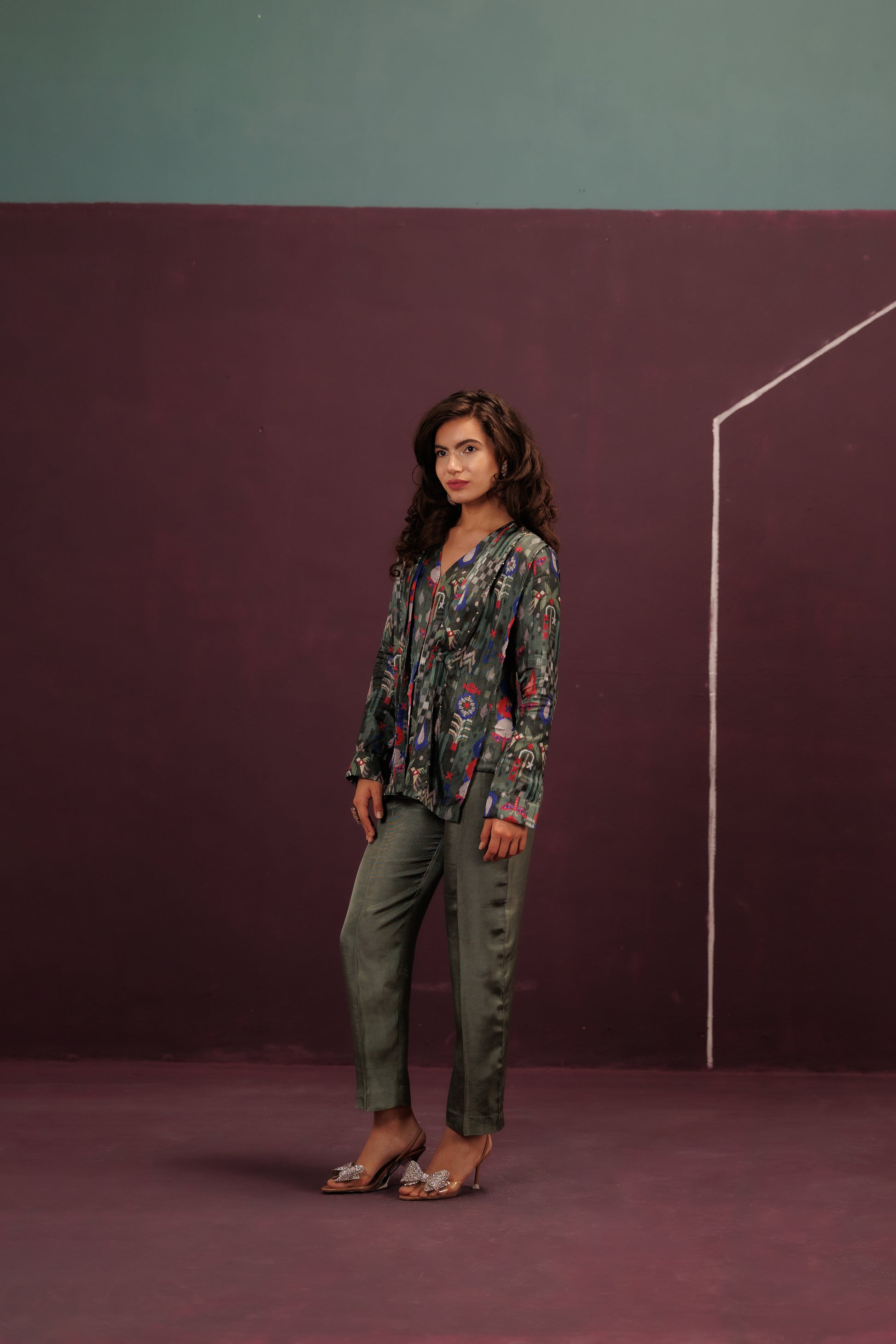 A sophisticated co-ord defined by the Pleated Peplum Top in striking Anasi green. The precise pleats are further detailed with subtle French Knots, acting as tiny periods in the flowing prose, grounded by the solid green trousers.