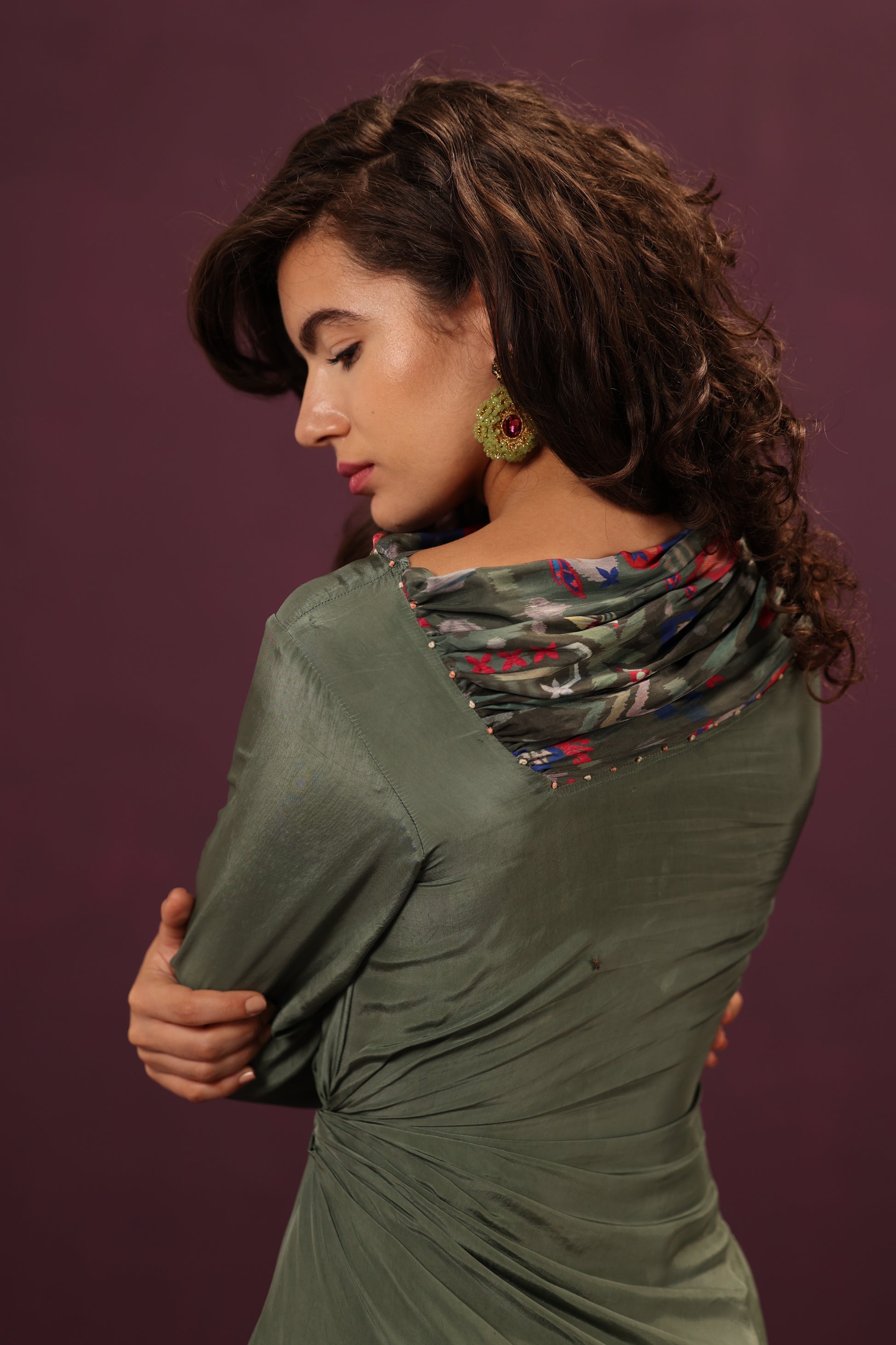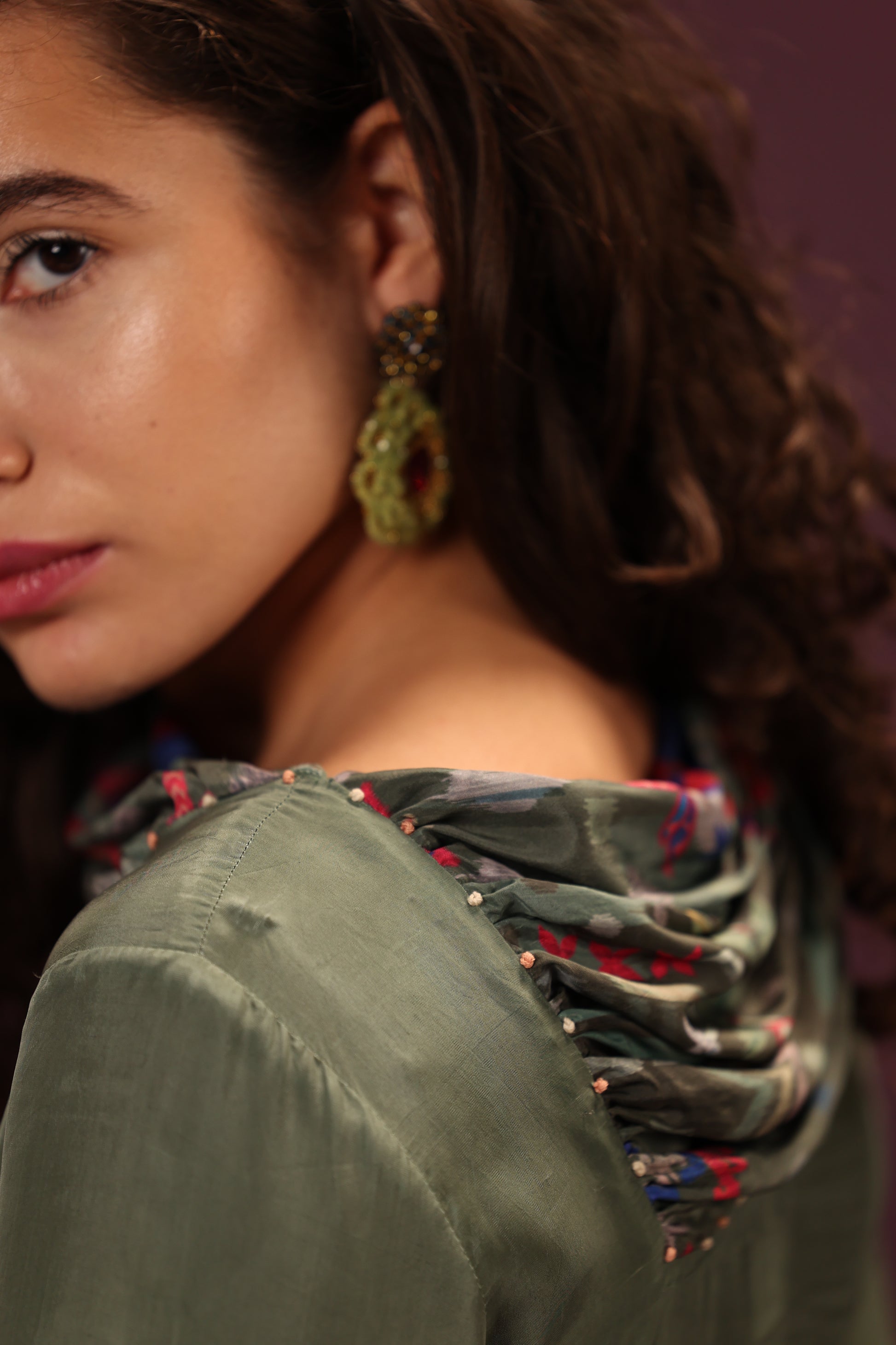 The pineapple motif sits at the neck like a memory she has not fully admitted to, framed by a reversed collar in habutai silk. The olive green solid body cinches at the waist, part secrecy and part posture, as if the dress is composing itself before speaking.