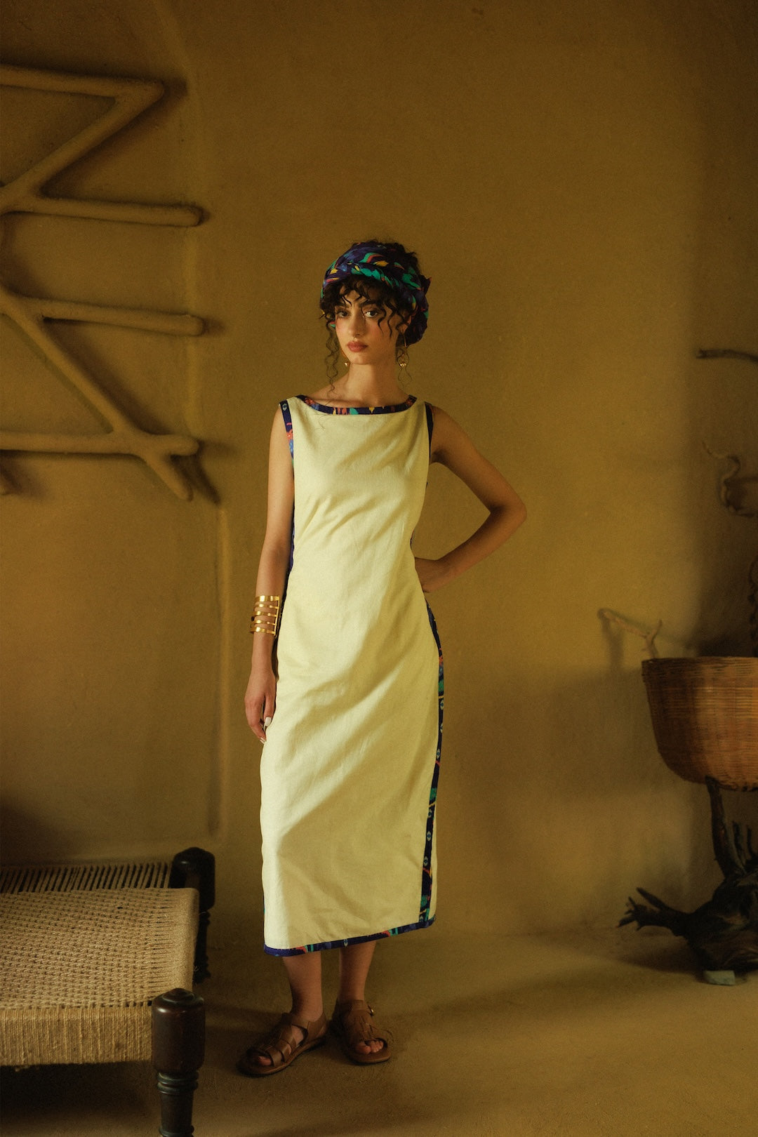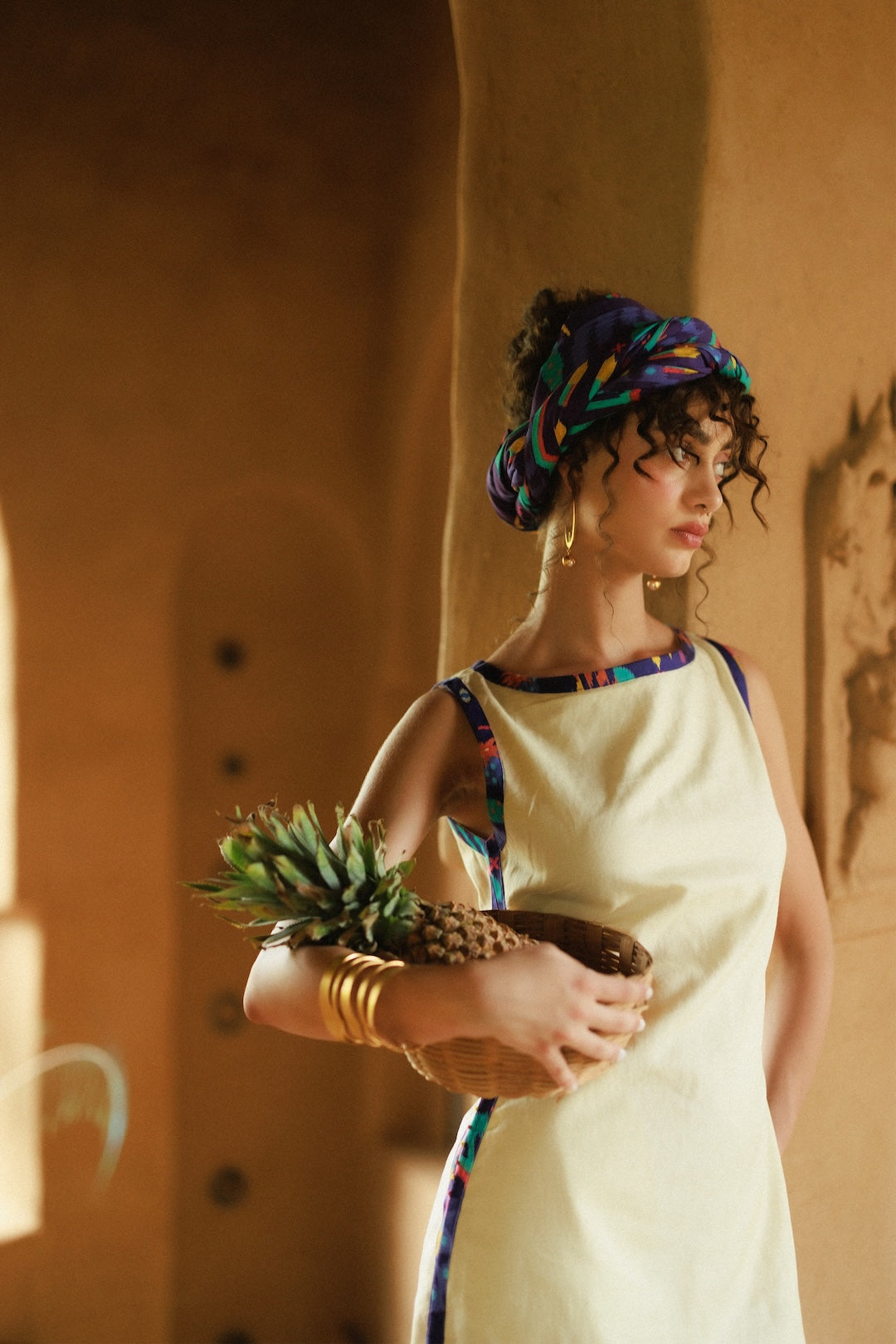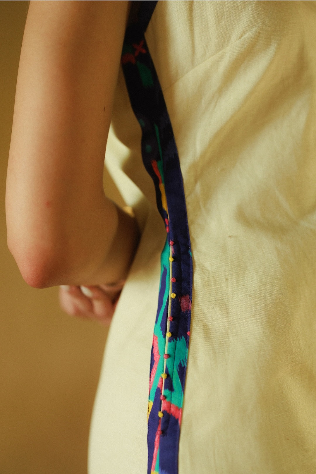 A solid butter yellow sheath that keeps its story inside — the poppy print lining hides like a pressed flower in a letter.