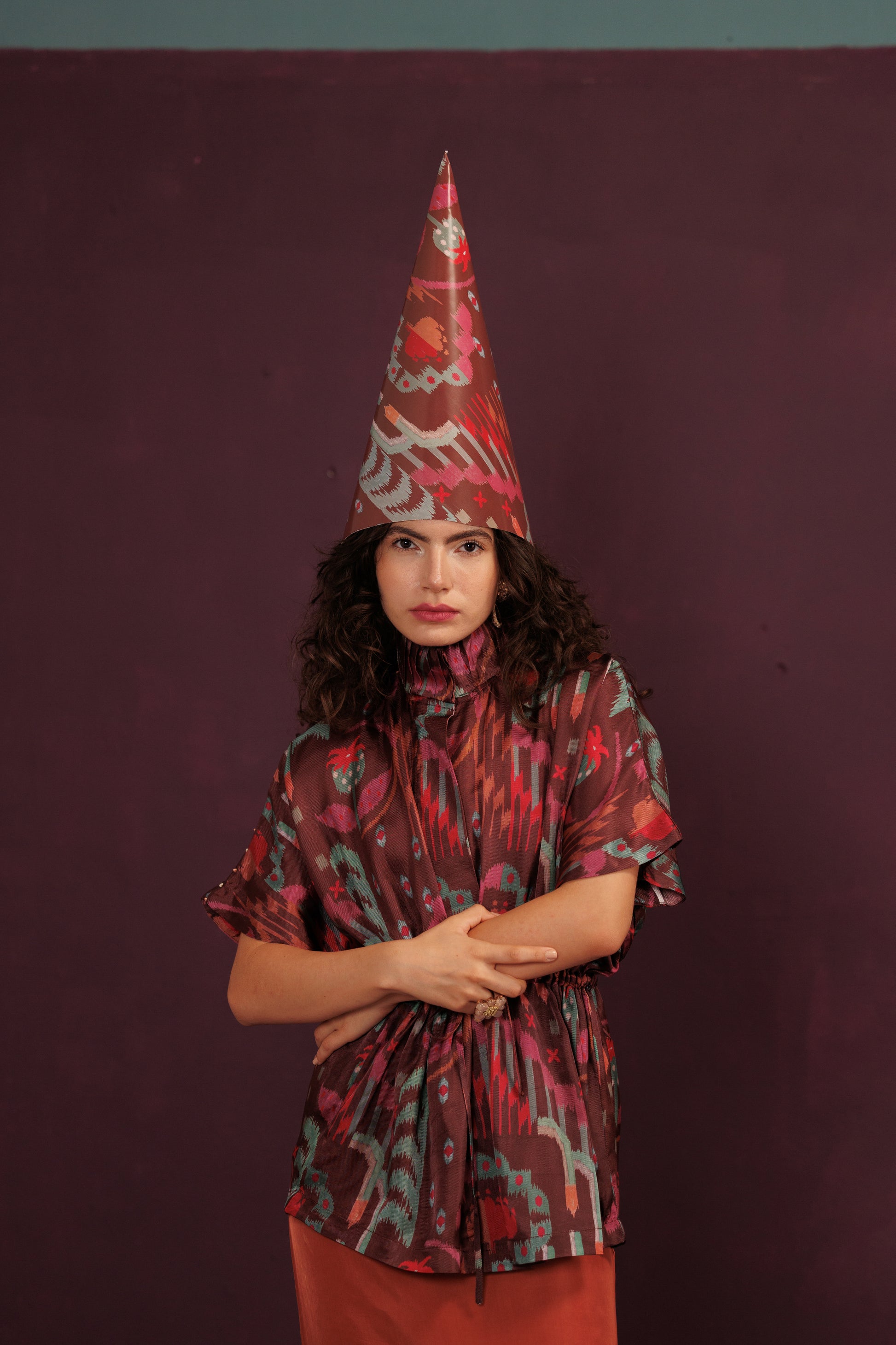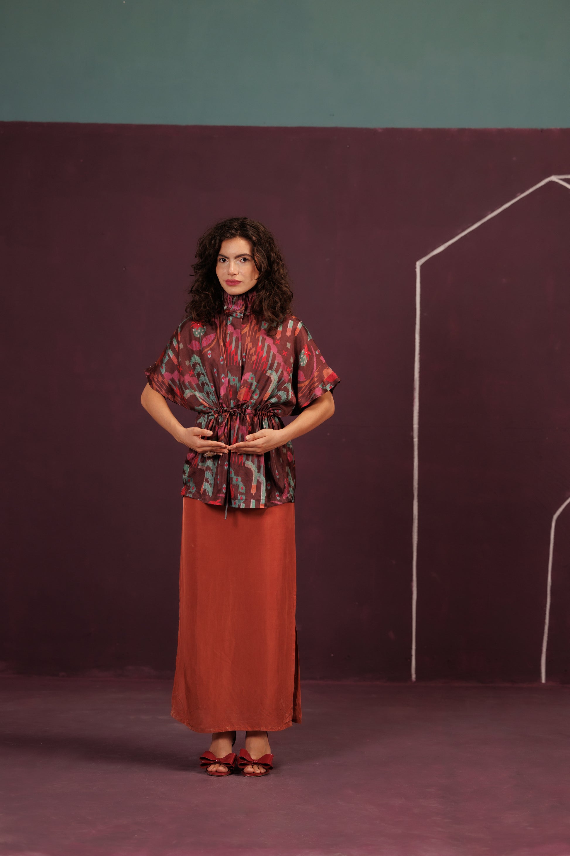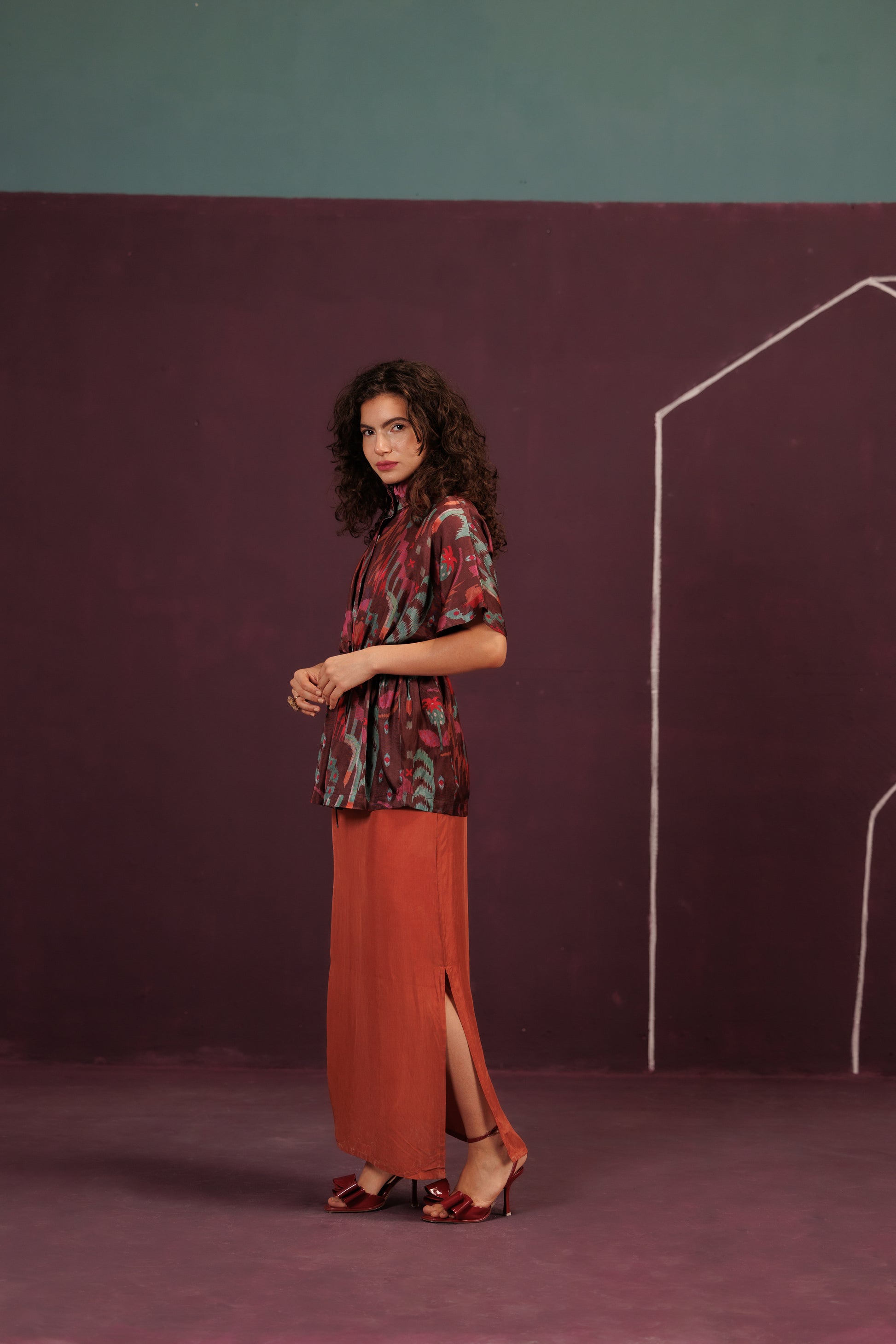 A layered, two-piece ensemble. The statement peplum jacket overlays a warm, Rust Orange Slip Dress. This set is the vivid, nostalgic memory of the poppy fields, where a deep fall hue provides a rich foundation for the print of the past.
