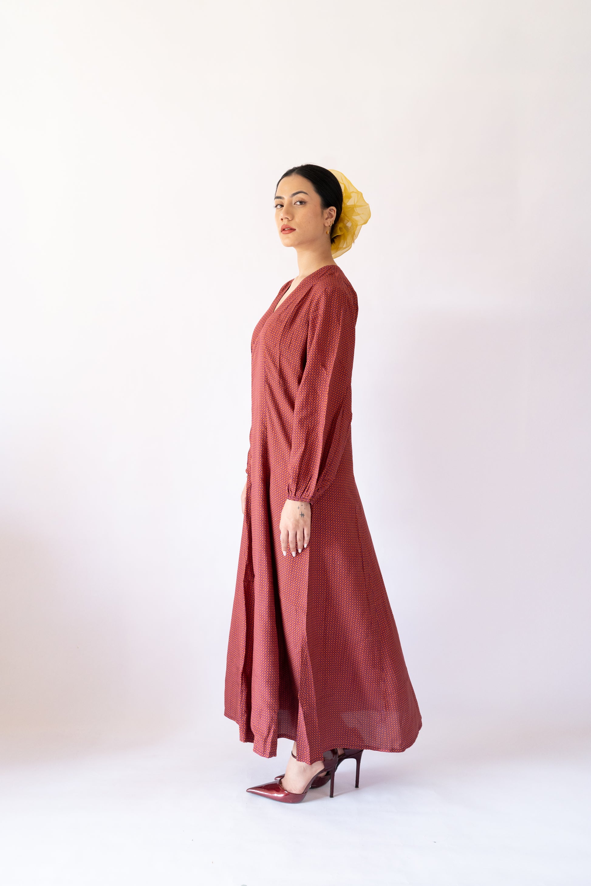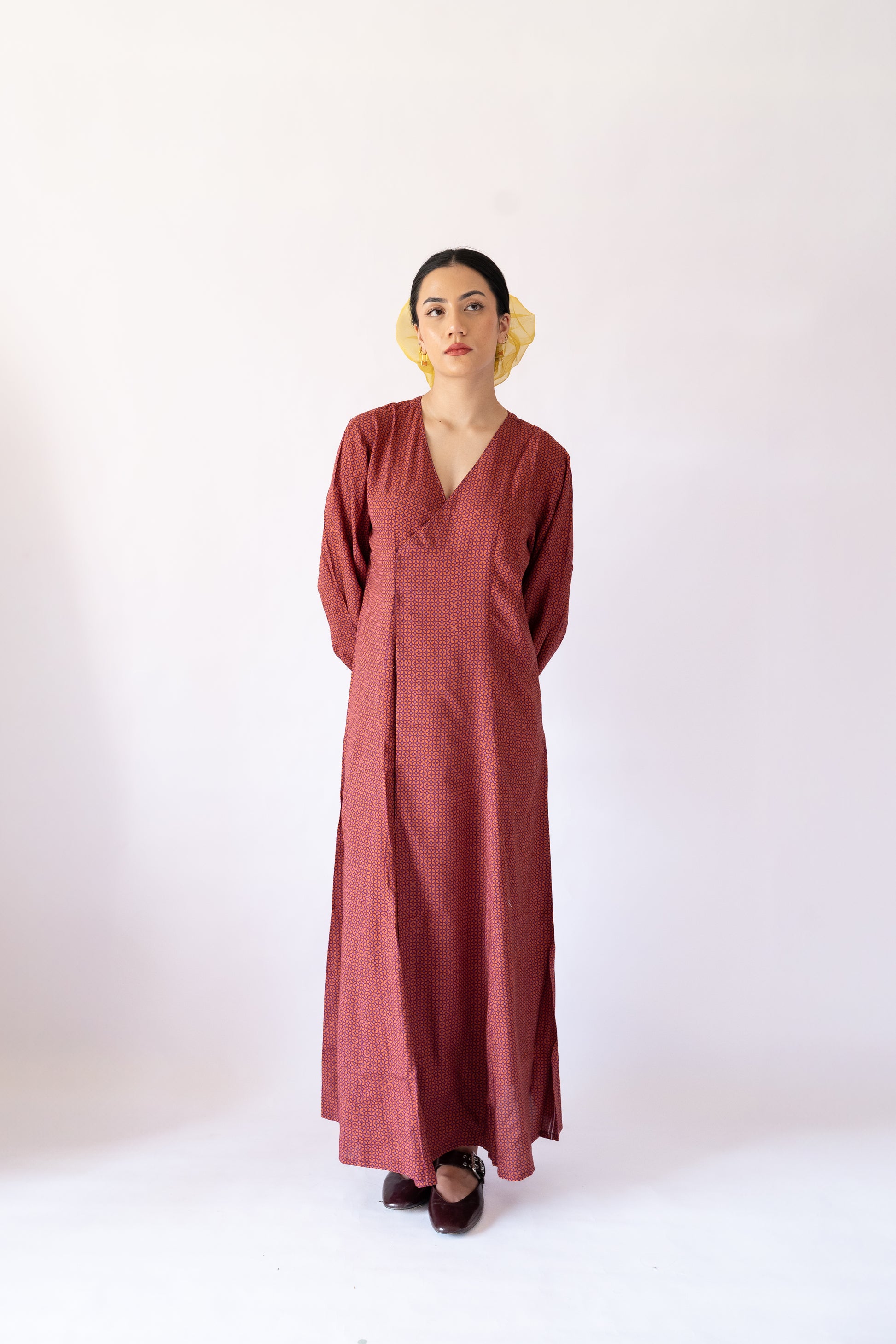 The Spice Reverie Midi is a poetic blend of structure and fluidity. Cut from sustainably sourced lyocell, this all-over printed dress in a rich spice-wine hue features a wrap-style front that accentuates the waist. Its voluminous balloon sleeves add a touch of drama, while the midi length and soft fabric ensure ease of movement.