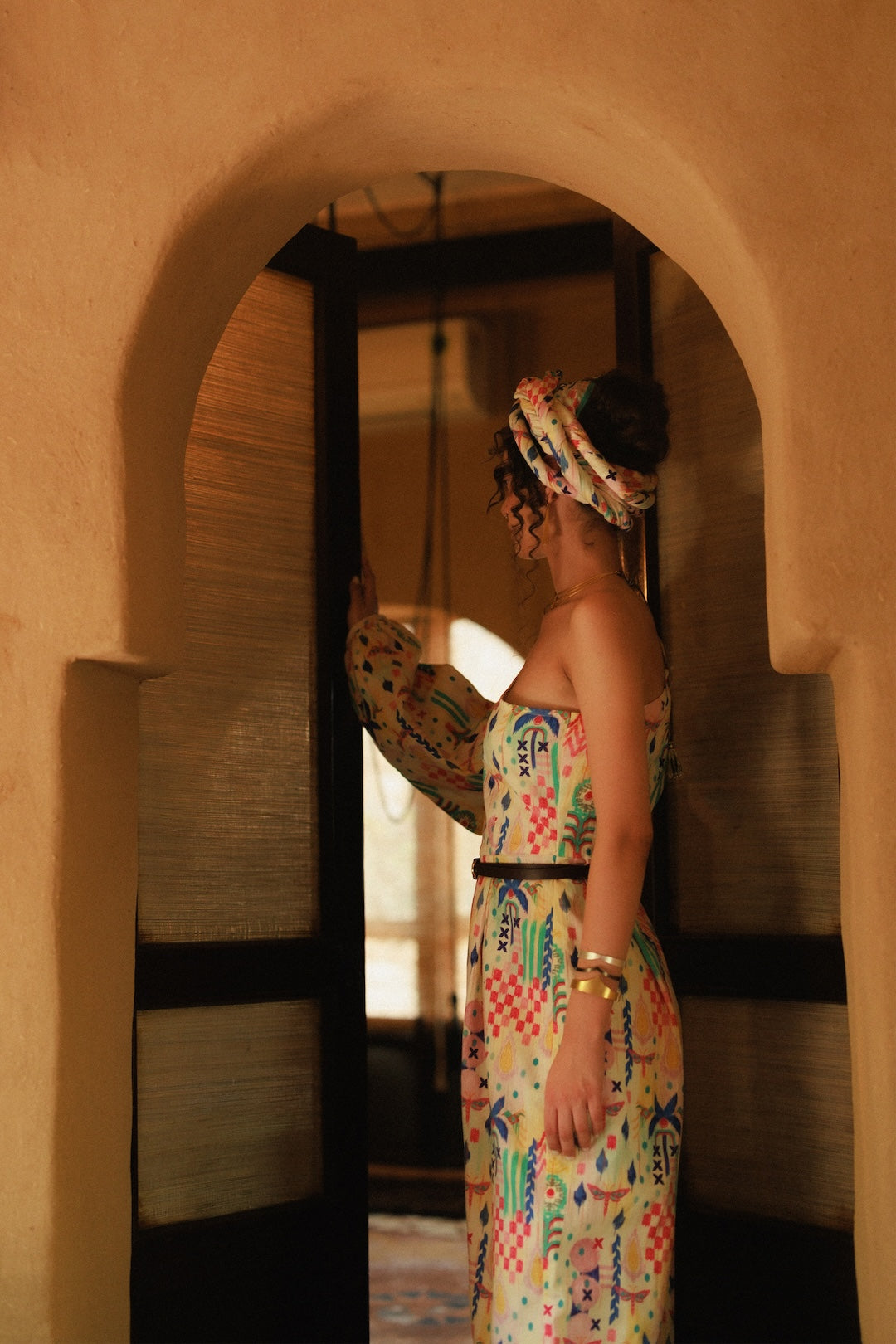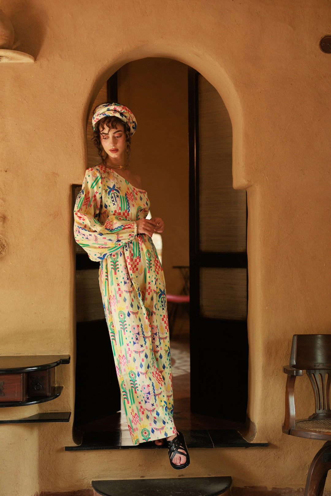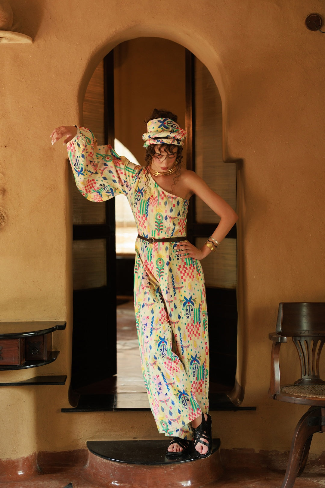 Golden and asymmetrical, this anasi-printed jumpsuit glows like your skin after too long in the sun.