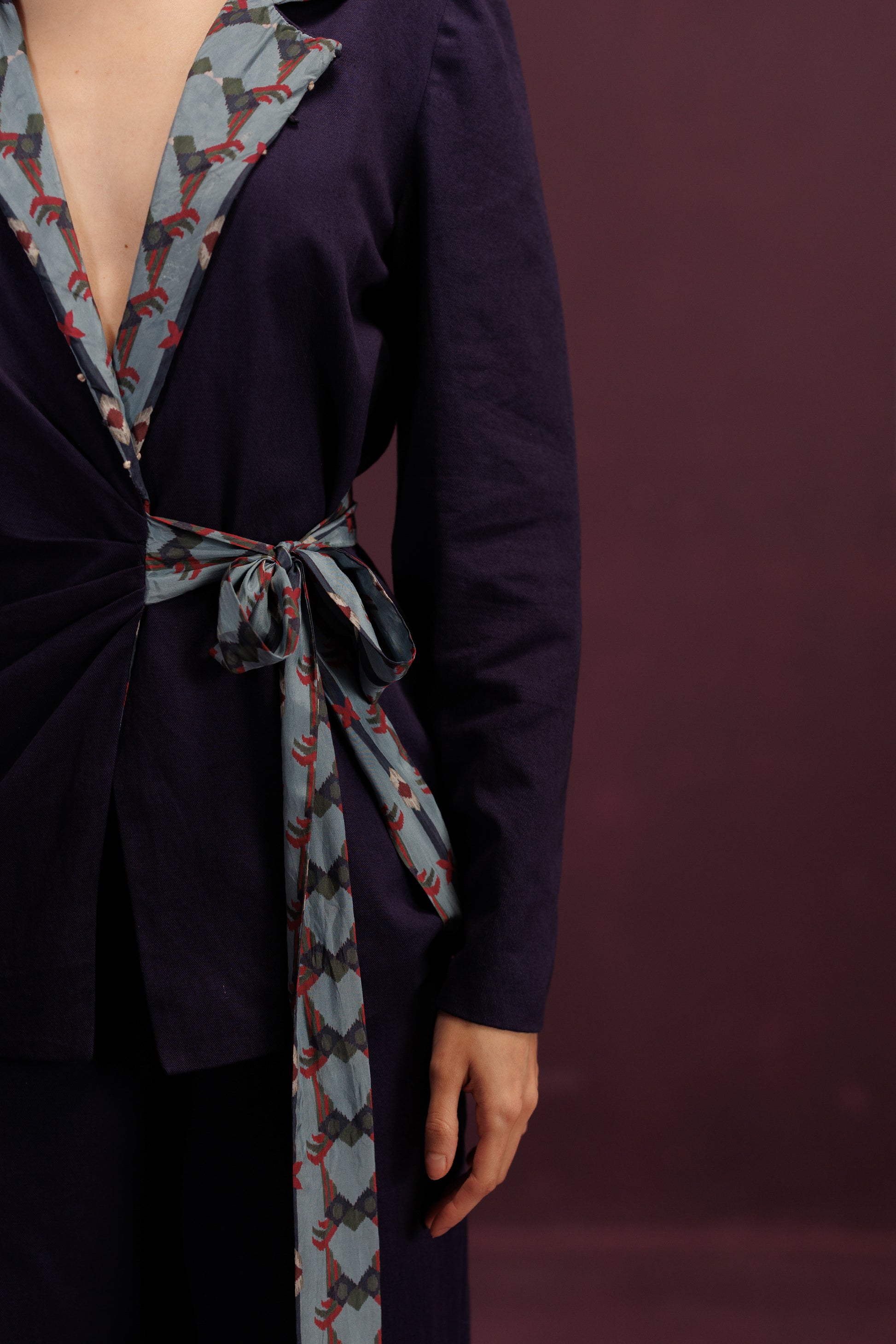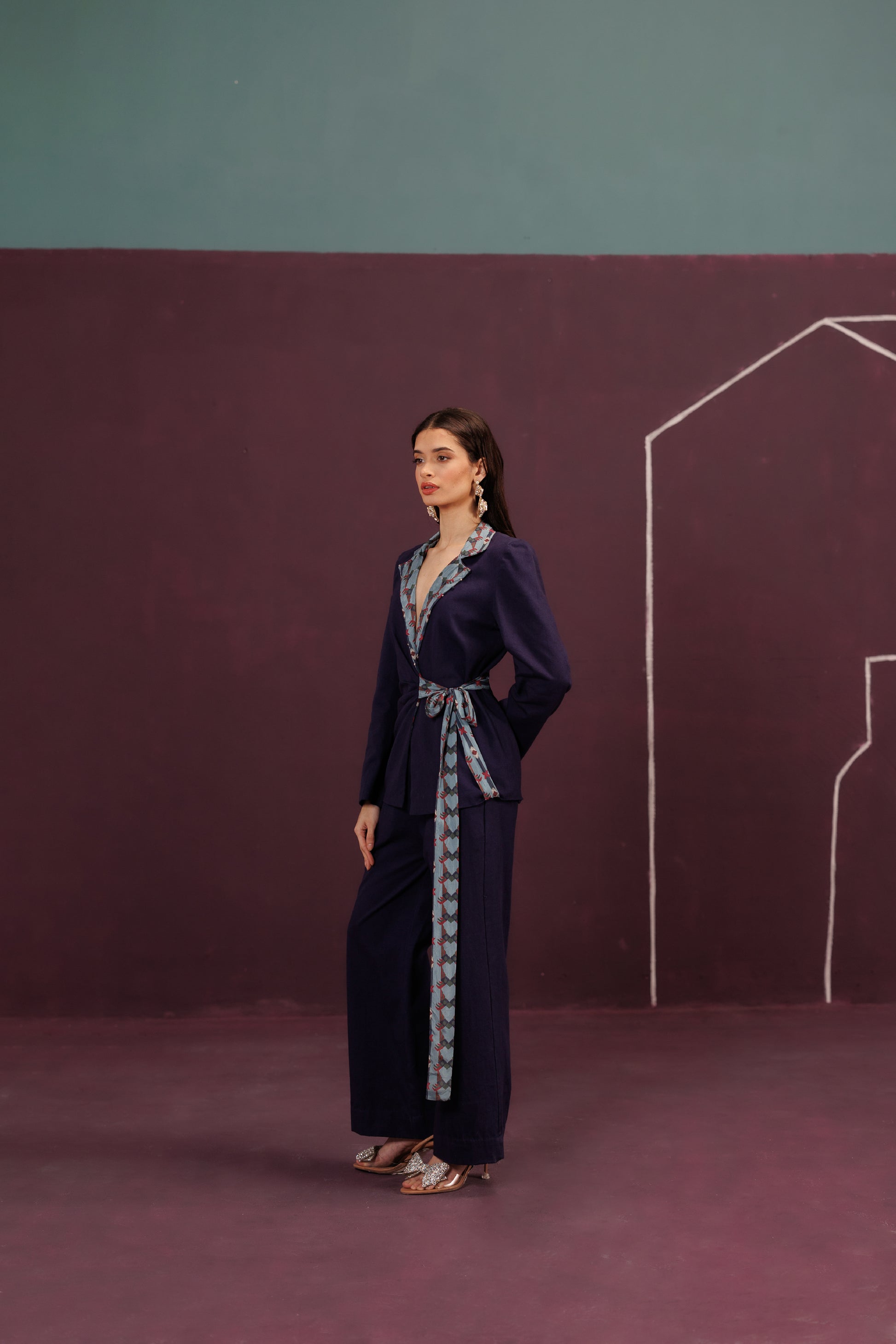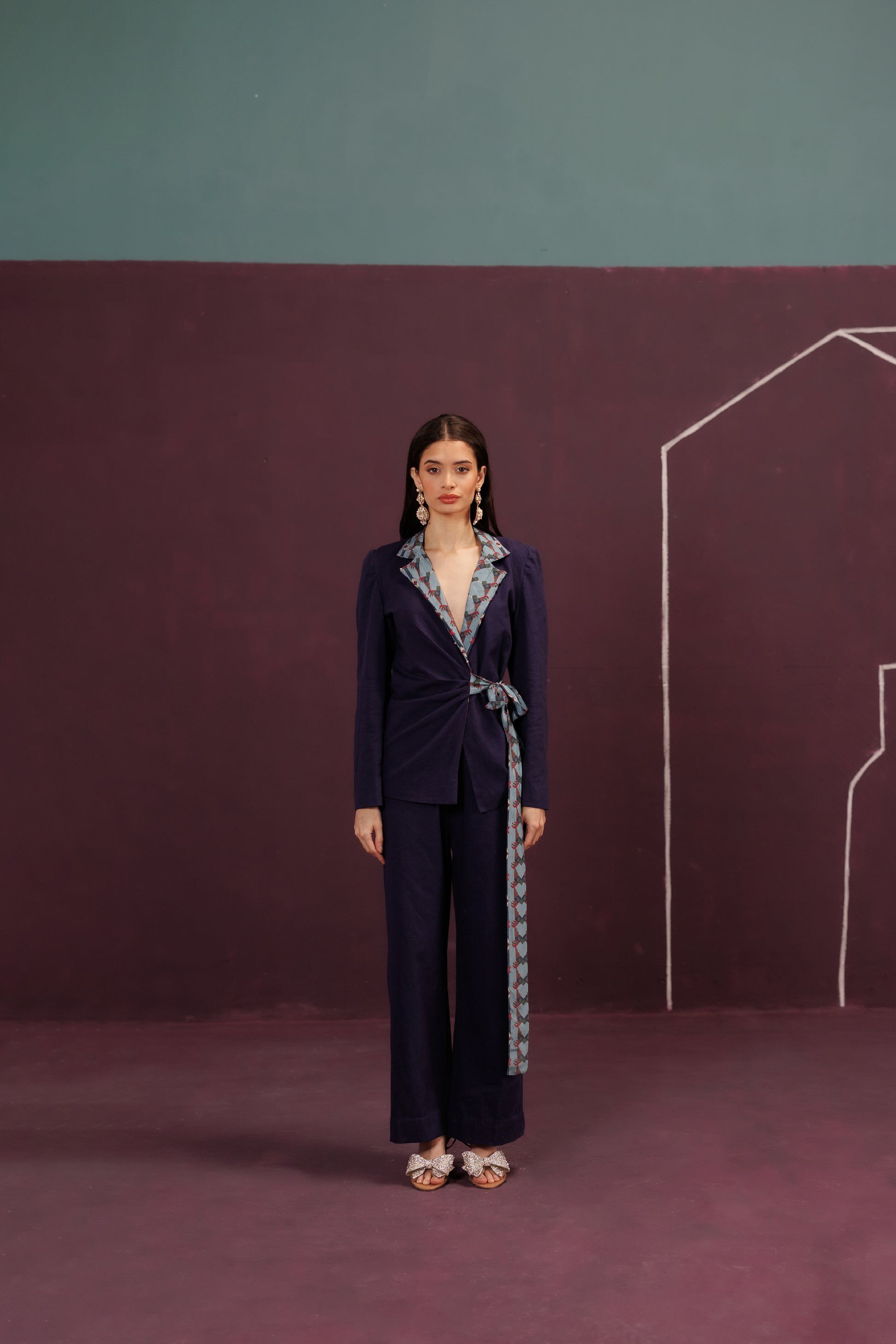 A structured co-ord of Blazer and Pant in Cotton Twill and Silk. The tie-up closure is the ribbon of an unopened gift, the promise of a joyful celebration, cinched tight with anticipation.