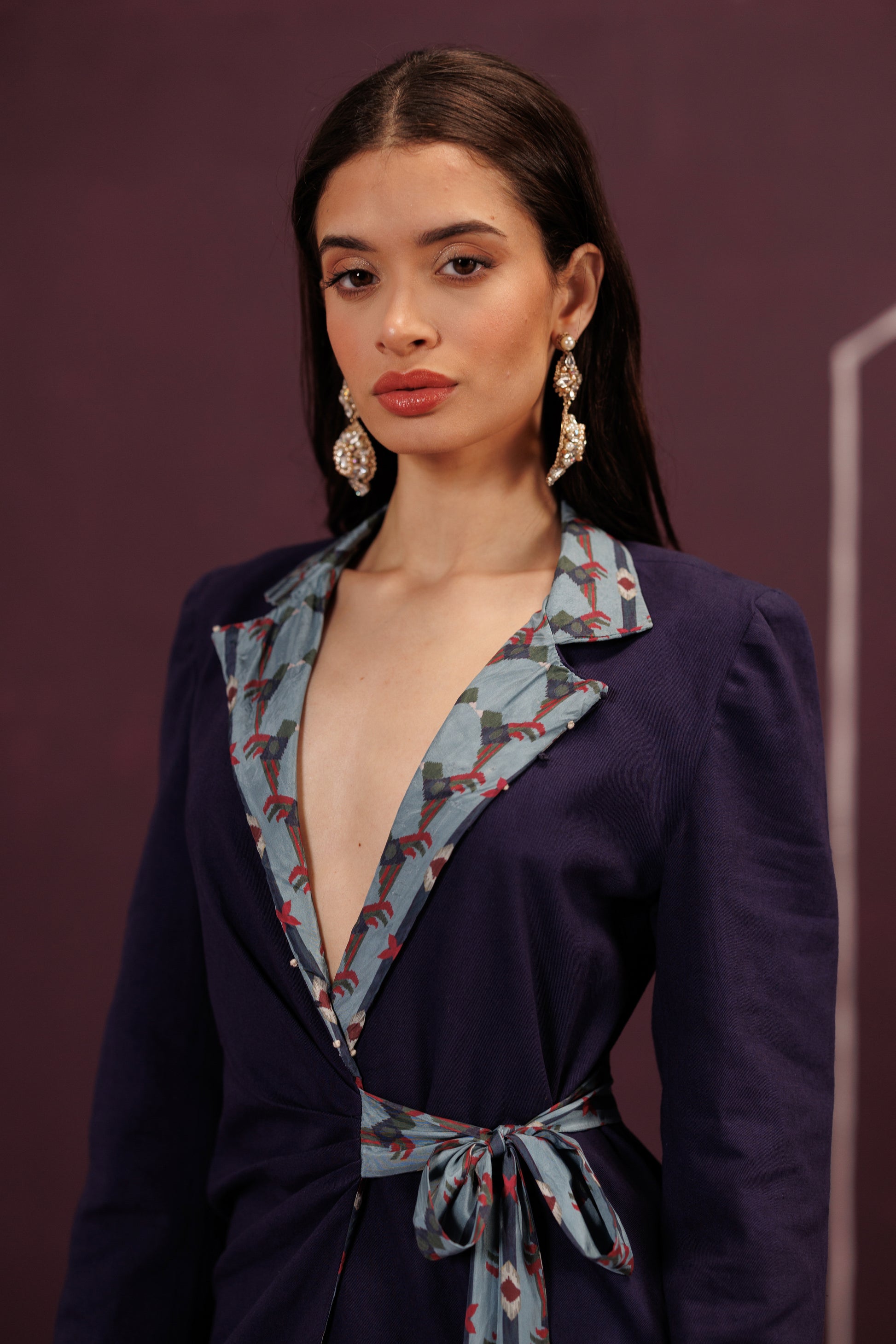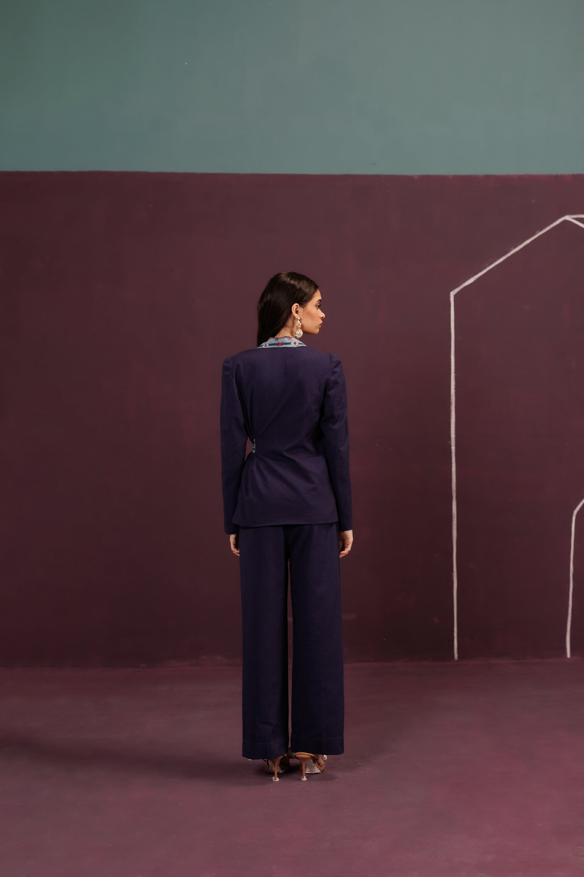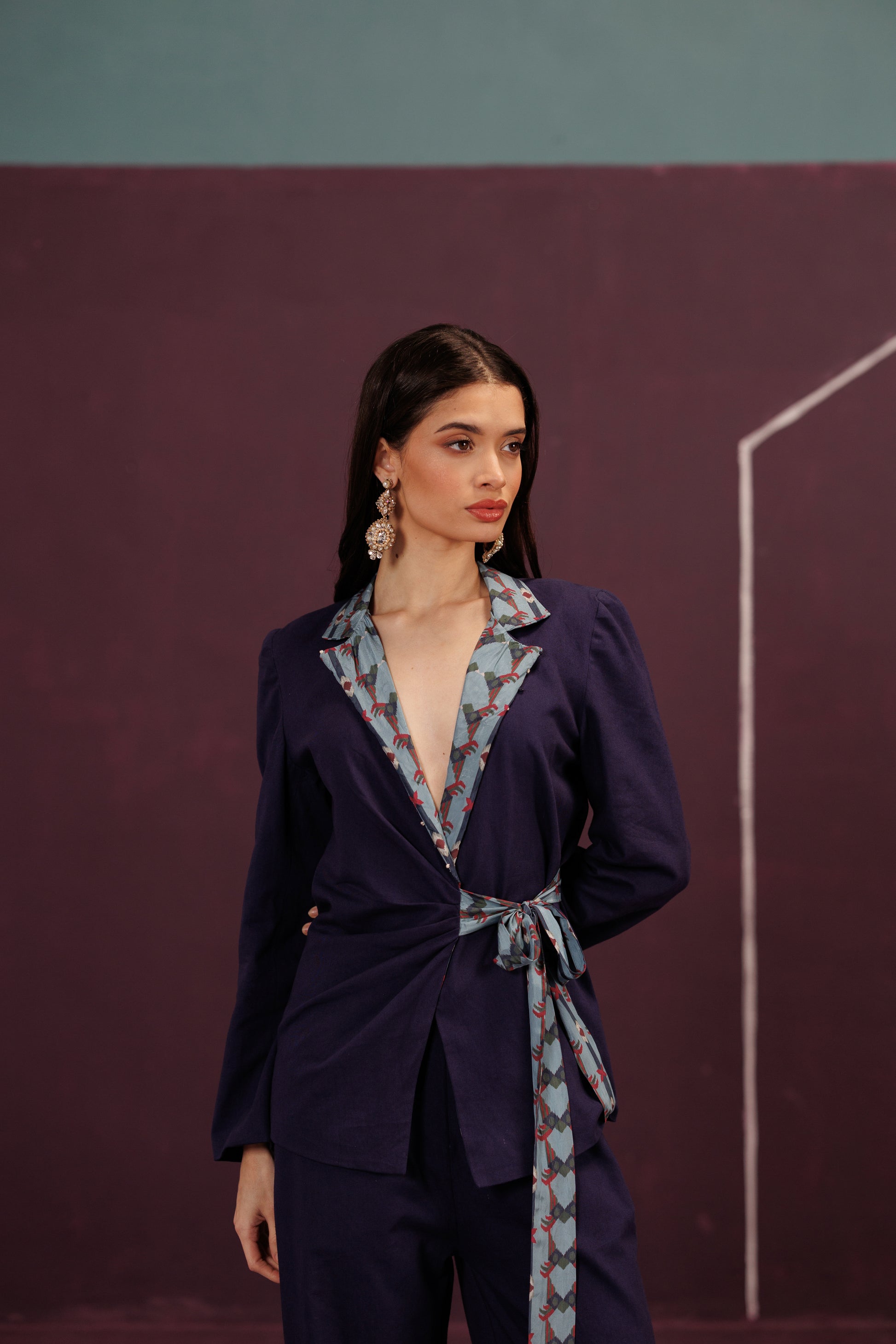 A structured co-ord of Blazer and Pant in Cotton Twill and Silk. The tie-up closure is the ribbon of an unopened gift, the promise of a joyful celebration, cinched tight with anticipation.