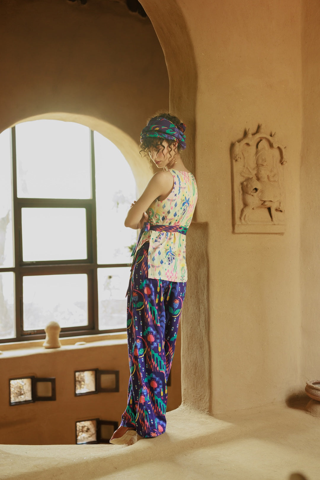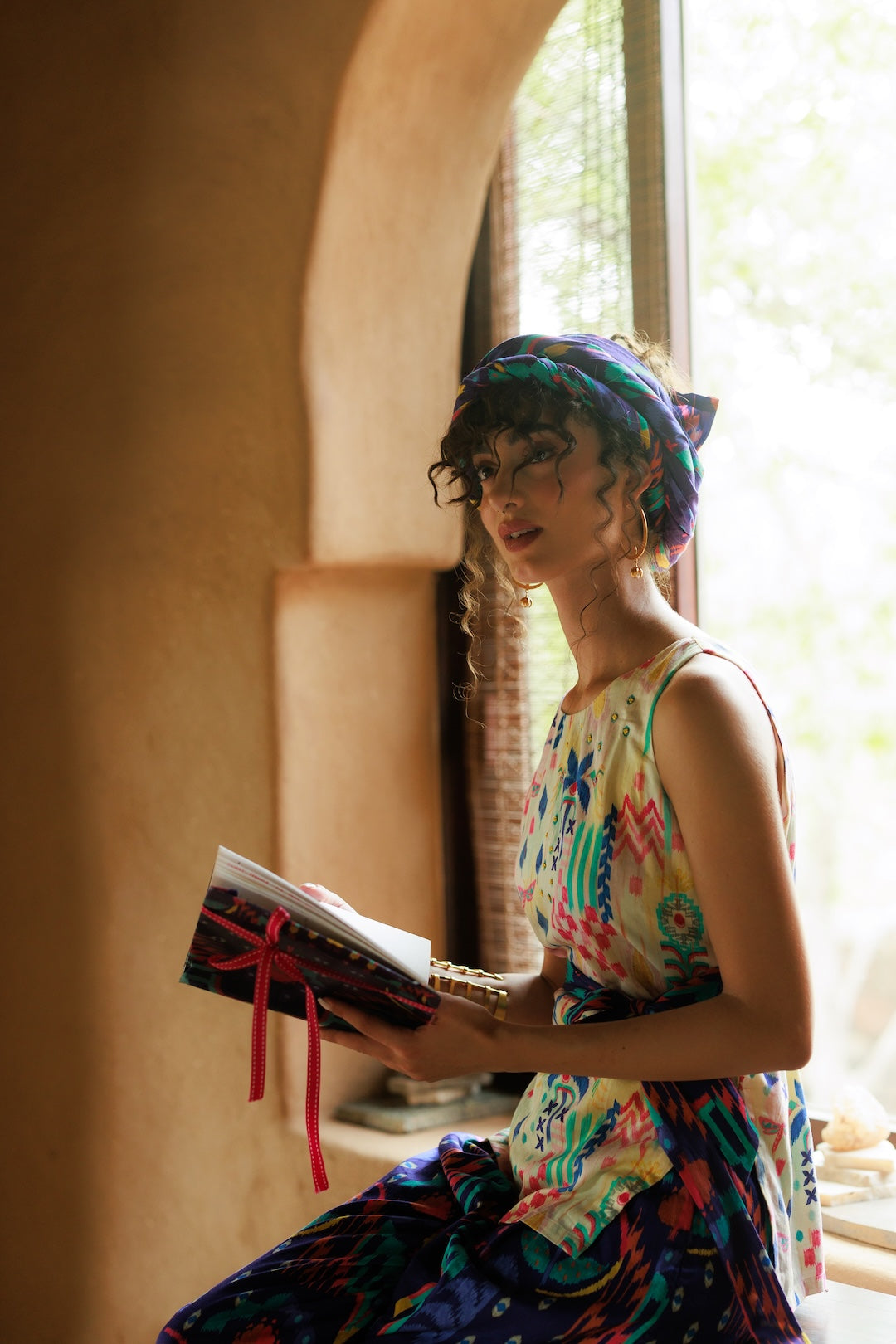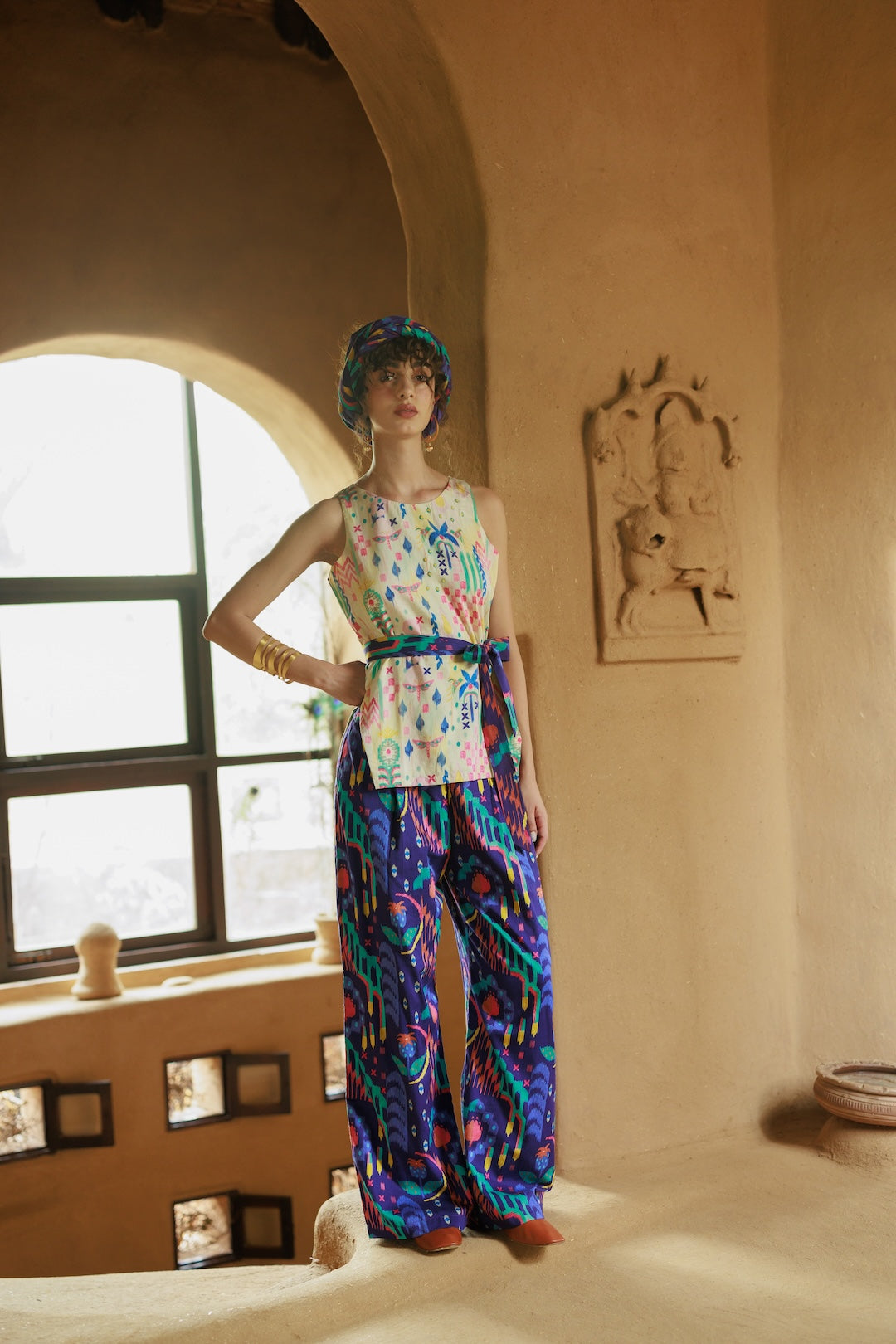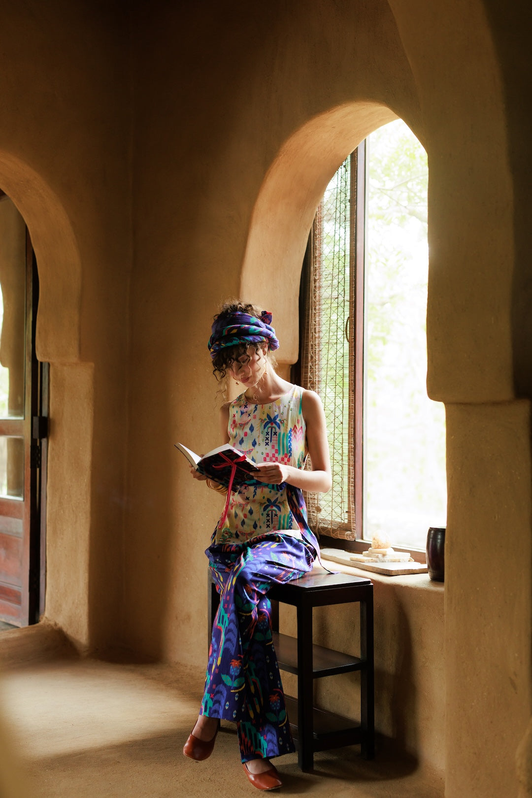 Two prints, one memory — this cotton satin set blends juicy pineapple and soft poppy motifs for those moody, mango-sticky days. The top ties in contrast, with french knots blooming on the bust — like juice drops on a white shirt.